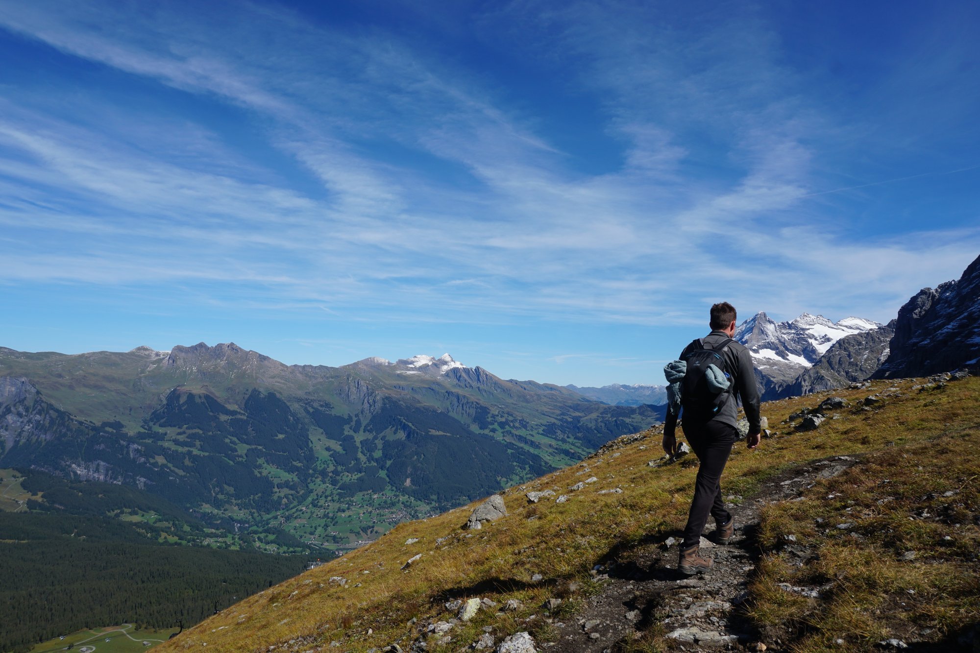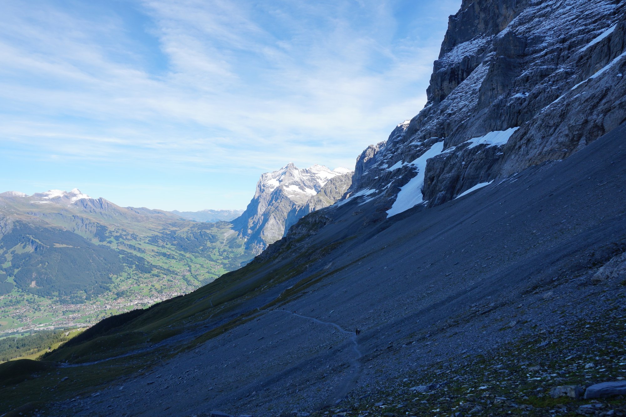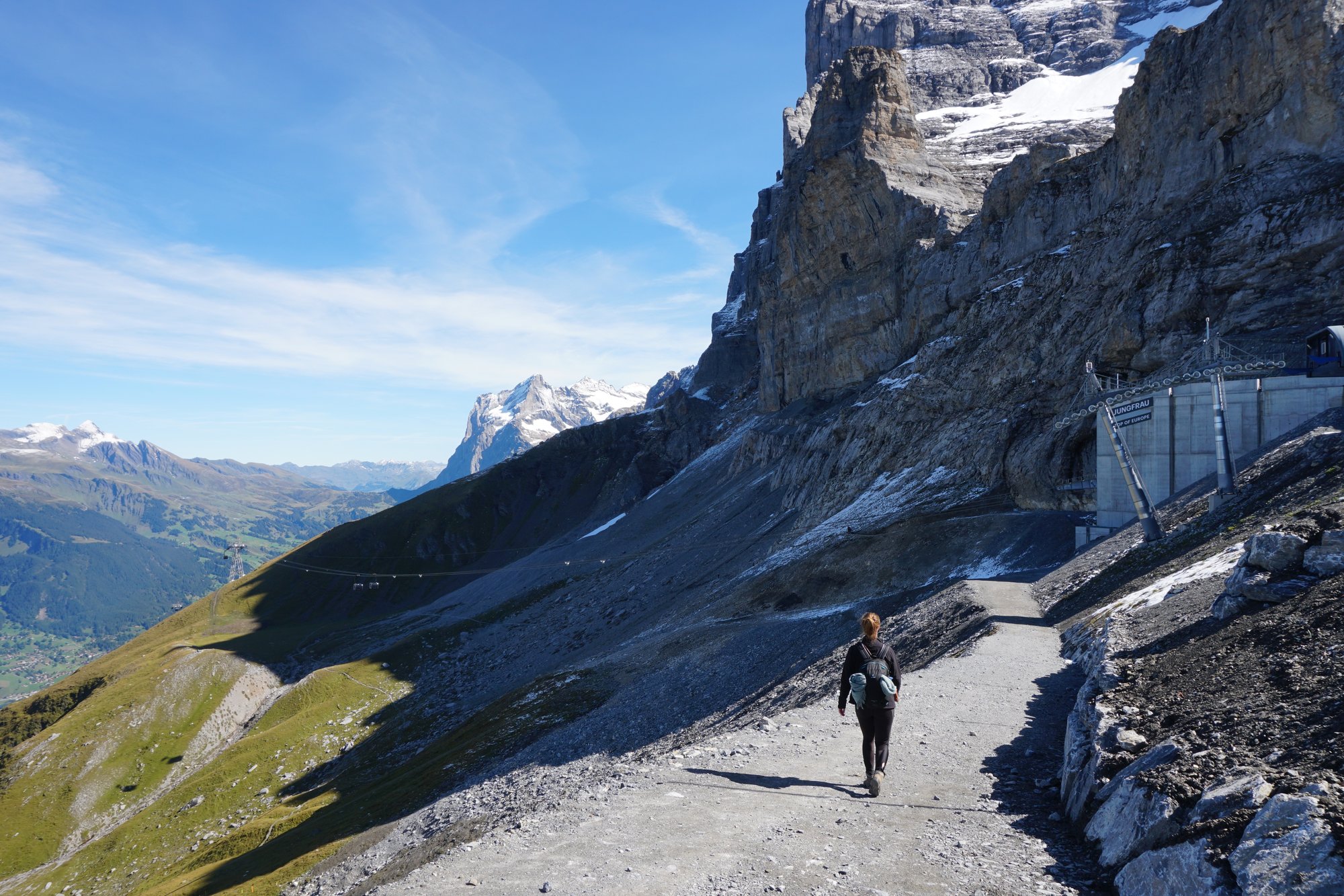 Na een paar kilometer en ontelbaar veel stops om dit natuurschoon in ons op te nemen, is het tijd voor de echte afdaling. We verlaten het pad langs de Eiger en moeten nu zigzaggend flink afdalen naar het treinstation Alpiglen. Dit is het enige deel van de hike waar je fysiek wat meer inspanning moet leveren en het na verloop van tijd weleens zou kunnen voelen in je knieën en tenen. Voordeel is dat we nu wel in het zonnetje lopen! :-)