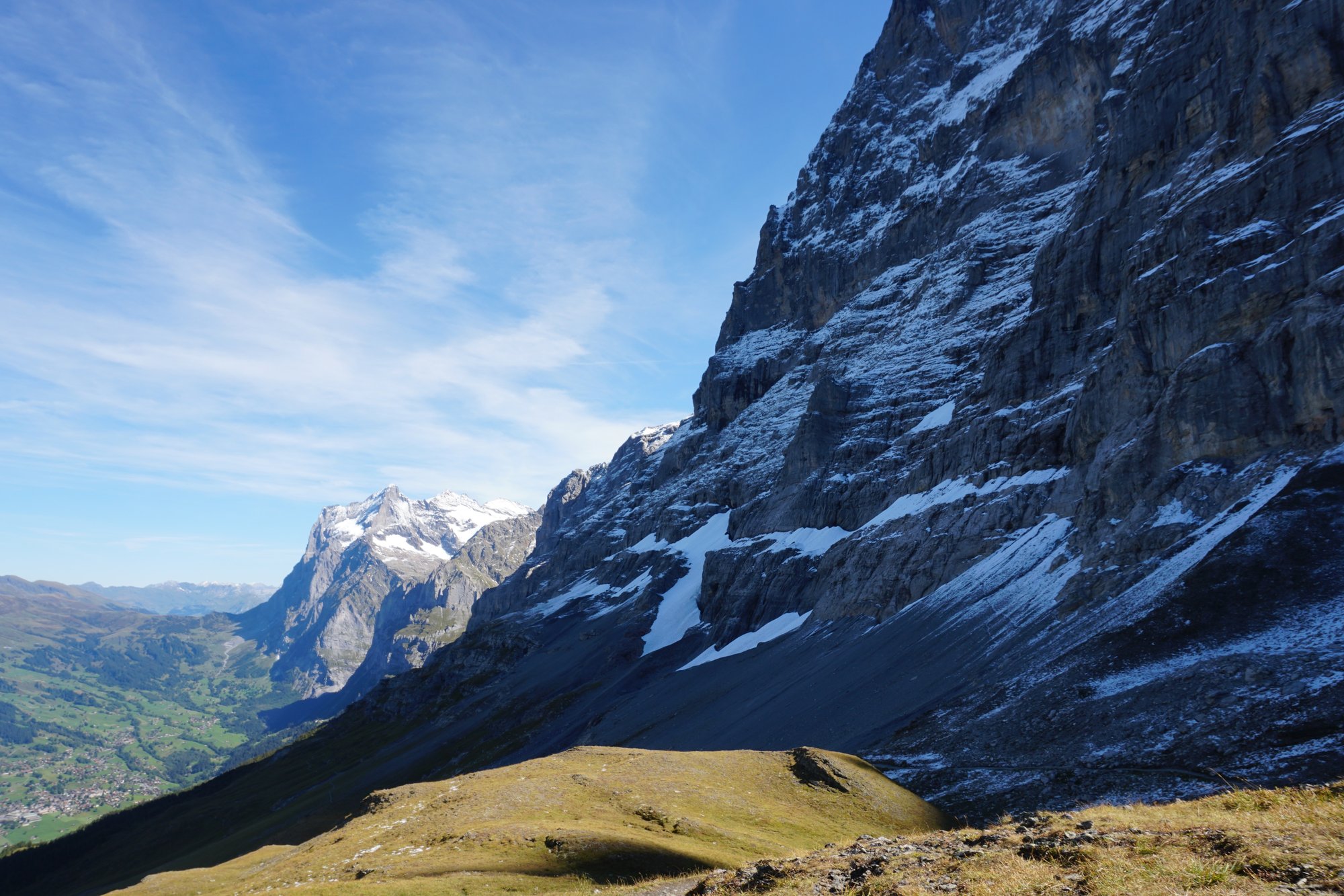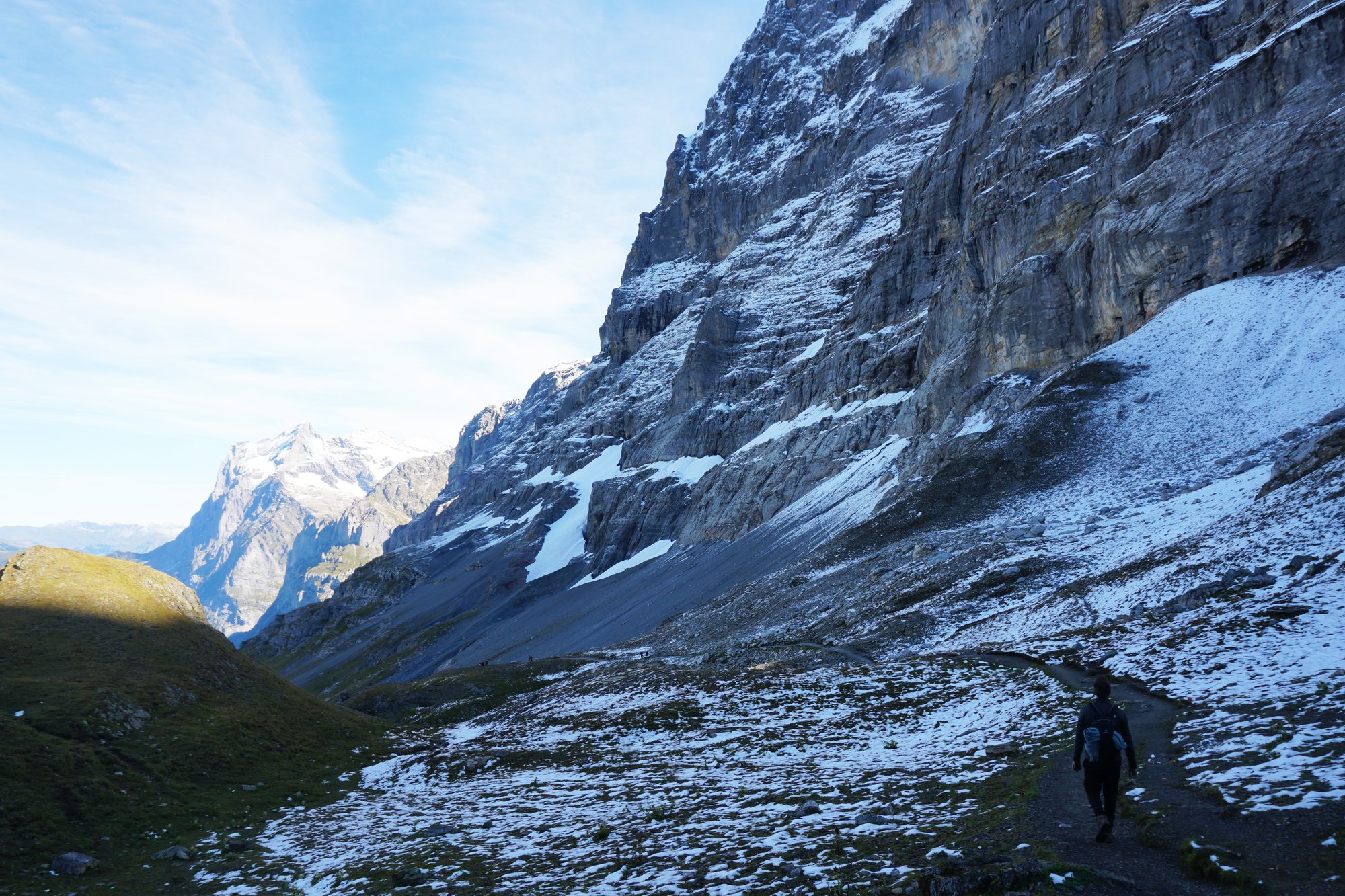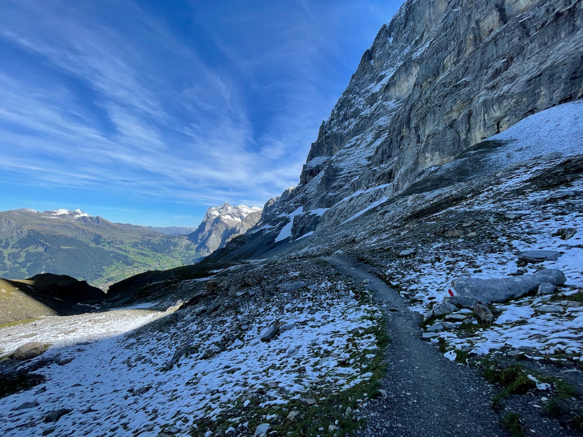 Ook de zon komt niet zomaar over deze bergwand heen en daardoor lopen we het grootste deel van de hike in de schaduw. Op deze hoogte is dat best fris, dus kleed je warm aan als je zelf de Eiger Trail gaat lopen. Op sommige stukjes ligt zelfs sneeuw. ;-)