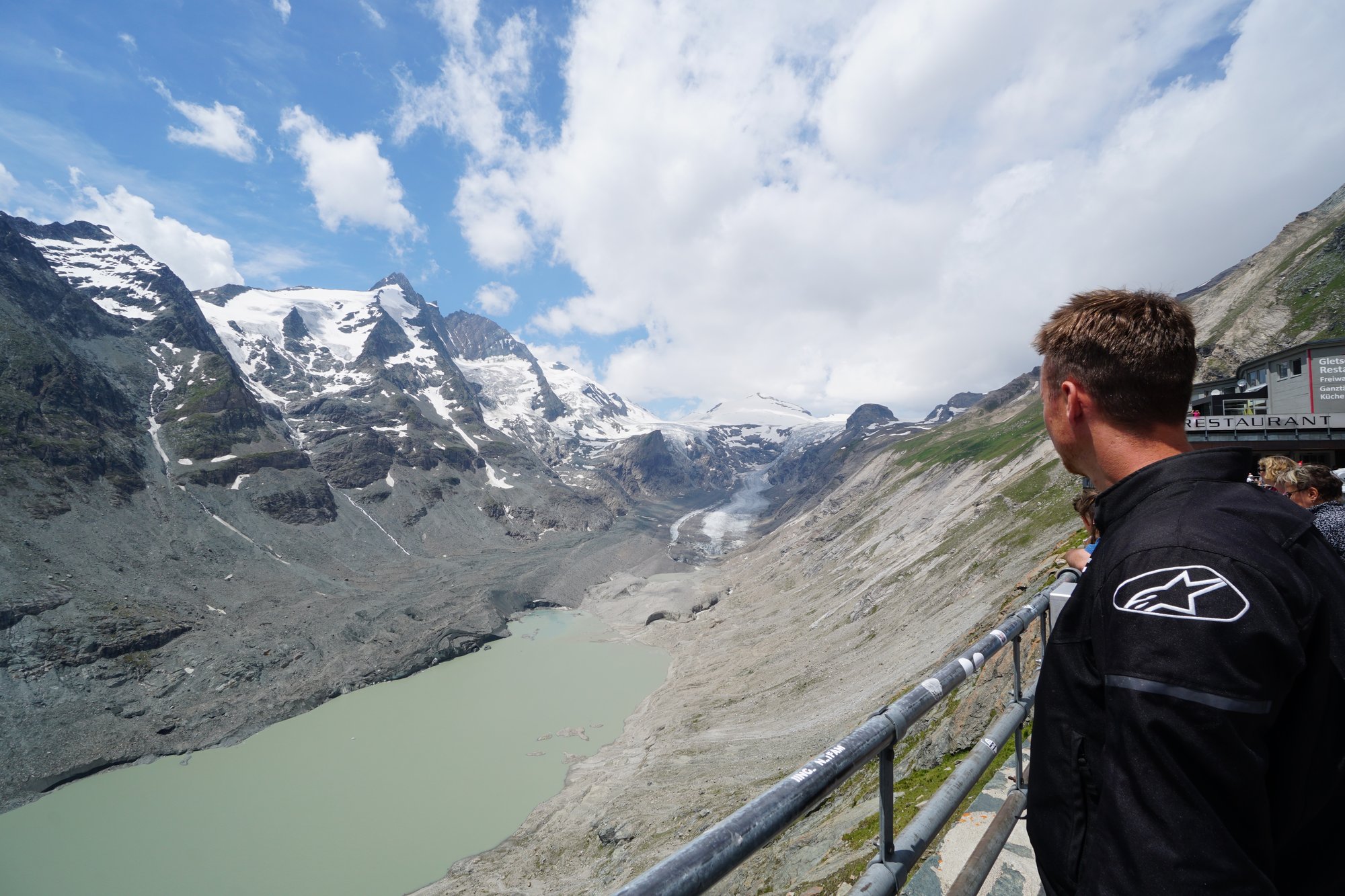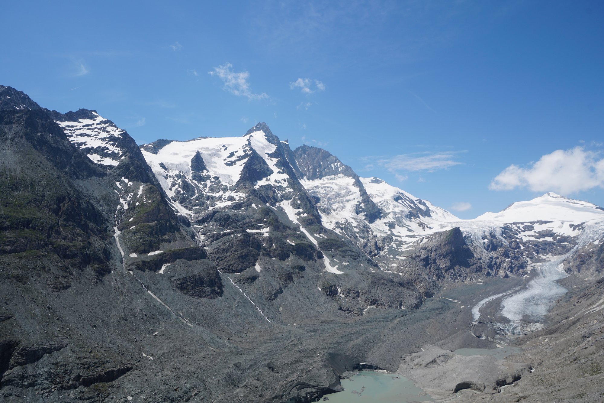 Hier zien we ook (nog) de Pasterze gletsjer liggen. Ronny schrikt ervan hoe de gletsjer er nu bij ligt. Hij is hier een kleine 20 jaar geleden ook geweest tijdens een gezinsvakantie en herinnerde zich hoe groot de gletsjer was en dat je er zo op kon lopen. Nu is veel van het ijs gesmolten en zie je de gletsjer eigenlijk alleen nog hoog in de bergen liggen. Op dit soort momenten wordt glashelder wat klimaatverandering precies met de natuur doet. Tegelijkertijd zijn we daar allemaal debet aan. Ook wij met onze diesel-slurpende Mercedes bus uit 1985. (Sorry Bruno!)