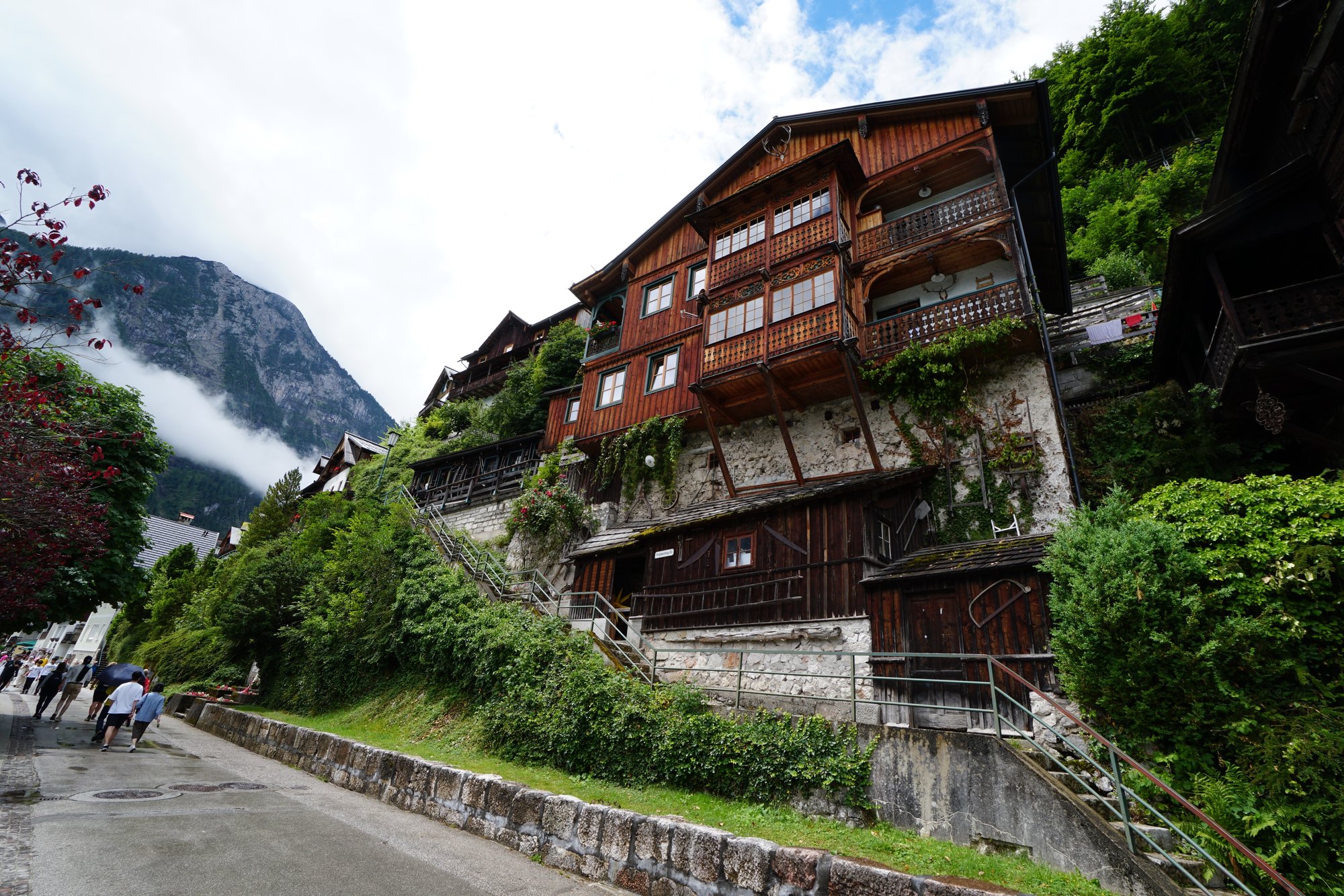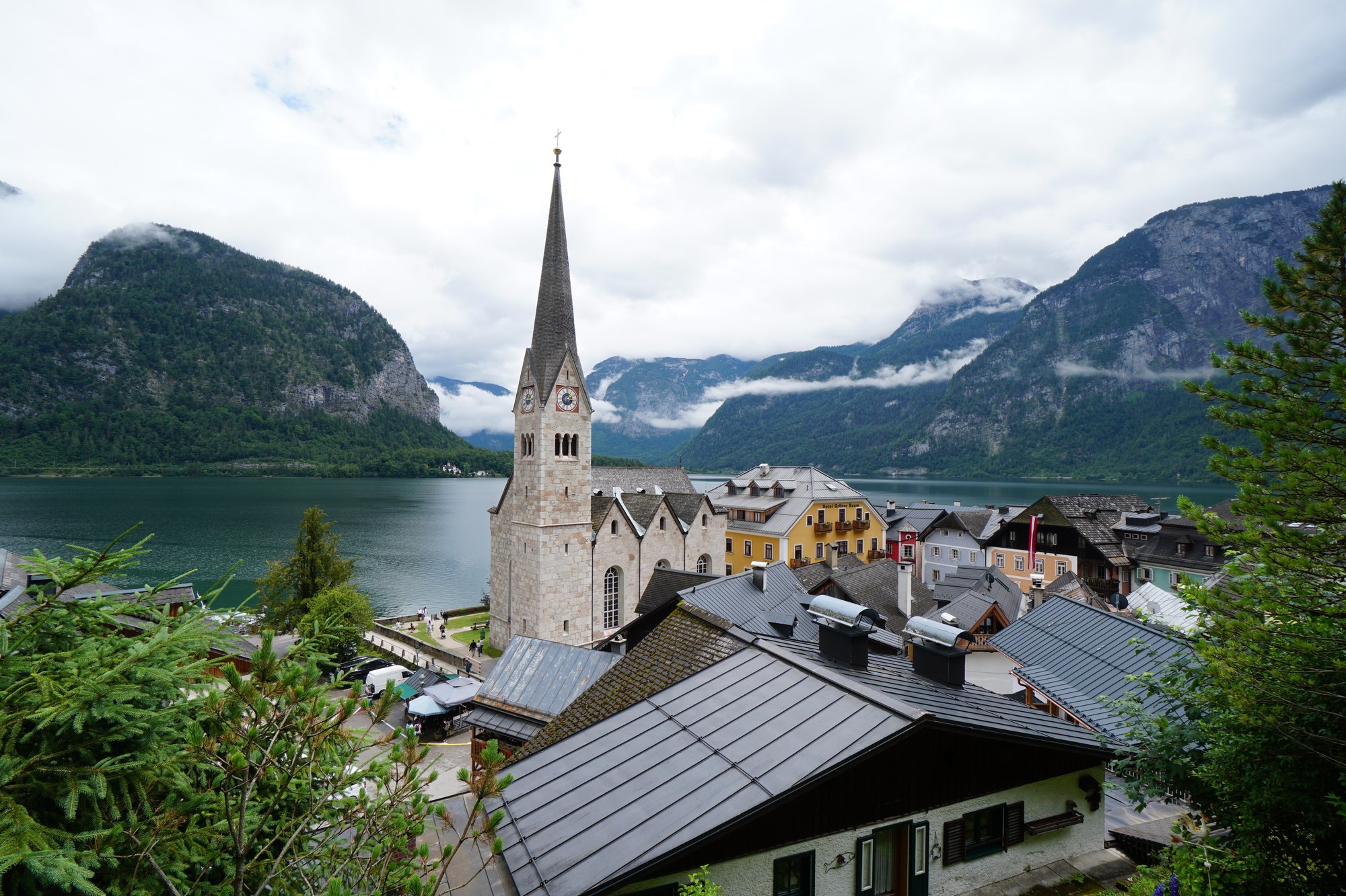 Bij aankomst in Hallstatt hebben we eerst zin in een kopje koffie. We lopen bij het Seecafe binnen en niet geheel onverwachts schenken ze hier dure koffie. Maar wel lekkere! We turen alvast door het raam naar buiten en zien de lucht steeds iets lichter worden. De regenwolken maken langzaam plaats voor hele kleine blauwe stukken. Tijd om door Hallstatt te gaan lopen!