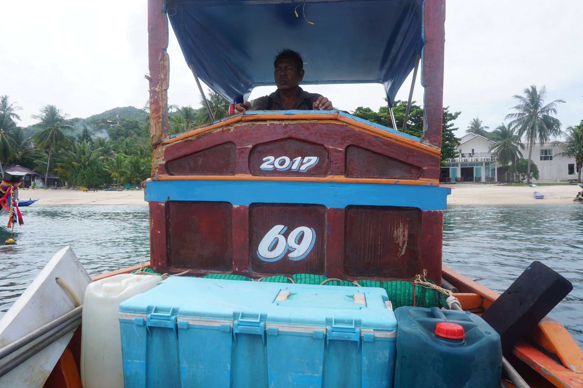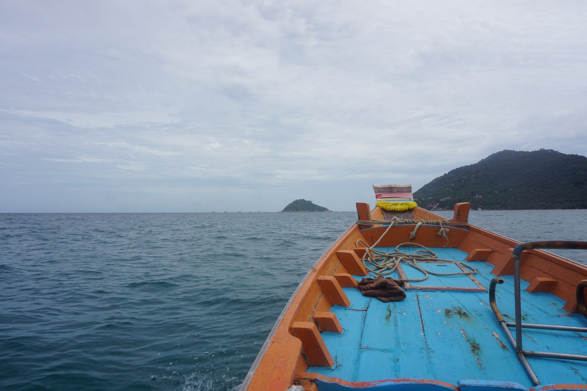Bij Sairee Beach of in de buurt van de pier kun je makkelijk je vervoer van en naar Koh Nang Yuan regelen. Wij regelen de longtailboot via ons guesthouse, makkelijk! Het is een klein half uurtje varen over een toch wel behoorlijke ruige zee. Af en toe klotst er een golf over de boot heen, maar wat maakt het uit. Straks gaan we toch lekker zwemmen!