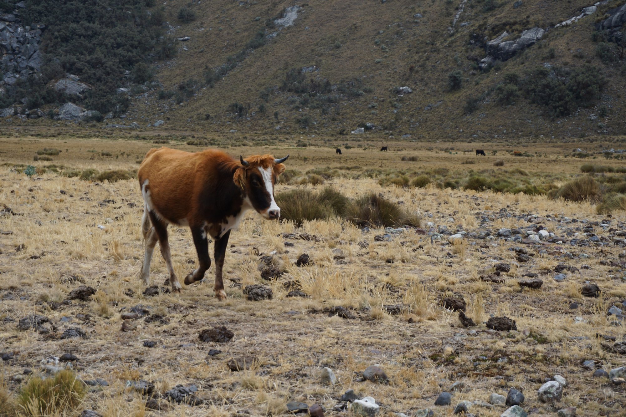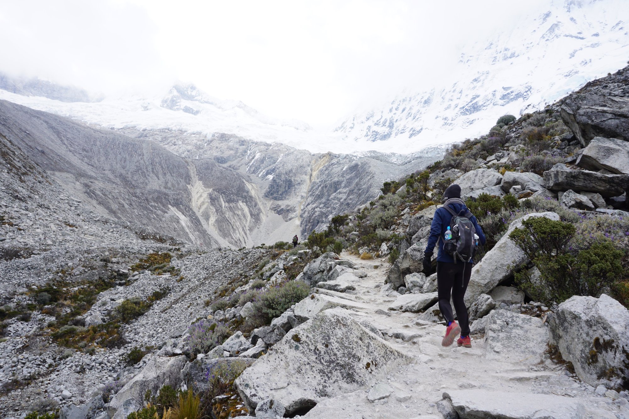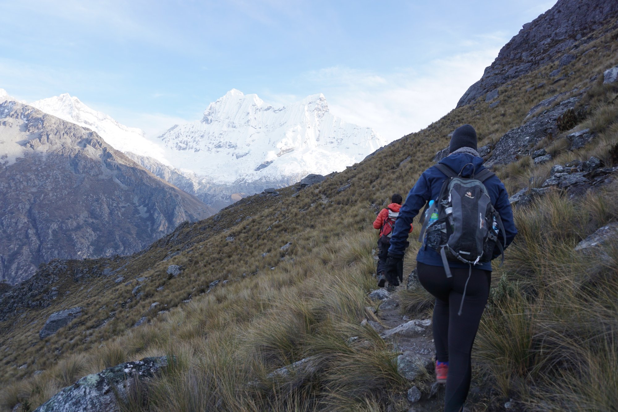 Met een gevulde maag beginnen we aan de hike. We moeten een klein stukje klimmen, maar daarna is het vooral afdalen. Het is fijn dat we in beweging komen, want het is nog steeds erg koud. We zijn blij dat we onze muts, sjaal en handschoenen bij hebben. Al lopend genieten we van het landschap dat ons omringt. Het is hier heerlijk stil, de enige geluiden die we horen zijn de fluitende vogels en de loeiende koeien. We zien tijdens de gehele afdaling helemaal geen andere mensen. Dat is toch wat anders dan 'in de stoet lopen' over het reguliere pad naar Laguna 69.