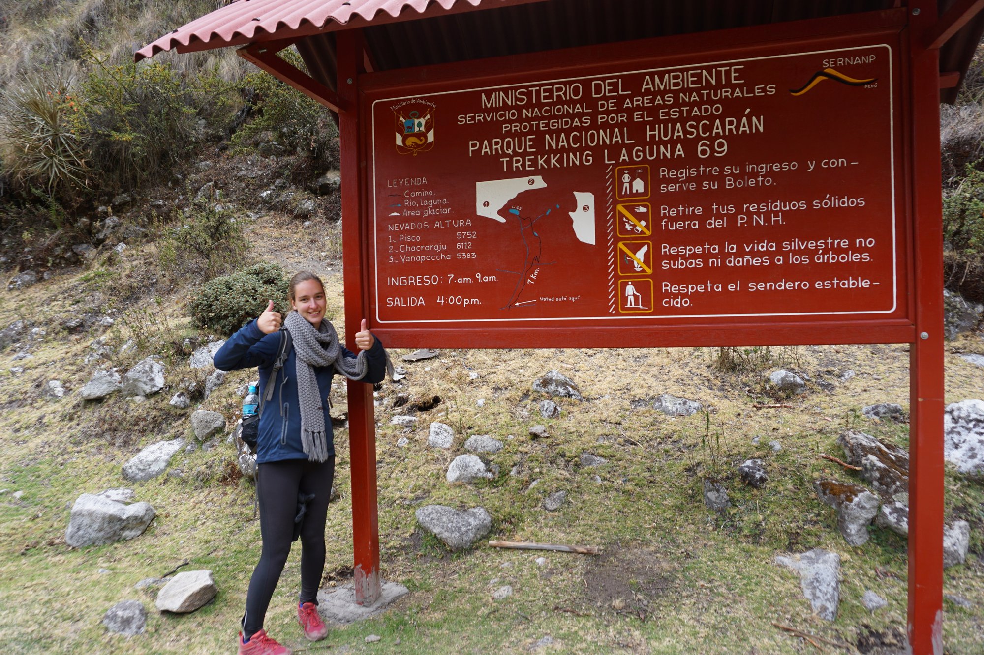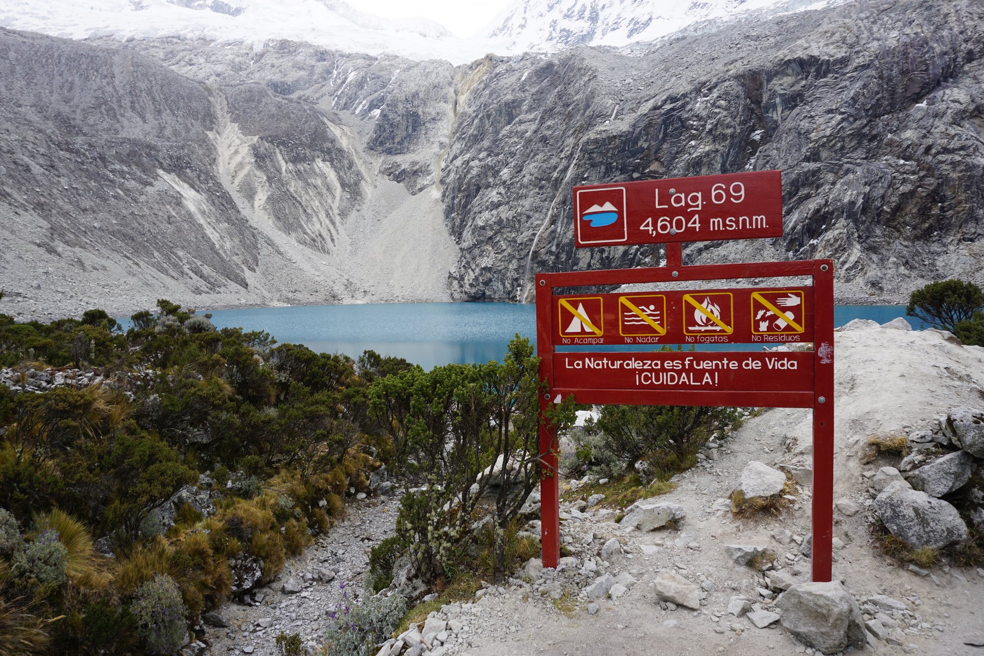- Laguna 69 ligt op een hoogte van 4.600 meter en je loopt dus risico op hoogteziekte. Je kunt je lichaam laten wennen aan de hoogte door vooraf eerst hikes te maken die makkelijker zijn en waarbij je minder hoog gaat. Wij deden een hike naar Laguna Parón en een hike naar Laguna Churup als voorbereiding op de Laguna 69 hike. Doordat je het opbouwt in hoogte, zul je minder snel last krijgen van hoogteziekte.