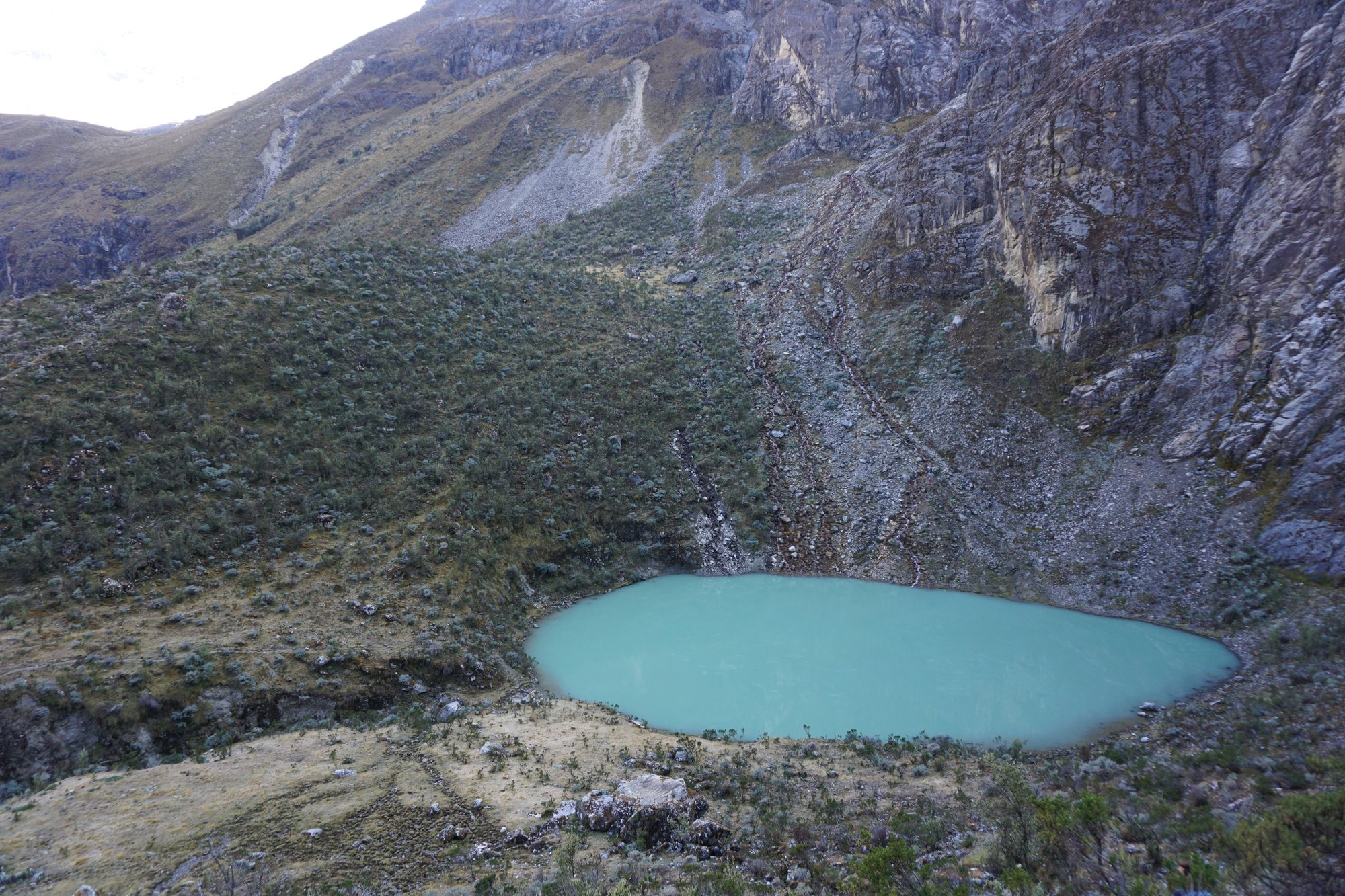 De natuur in de omgeving van Huaraz blijft ons verbazen. Of verwonderen beter gezegd. We krijgen er geen genoeg van. Qua schoonheid hadden we makkelijk uren bij Laguna 69 kunnen zitten en gewoon willen kijken, maar daarvoor is het echt te koud. De zon laat zich niet meer zien en dat zorgt ervoor dat we al onze warme kleren maar wat graag aanhouden. Tijd om weer in beweging te komen en af te dalen naar het eindpunt van onze hike.