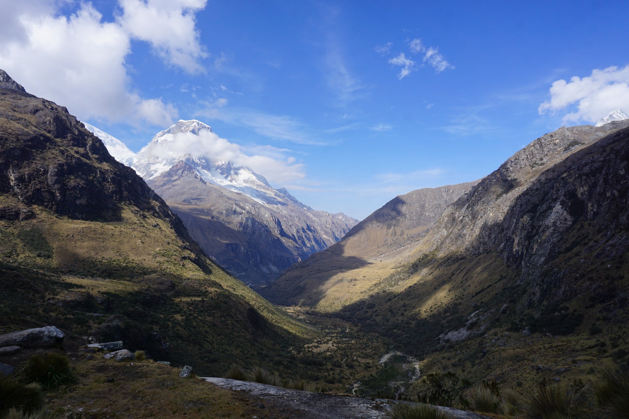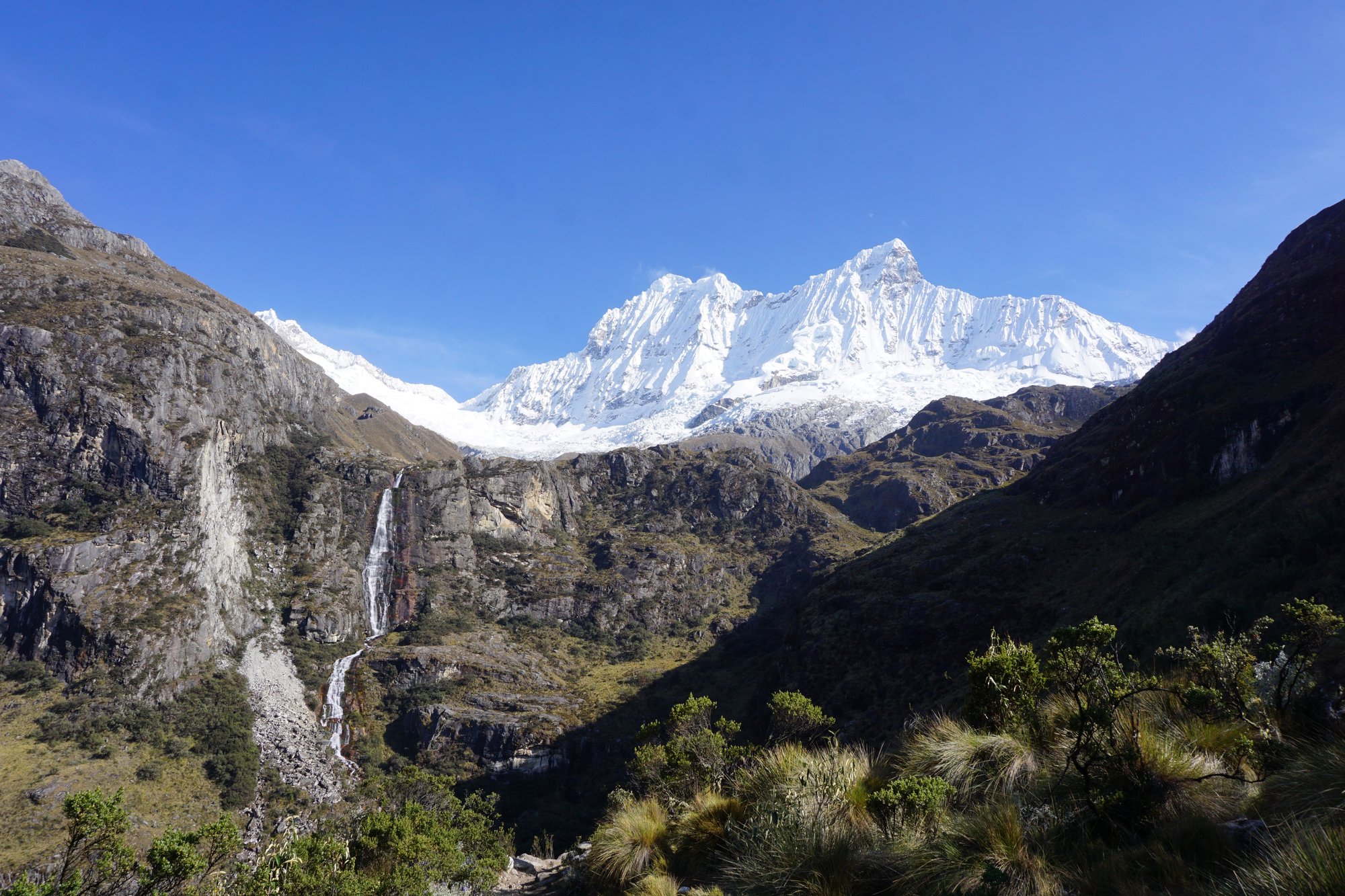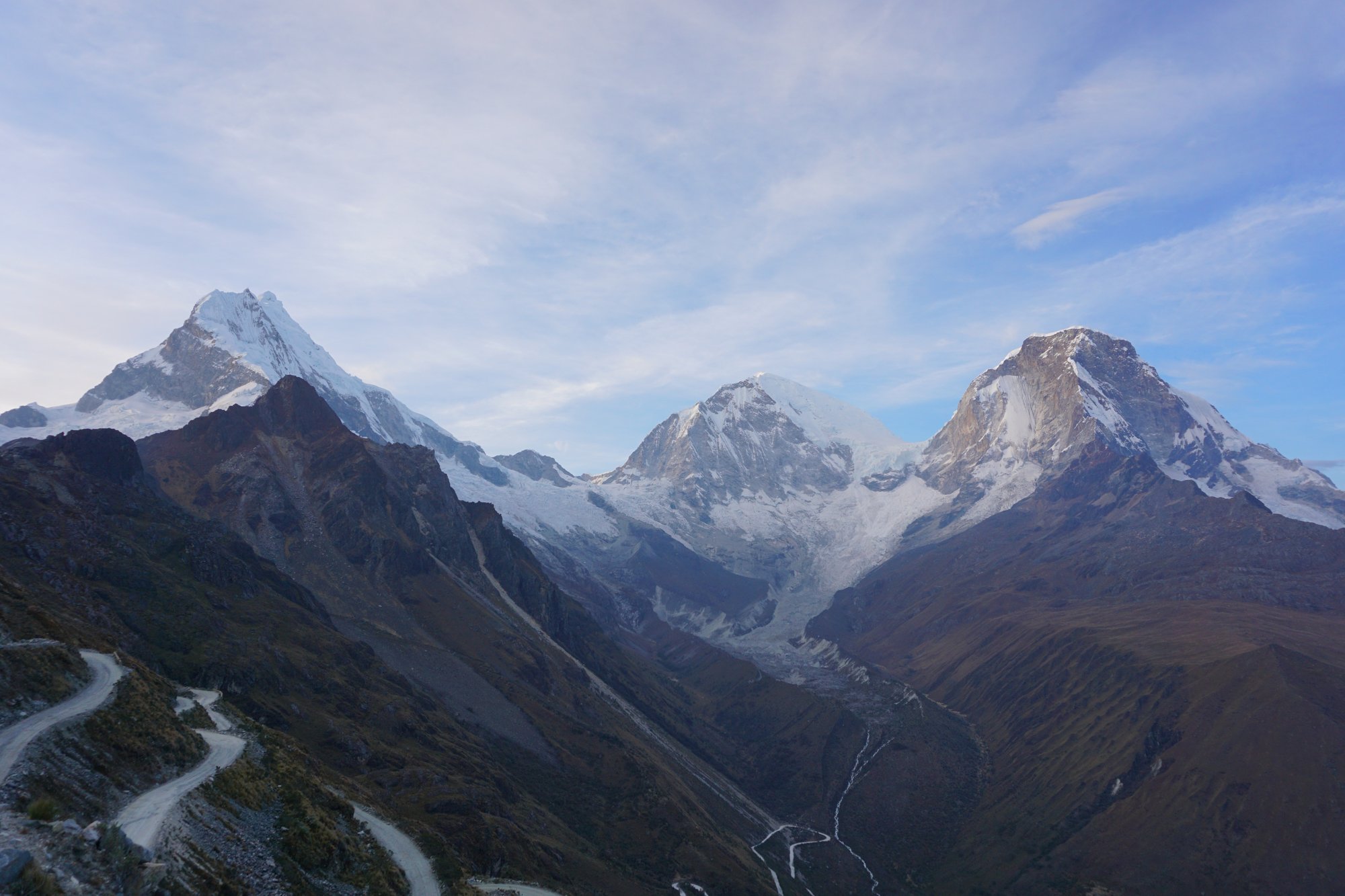 Uiteindelijk stopt het busje en wordt het ontbijt tevoorschijn gehaald. Terwijl we bibberen van de kou zien we de zon opkomen achter de bergen. Wat is dit een onvergetelijke plek voor een zonsopkomst. Langzaam verlicht de zon de besneeuwde pieken en imposante bergen, waaronder de hoogste berg van Peru: Nevada Huascarán (6.768 meter). In het dal zien we de Llanganuco meren liggen en een rivier stromen. Een indrukwekkend begin van de dag!