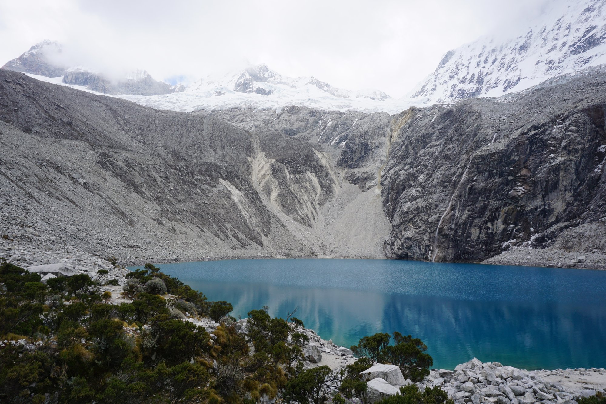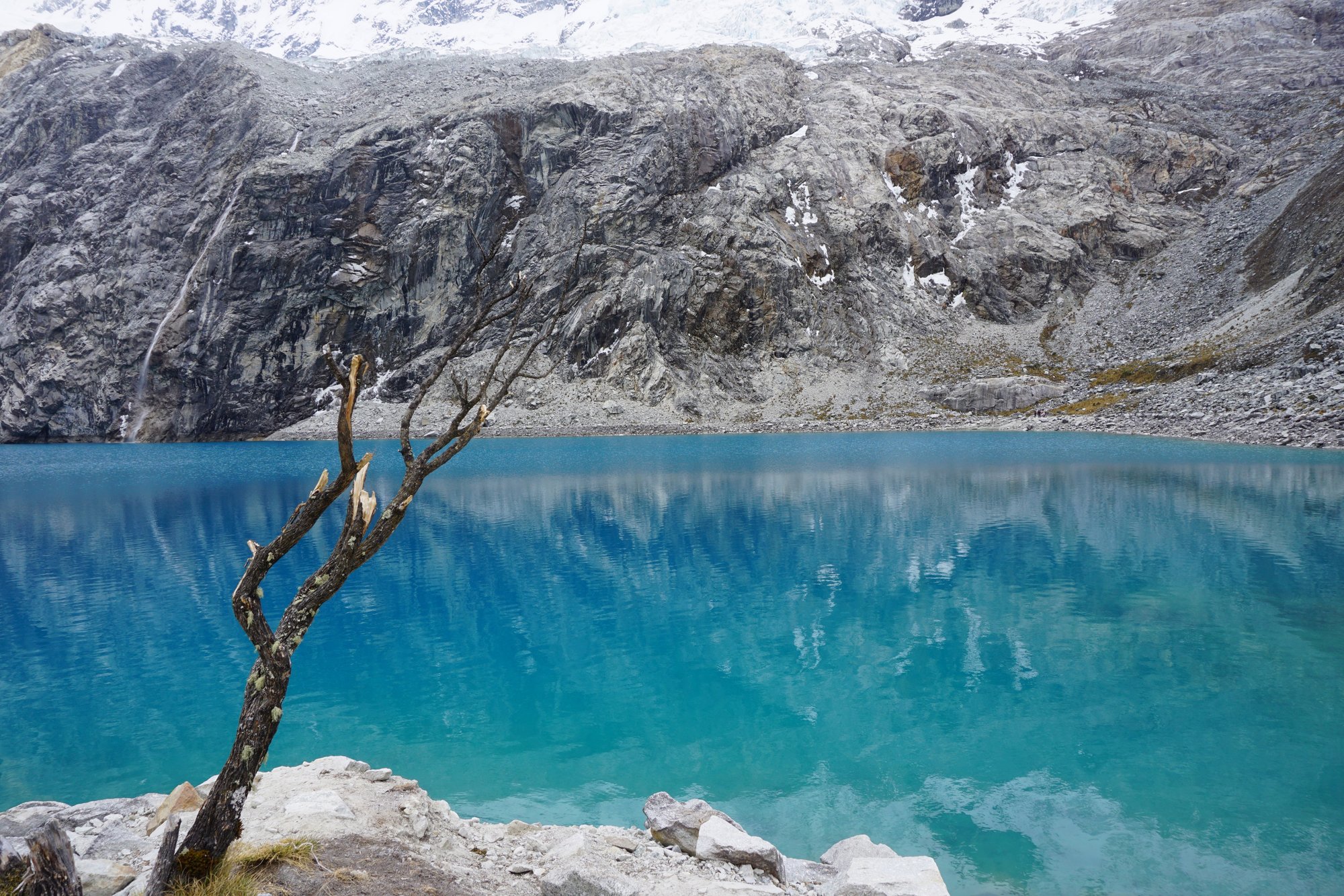 Ronny heeft er duidelijk minder moeite mee dan ik. Ik voel mijn hart door heel mijn lijf kloppen en alle kracht lijkt uit mijn benen verdwenen te zijn. Hiken op zulke hoogtes is hard werken! Maar hoe meer je hebt afgezien, hoe voldaner je bent als je dan echt voor dat meer staat. Wauw, dit is zó mooi! Het blauwe water vormt een mooi contrast met de grijze rotsen. Achter de laguna zien we een enorme bergtop die bedekt is met een flink pak sneeuw. Het smeltende water loopt via een smalle waterval het gletsjermeer in. Zulk helder water zie je niet veel.