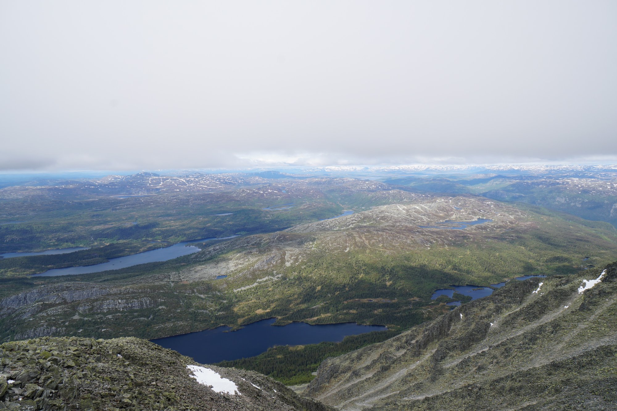 Ons harde werken wordt beloond. Na iets minder dan 2 uur staan we bovenop Gaustatoppen en zien we waarvoor we dit hebben gedaan. Wat een uitzicht! Dit 360 graden uitzicht is waanzinnig. De bergen en meren die lager liggen lijken ineens heel klein vanaf deze top. We kunnen heel ver kijken, ook al is het inmiddels wat bewolkter geworden. Gaaf!