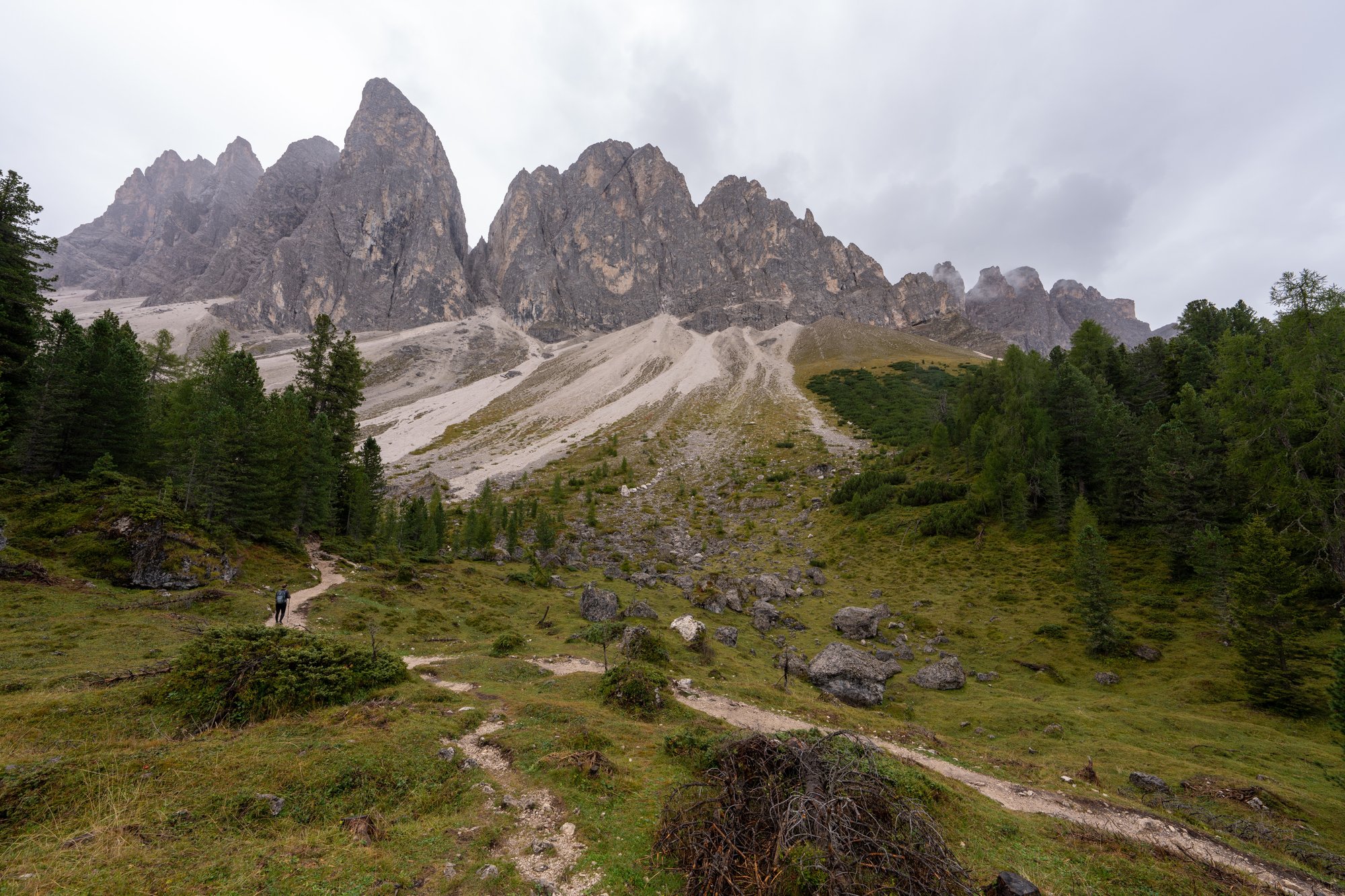 We passeren de nabijgelegen Gschnagenhardt Alm en zetten koers richting de puntige bergpieken van het Puez-Odle Nature Park. We lopen over de grasweides richting het bos met daarachter die grijze bergen. Dit is één van de mooiste delen van de hike. Wauw!