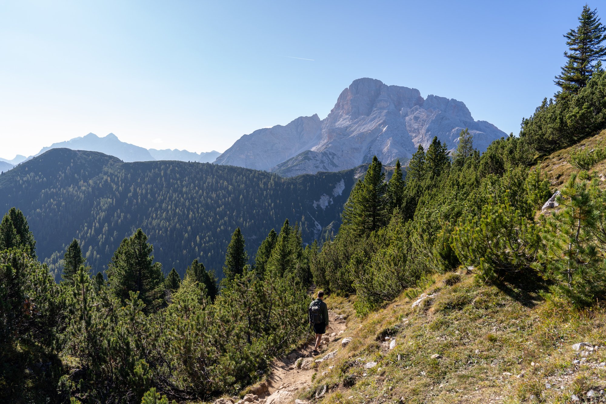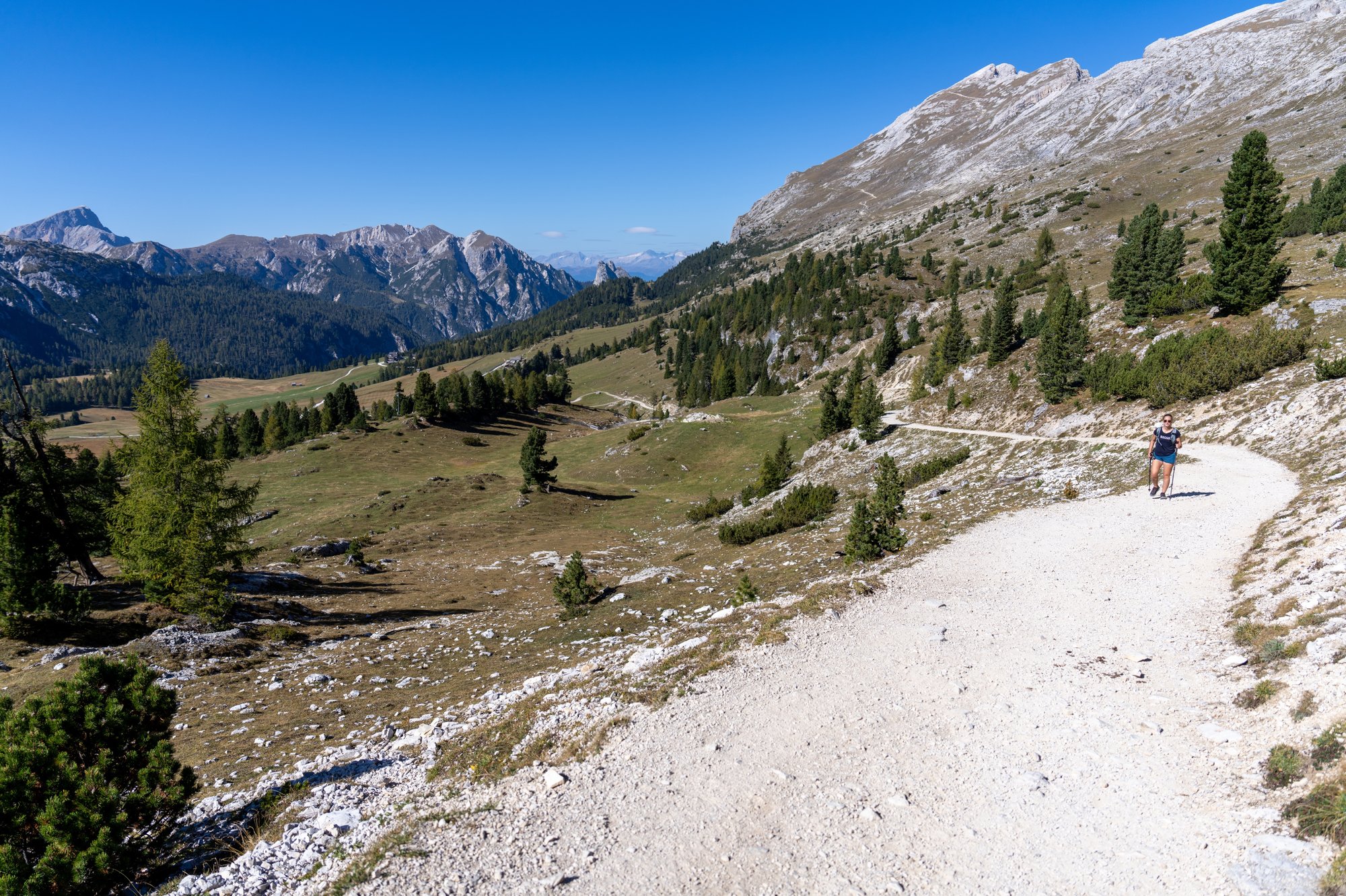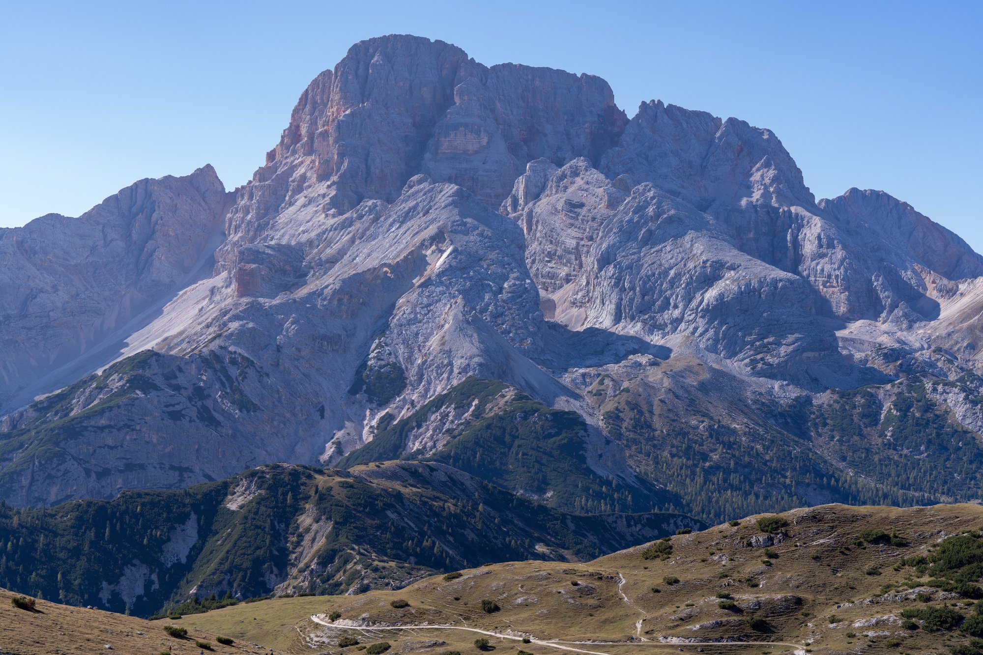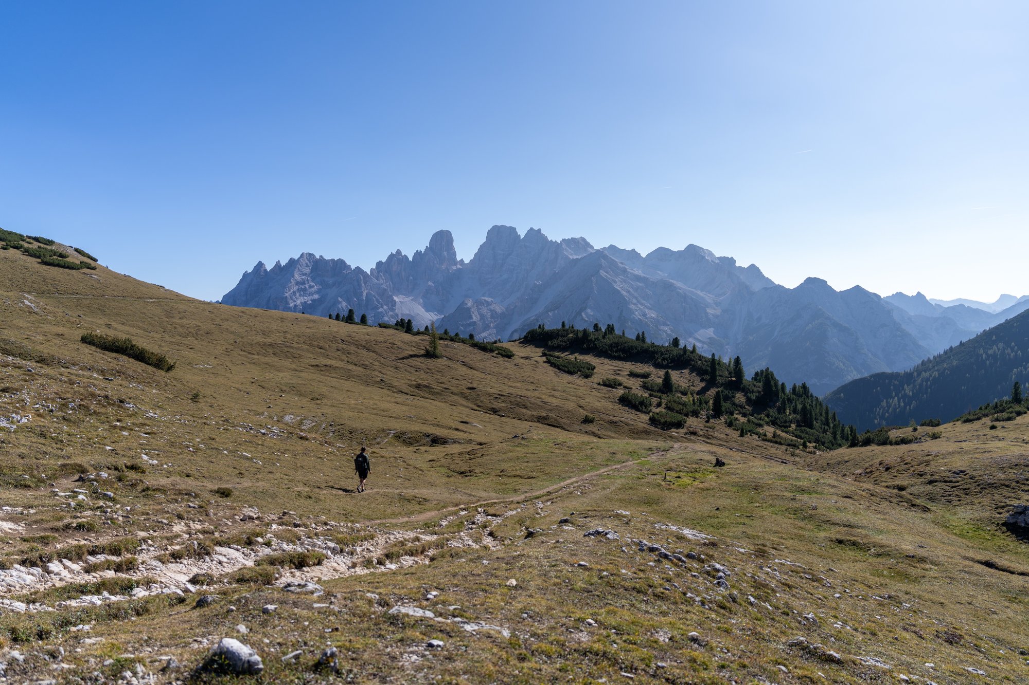 Het eerste deel van de terugweg is hetzelfde als op de heenweg, maar voor de afwisseling kiezen we daarna voor een andere route terug naar het beginpunt. Op het zadel van Monte Specie slaan we linksaf richting Rifugio Vallandro / Dürrenstein Hütte. Eventjes hebben we spijt, want het makkelijke pad op de heenweg maakt nu plaats voor een steil dalend pad vol gruis waar we goed op onze tellen moeten passen. Aan de andere kant kijken we nu weer via een andere hoek naar de bergketen dichtbij het plateau en dat is erg mooi. En gelukkig blijft het pad ook niet zo lang steil afdalen, dus bleek het alsnog een goede keuze.