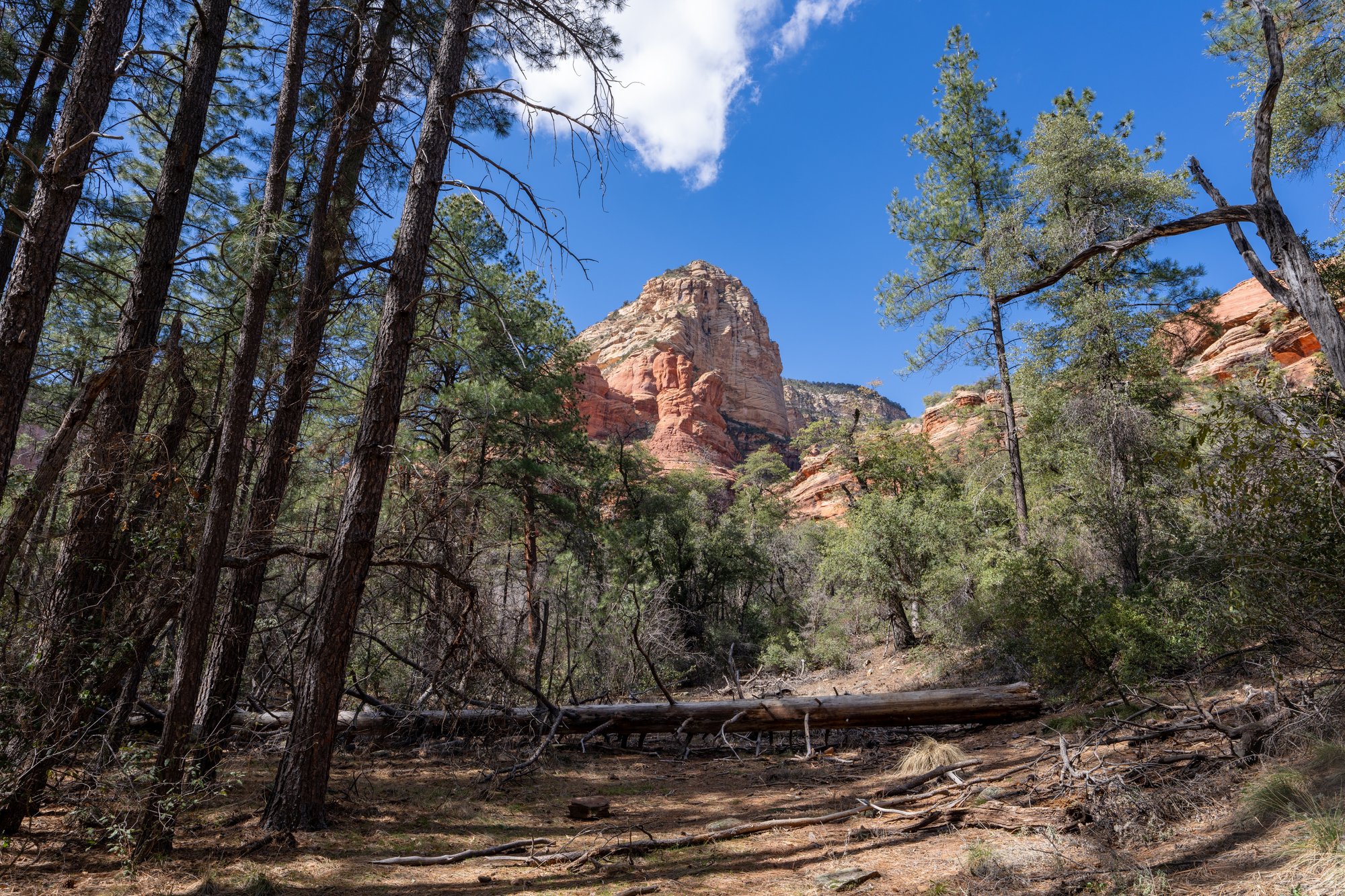 Aan het einde van de ochtend zijn we - nog helemaal in de wolken van wat we net hebben gezien - terug bij de Boynton Canyon Trail. We slaan rechtsaf, want de trail loopt nog 1,7 kilometer door naar de Boynton Canyon Overlook. Het landschap verandert bijna gelijk als we verder de Boynton Canyon in lopen. We zijn nu omringd door naaldbos. Het ziet er niet alleen anders uit, het ruikt ook anders dan net.