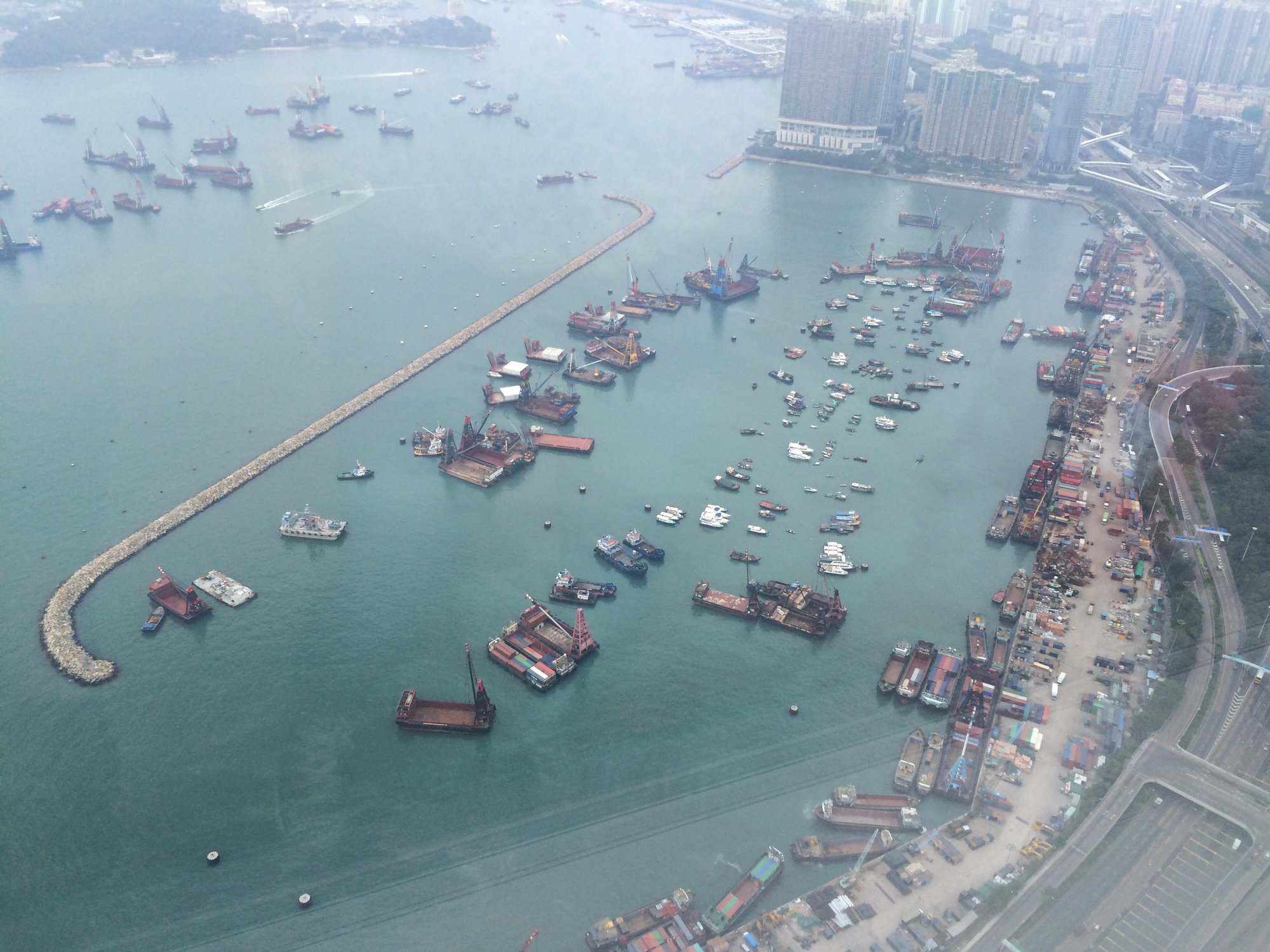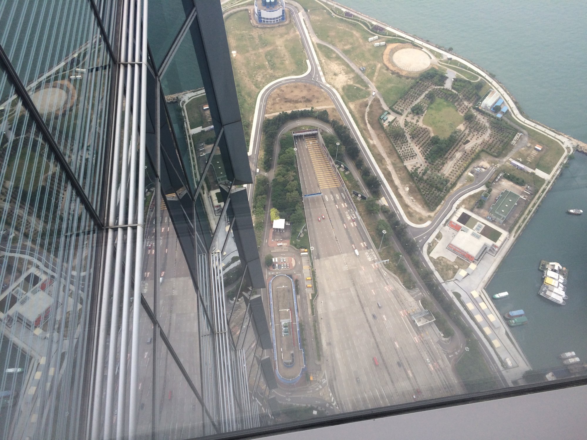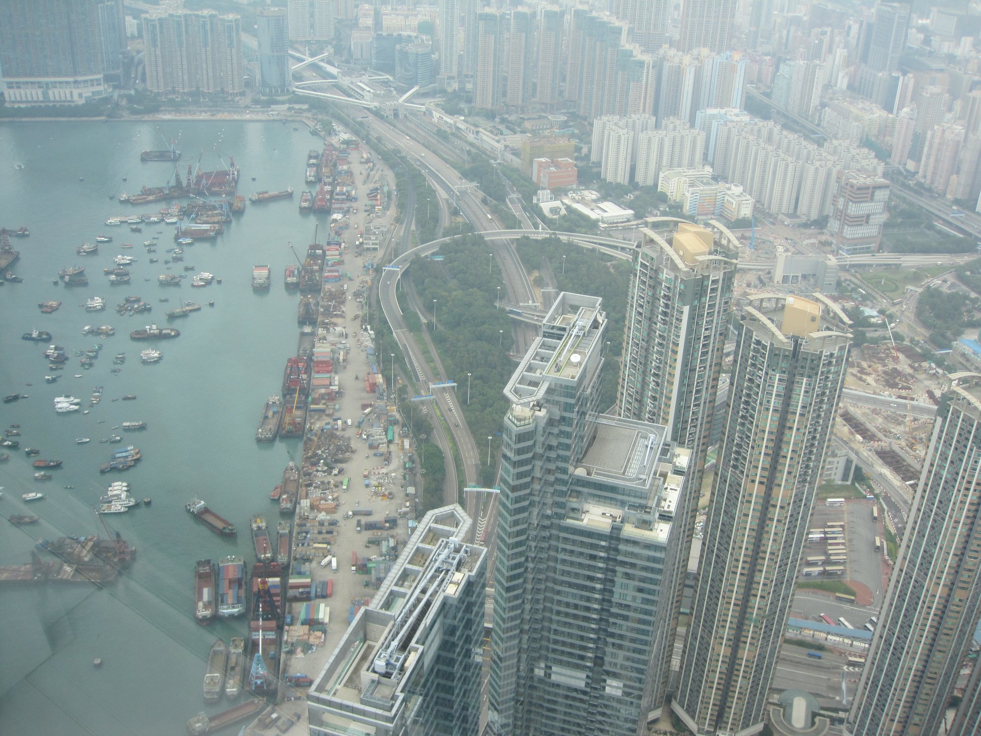 We stappen de lift uit en lopen direct richting de grote ramen. Sprakeloos kijken we naar beneden. Wow. We zijn allebei nog nooit in zo'n hoog gebouw geweest. De auto's die door de straten rijden lijken wel mieren en de schepen in Victoria Harbour zijn net van speelgoed. Wat een diepte. We kijken ruim over de wolkenkrabbers die we tijdens onze wandeling nog zo overweldigend vonden. Het lijkt wel een grote maquette. Door de smog in Hongkong kunnen we niet oneindig ver kijken, maar een heel groot gedeelte van de stad kun je overzien. Op het dek is ook nog een barretje waar je wat kunt eten en drinken, maar dit vinden wij niet de meest gezellige plek en de prijzen zijn behoorlijk. Met een letterlijk én figuurlijk grootse ervaring op zak vertrekken we na een half uur weer naar beneden. Dat hebben we toch maar mooi weer meegemaakt!