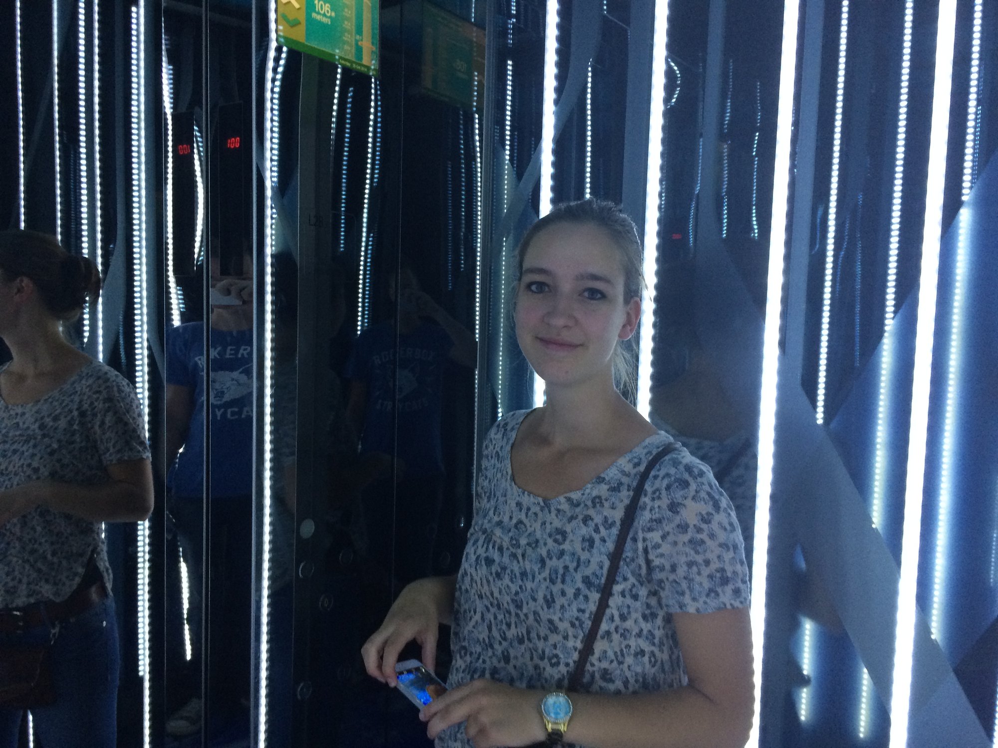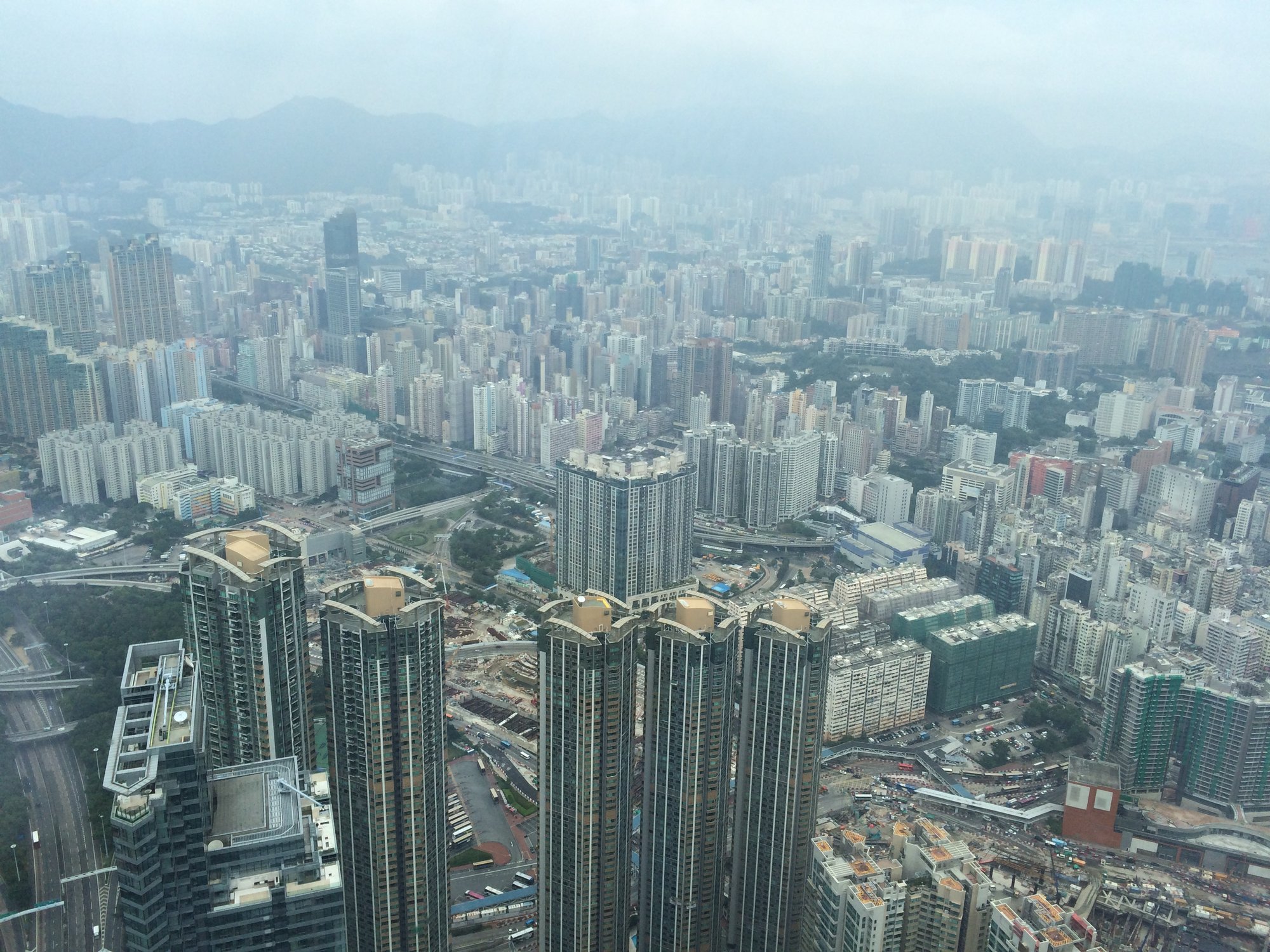 Na een flinke wandeling vanaf Hongkong Island en best wel wat zoeken naar de ingang van het reusachtige gebouw, komen wij aan bij de balie van Sky100. We kopen een ticket (van €18!) voor het observatiedek en vervolgens wordt ons vriendelijk de weg gewezen naar de lift. Deze lift wordt alleen gebruikt voor bezoekjes van het observatiedek, dus het is in één ruk naar de 100e verdieping. We stappen met nog een aantal toeristen in de lift en de deur sluit. Het cijfer van de actuele verdieping loopt steeds sneller op. Onze oren klappen zelfs dicht en al een minuutje later staan we op het observatiedek, 393 meter boven zeeniveau!