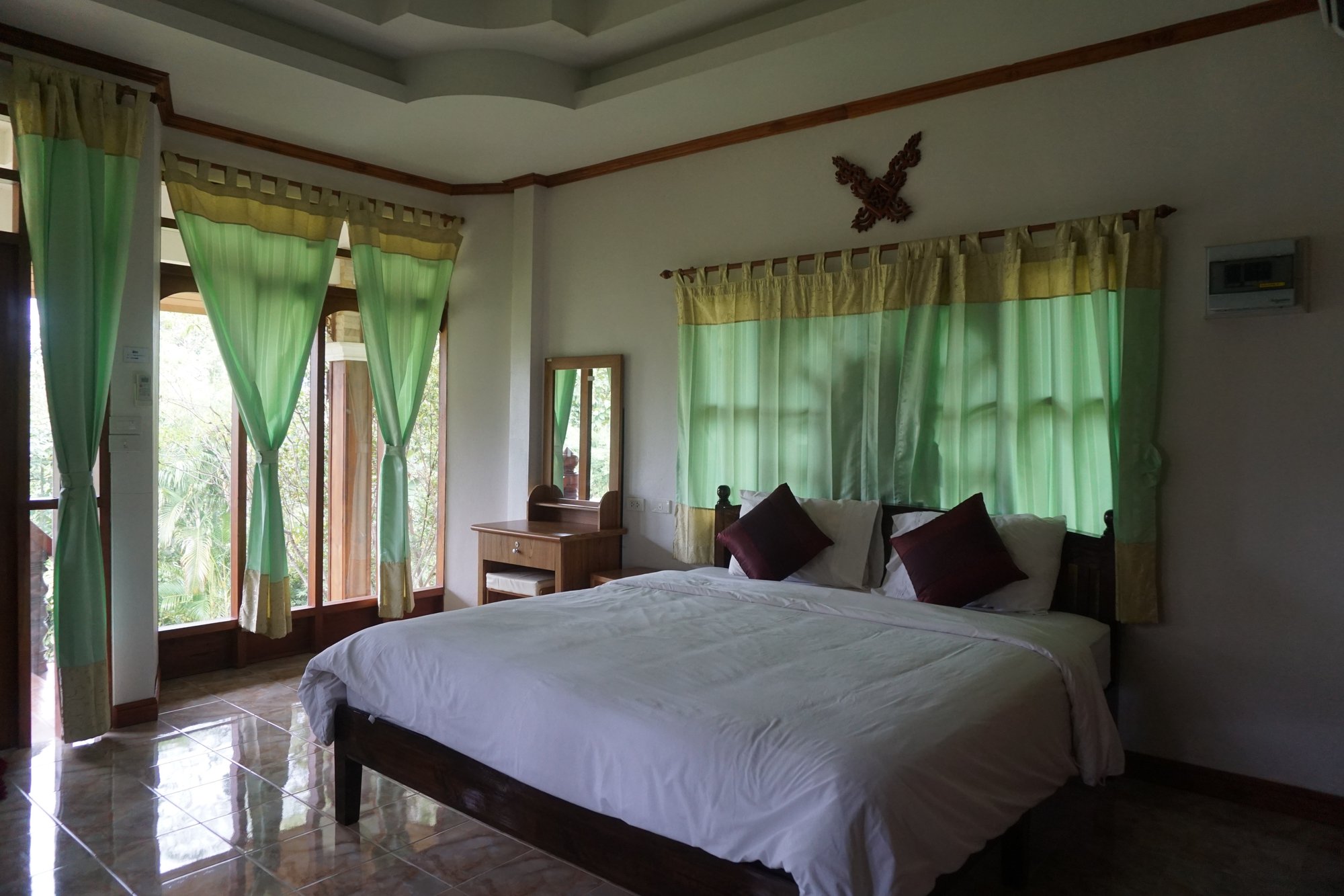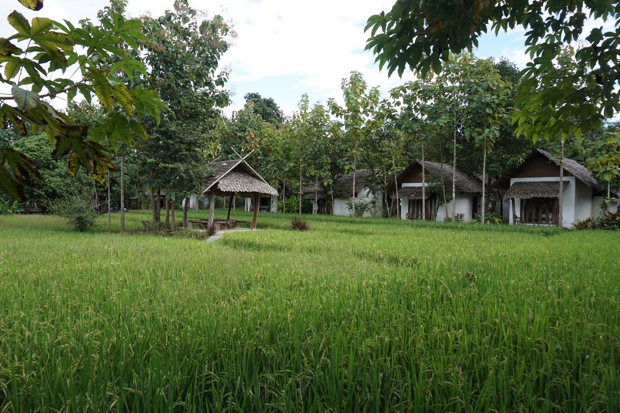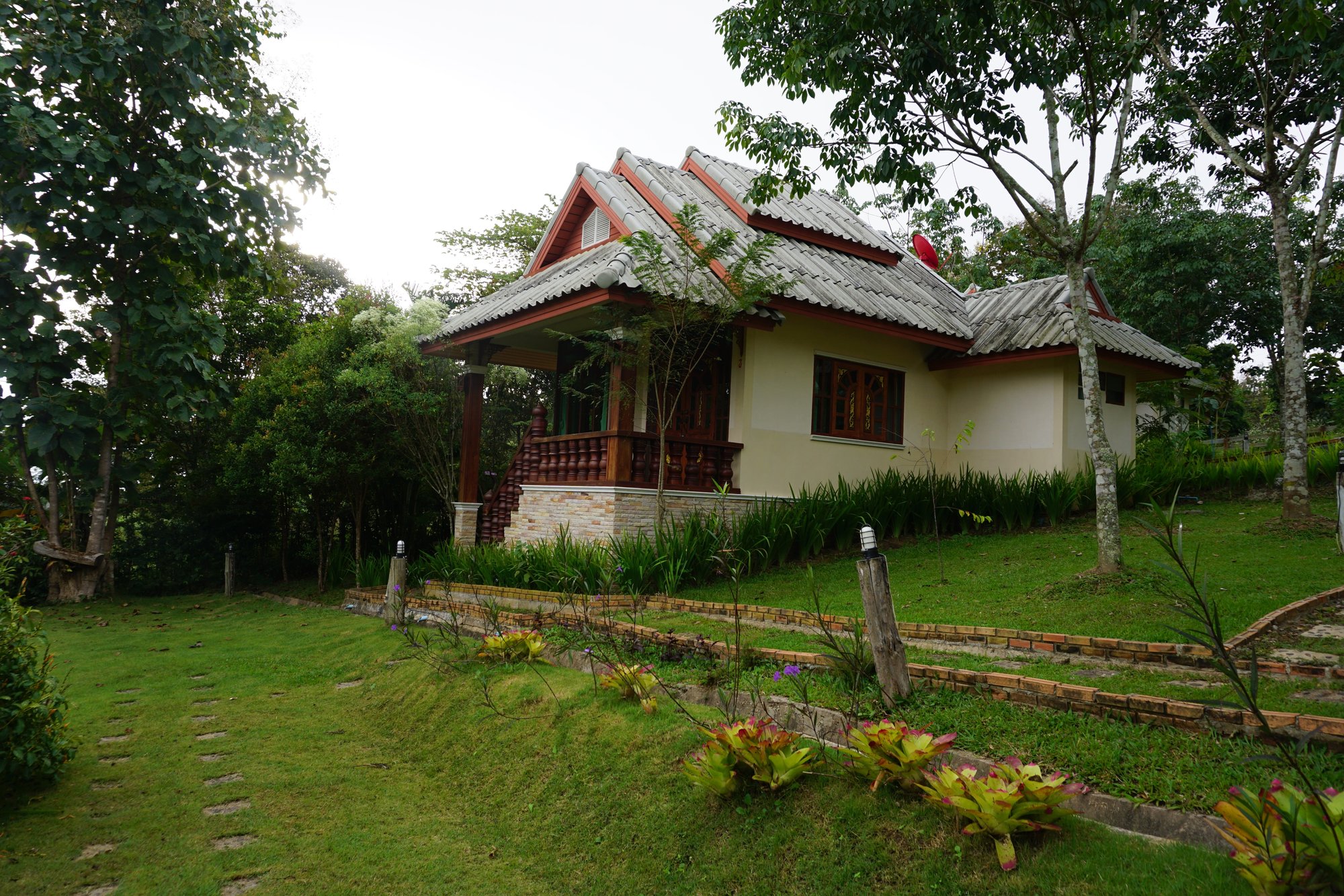 Mont Goei Pai is een heel ander soort park. We hebben het hier over een echt huisje in plaats van een hutje en het park ligt aan een grotere weg. De stijl van het huis is niet onze smaak en wij vinden het geheel vrij sfeerloos. Het huis is groot, maar leeg. Dat maakt het niet echt gezellig helaas. Tijdens het inchecken worden we door een ongeïnteresseerd persoon naar het huisje gebracht en wordt er verder niets verteld of toegelicht. Gemiste kans!