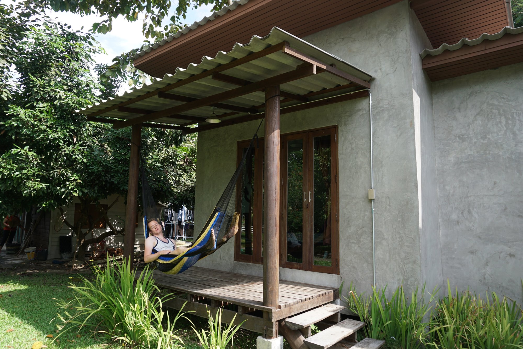 Bij het Prilpai Guesthouse hangt een gemoedelijke sfeer. Het is kleinschalig en als je wat te drinken wilt kopen van het guesthouse, dan doe je het geld in een potje. Dat geeft een beetje de knusheid aan, wij houden daar wel van! Aan de voorkant van het huisje hangt een hangmat waar je lekker in kunt rusten na een vermoeiende dag in Pai. So far, so good.