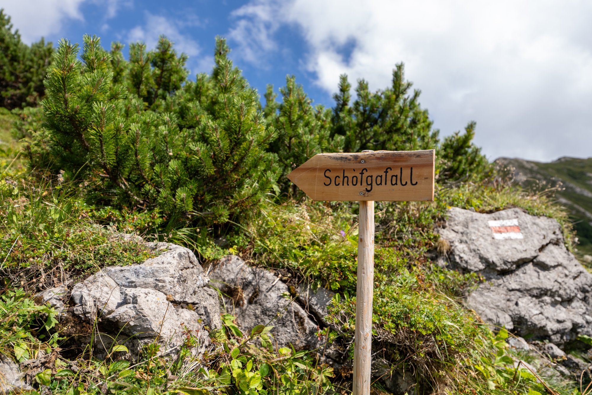 Na een kilometertje en meer dan 100 hoogtemeters komen we bij de kruising waar de meeste mensen rechtdoor gaan en wij linksaf slaan. Snel daarna komen we bij een klein bordje ‘Schafgafall’ dat nogmaals naar links wijst en dan weten we: nu gaat het echt beginnen. Het pad naar het witte kruis op Schafgafall is vanaf dit bordje nog maar een kilometer, maar we komen wel dik 300 meter hoger uit. Een hellingspercentage van meer dan 30% dus! Misschien dat we daarom bijna niemand dit pad zien nemen? ;-)