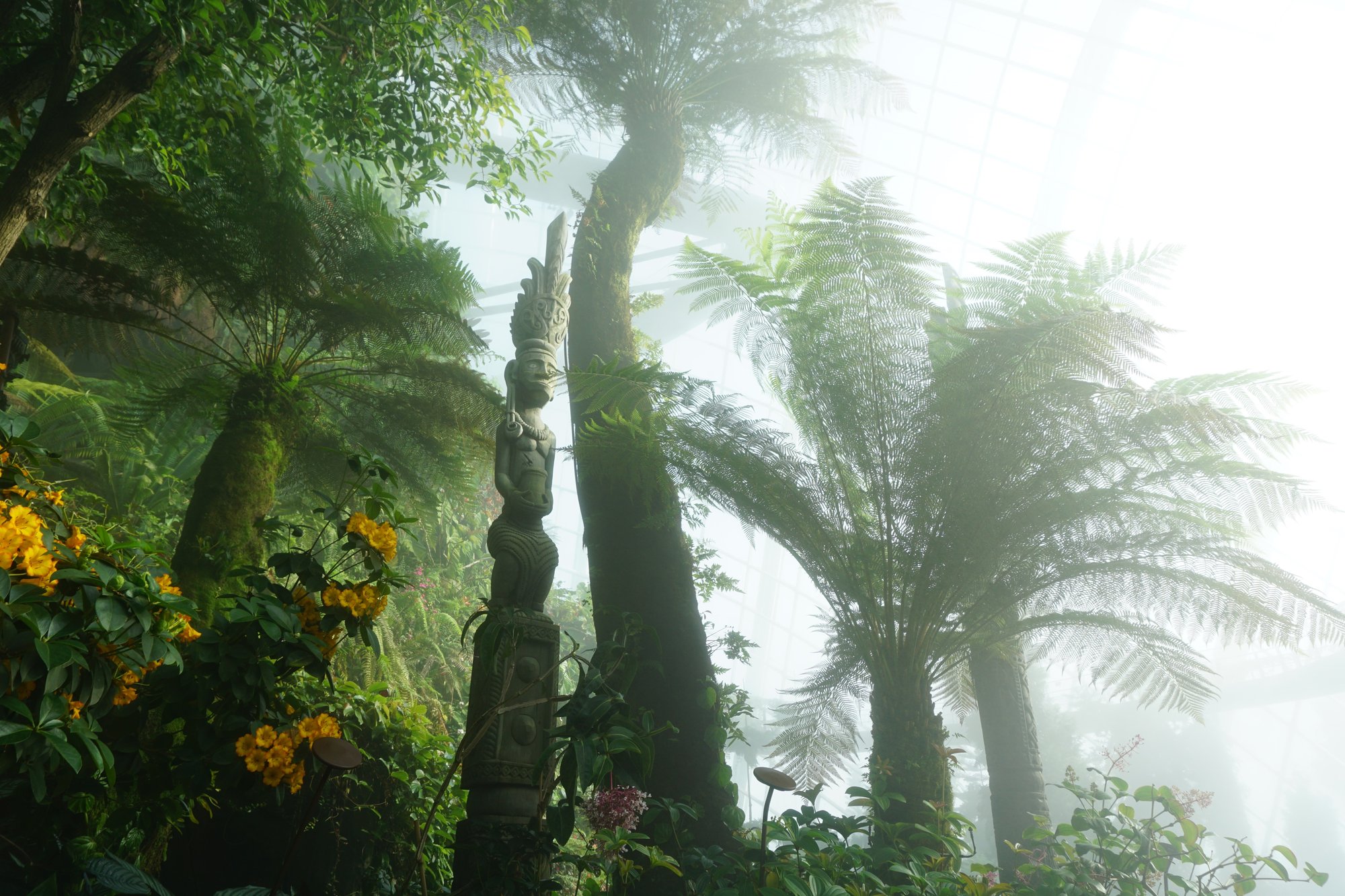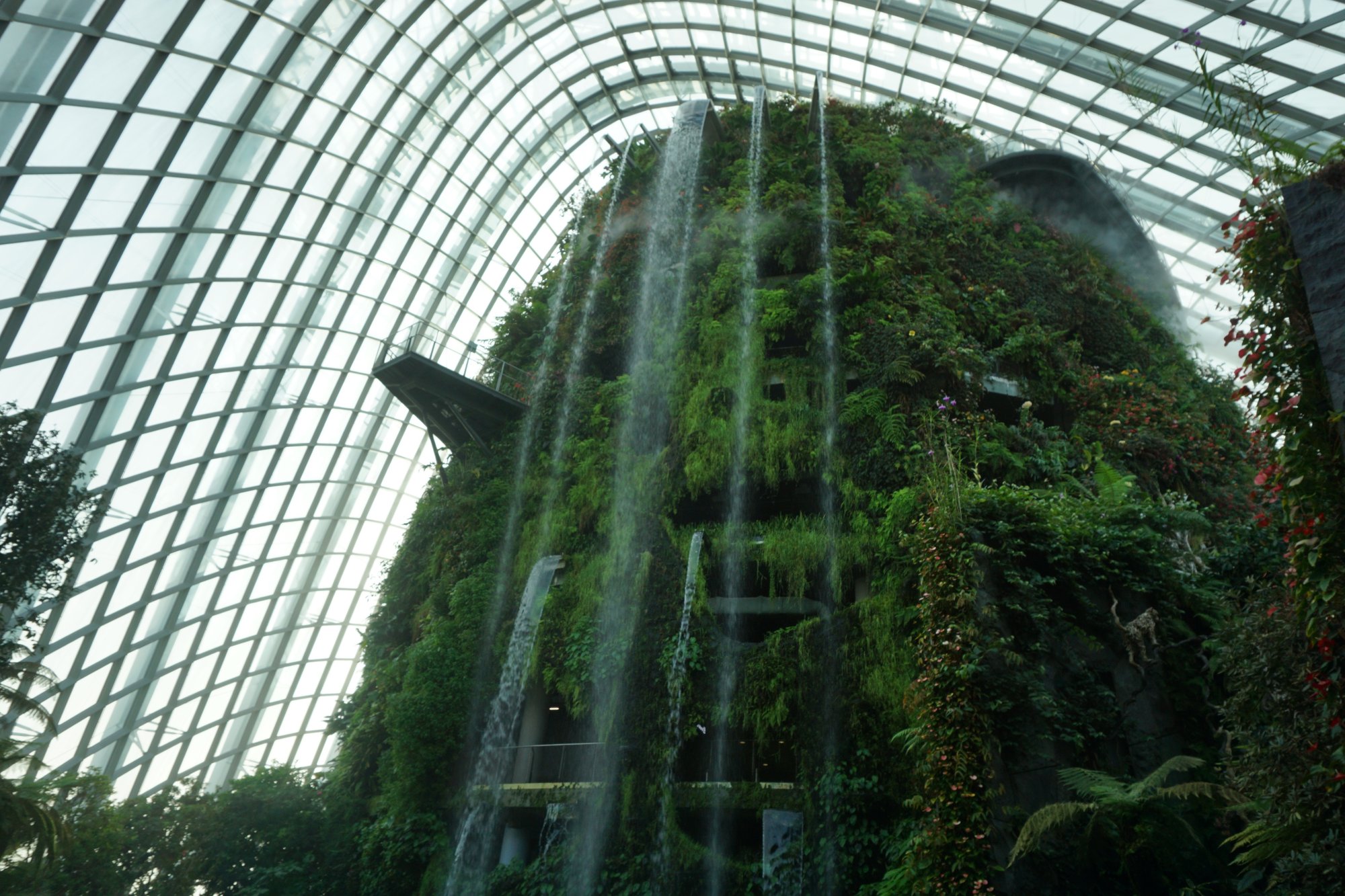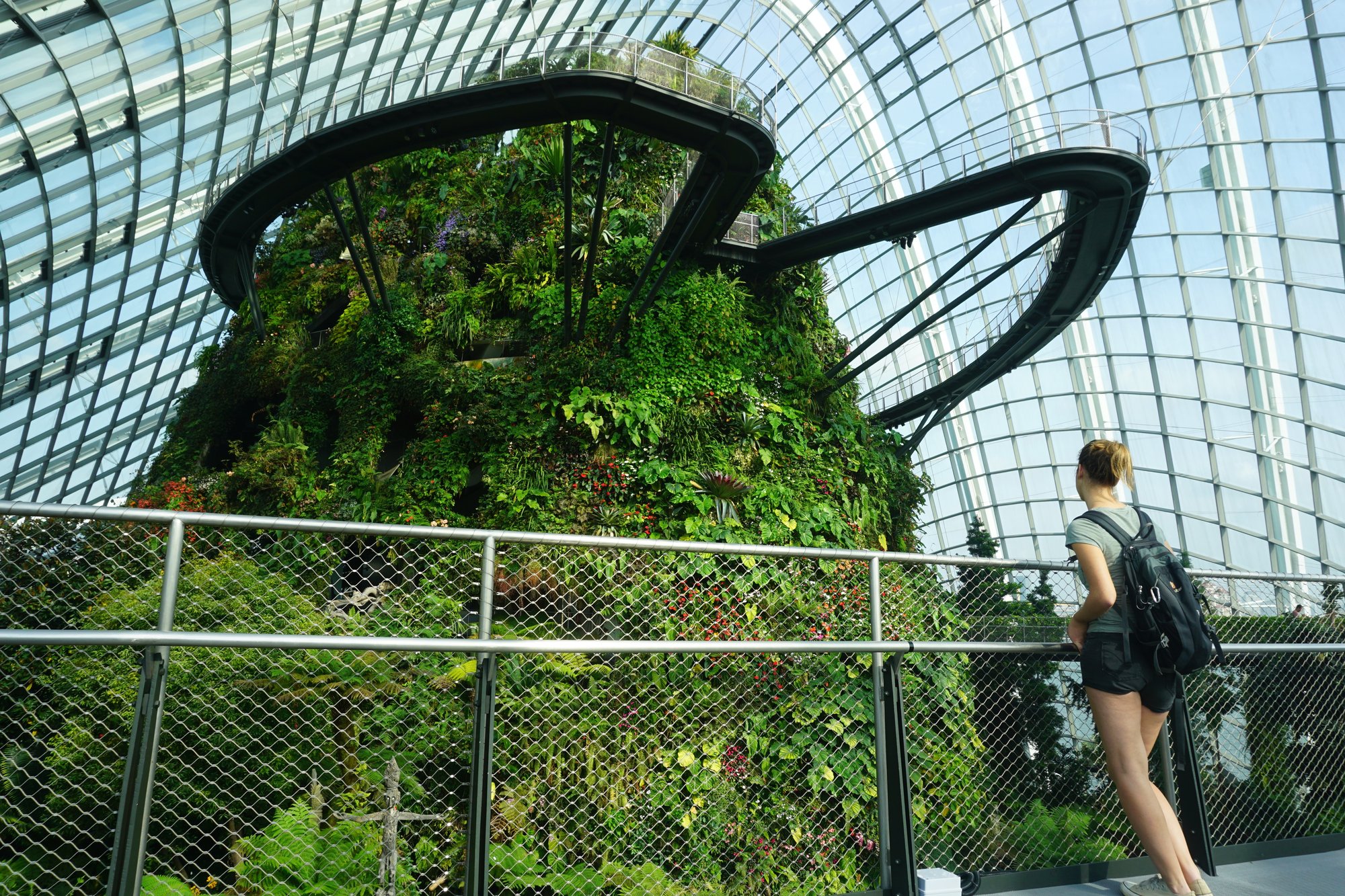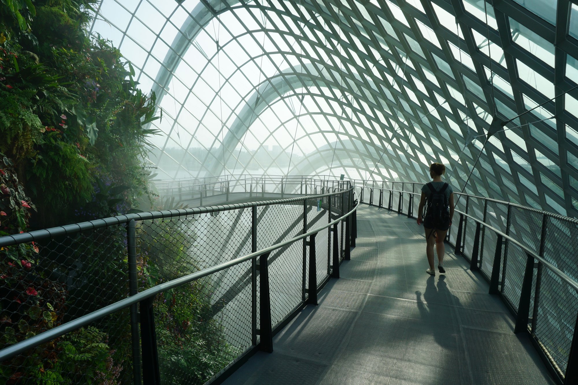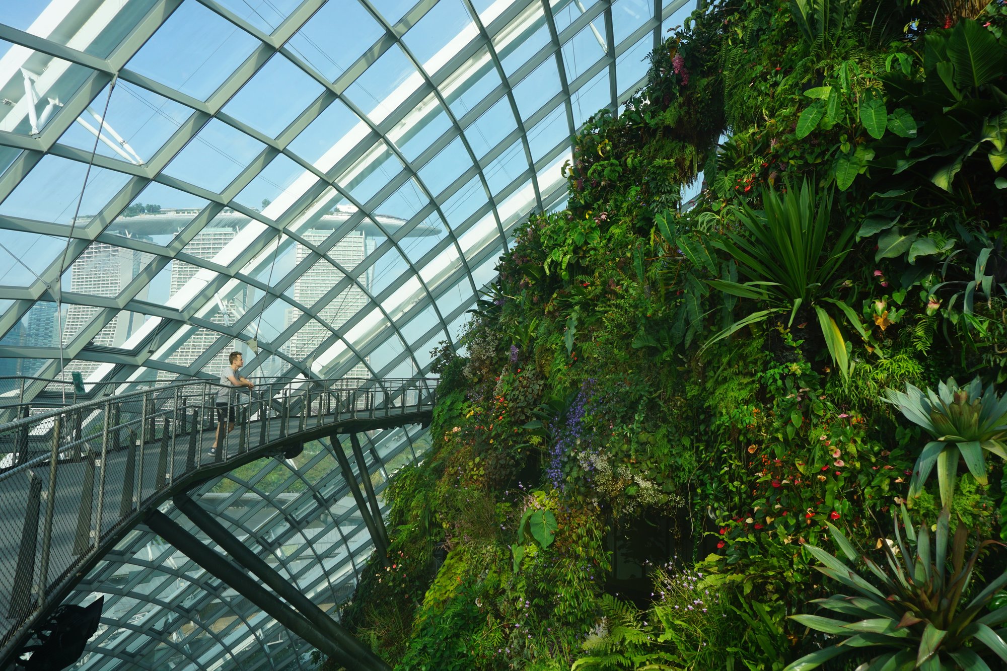 Gardens by the Bay is in principe gratis toegankelijk, tenzij je de twee grote, glazen koepels in het park wilt bezoeken. In de ene koepel vind je het Cloud Forest, een plek waar ze tal van planten van over de hele wereld hebben verzameld. Via een hoge loopbrug wandel je voor je gevoel tussen de boomtoppen in het regenwoud en je vindt hier de hoogste indoor waterval ter wereld. Af en toe maken ze het helemaal mistig in het Cloud Forest. Dan is het net alsof je je echt in de jungle bevindt!