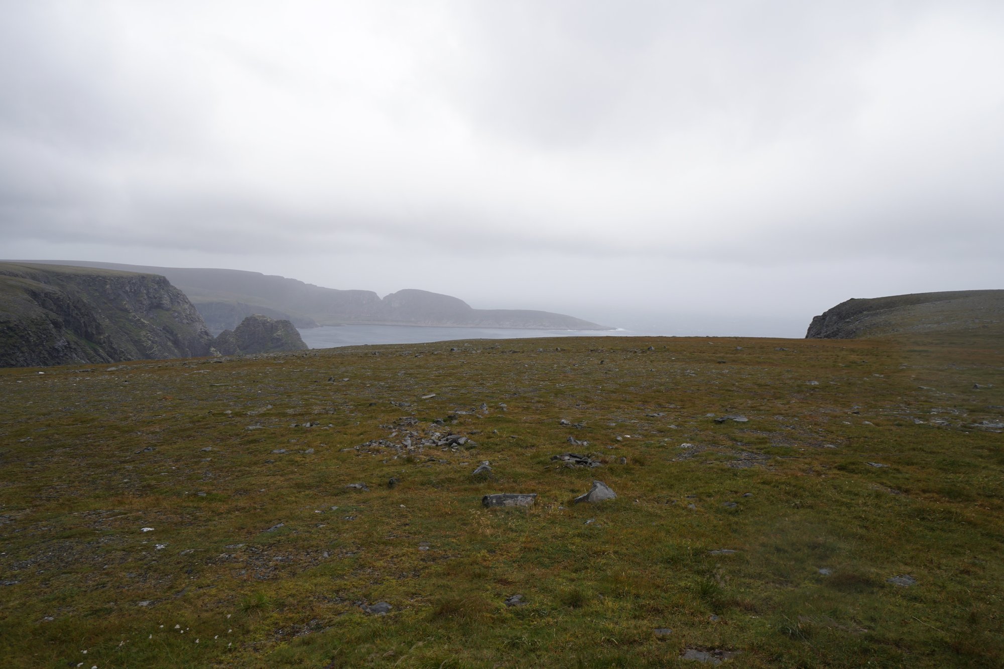 Ondertussen komt er een Noorse wandelaar terug gelopen die we een half uurtje geleden hebben zien vertrekken. We besluiten hem te vragen naar de omstandigheden. Zijn antwoord is heel duidelijk. Het pad is in enorm slechte staat door de regen van afgelopen dagen en in combinatie met de wind is het onverantwoord om de hike te doen vandaag. Daarnaast is het laatste deel van de hike – bij het noordelijkste punt – over een smal stuk land met de wilde zee rechts en links van je. Daar zal de wind nog wel een tandje heviger zijn dan hier. Je wil er niet aan denken wat er kan gebeuren als de wind je daar een zetje de verkeerde kant op duwt…