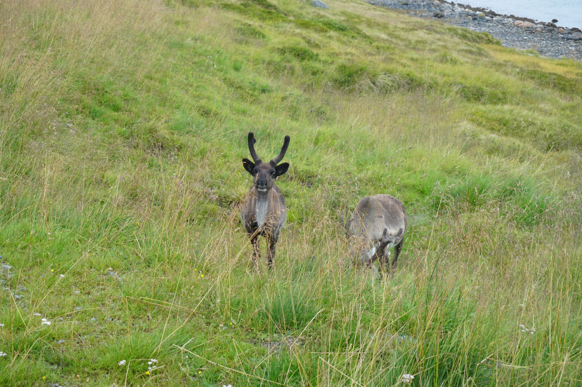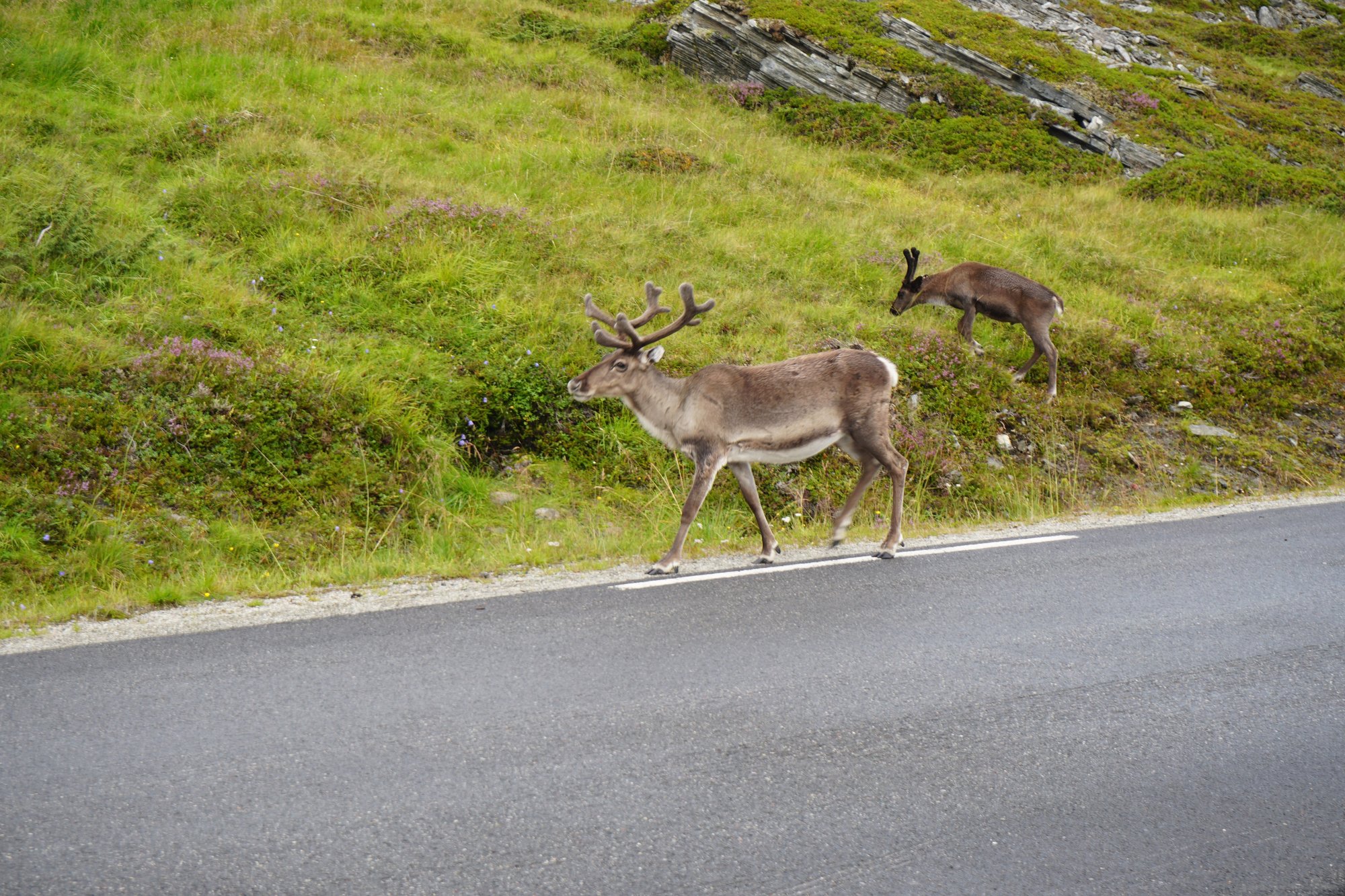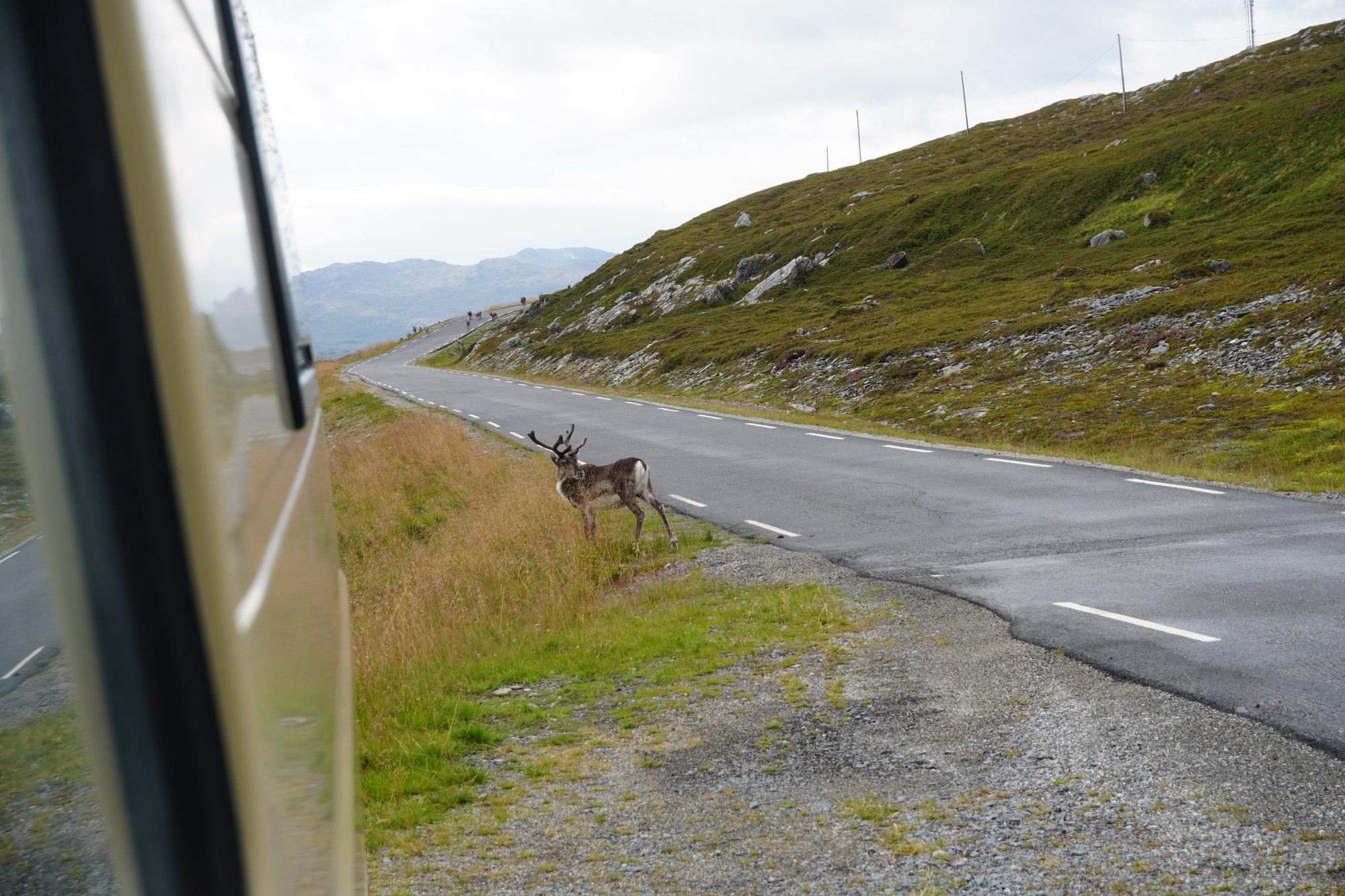 Voor een fijne, rustige wildkampeerplek nemen we aan het einde van rijdag 2 een andere afslag. Net voorbij een klein dorp vinden we een ietwat beschutte plek waar we het rijk voor ons alleen hebben. Of ja, niet helemaal blijkt de volgende ochtend. We worden gewekt door tientallen rendieren! Ze dartelen rustig voorbij de bus. Dit is nog eens leuk wakker worden!