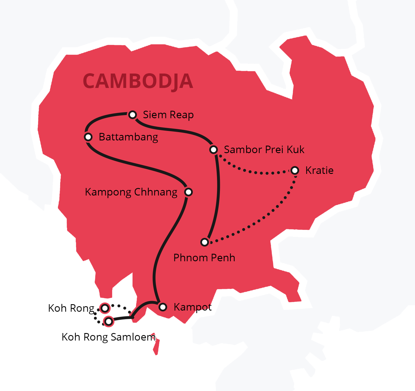 Natuurlijk kun je deze route door Cambodja nog helemaal aanpassen aan jouw voorkeuren. Heb je niet genoeg tijd om alle 7 bestemmingen te bezoeken, dan zou ik Battambang laten vallen. Wil je juist meer van Cambodja zien, dan is Kratie een leuke bestemming om aan je route toe te voegen. Houd er wel rekening mee dat je een dag in de bus moet zitten om van Phnom Penh naar Kratie te komen. Als je op zoek bent naar een goed feestje, dan zou je het eiland Koh Rong aan je route kunnen toevoegen. Hier kun je dansen op het strand tot in de late uurtjes!