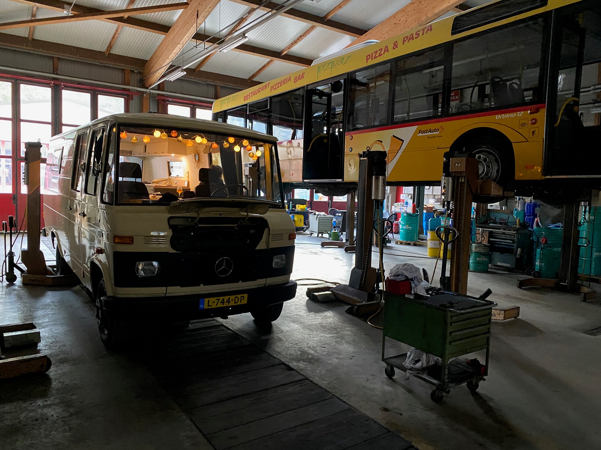 Dan komt de vraag van de garage eigenaar waar we verblijven. "In die bus!" zeggen wij in koor. Tot onze verbazing (in positieve zin) biedt hij ons aan om in Bruno in de garage te overnachten. Dan moeten we wel vroeg op de volgende dag, want de monteurs beginnen rond 7 uur, maar dan hoeven we geen andere slaapplaats te zoeken. Ideaal! We krijgen zelfs de sleutel van het pand, zodat we 's avonds nog de deur uit kunnen als we willen. Wat onwijs lief!