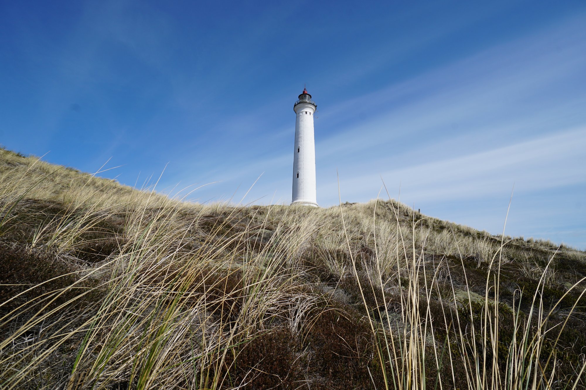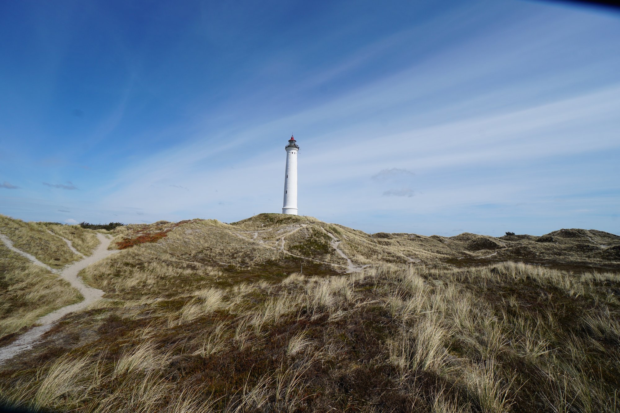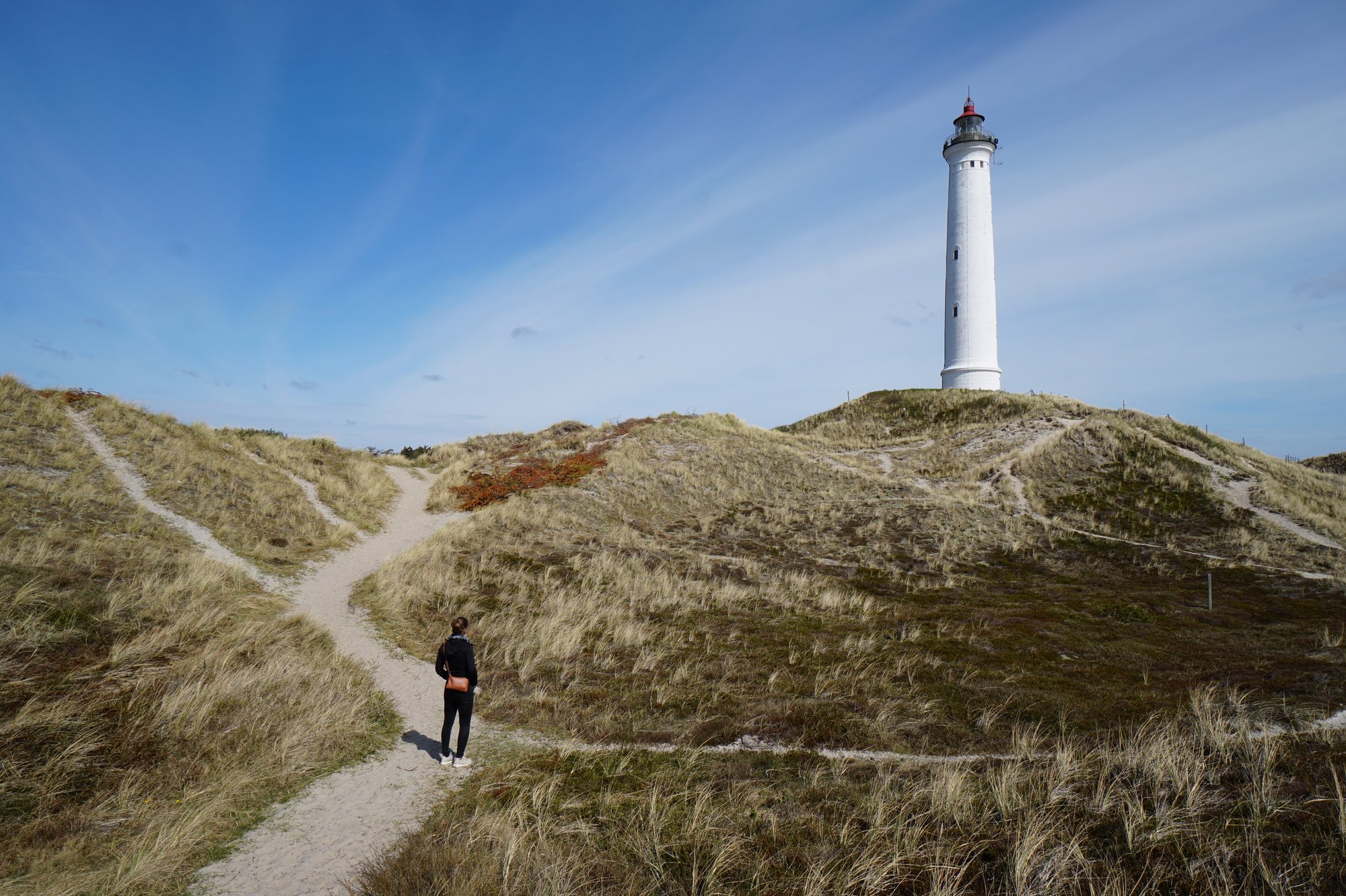 Hvide Sande is een bijzondere plek, omdat het een smalle strook land is met aan de ene kant de Noordzee en aan de andere kant een meer genaamd Ringkøbing Fjord. De weg naar Hvide Sande gaat door een mooi duinlandschap en is al de moeite waard! Wij maken een tussenstop in Hvide Sande en lopen door het stadje naar het strand, maar voor ons mist het wat sfeer. Er is ook behoorlijk wat industrie hier en dat maakt het allemaal wat minder aantrekkelijk. We blijven dus maar even en rijden dan door naar onze laatste bezienswaardigheid voor vandaag: Lyngvig Fyr.