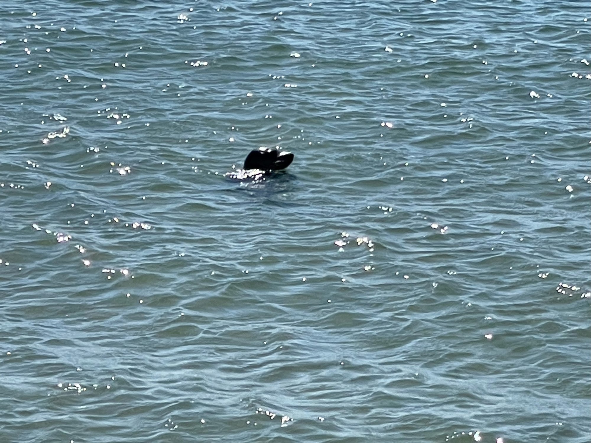Ook nu banjeren we vanaf de parkeerplaats een heel stuk door het losse zandstrand om bij het punt te komen waar het om gaat. In de verte zien we al dat de golven hier tegen elkaar botsen en vol verwachting lopen we die kant op. Onderweg zien we nog een paar zeehondjes die op een meter of 3 van de kust aan het zwemmen zijn. Leuk!