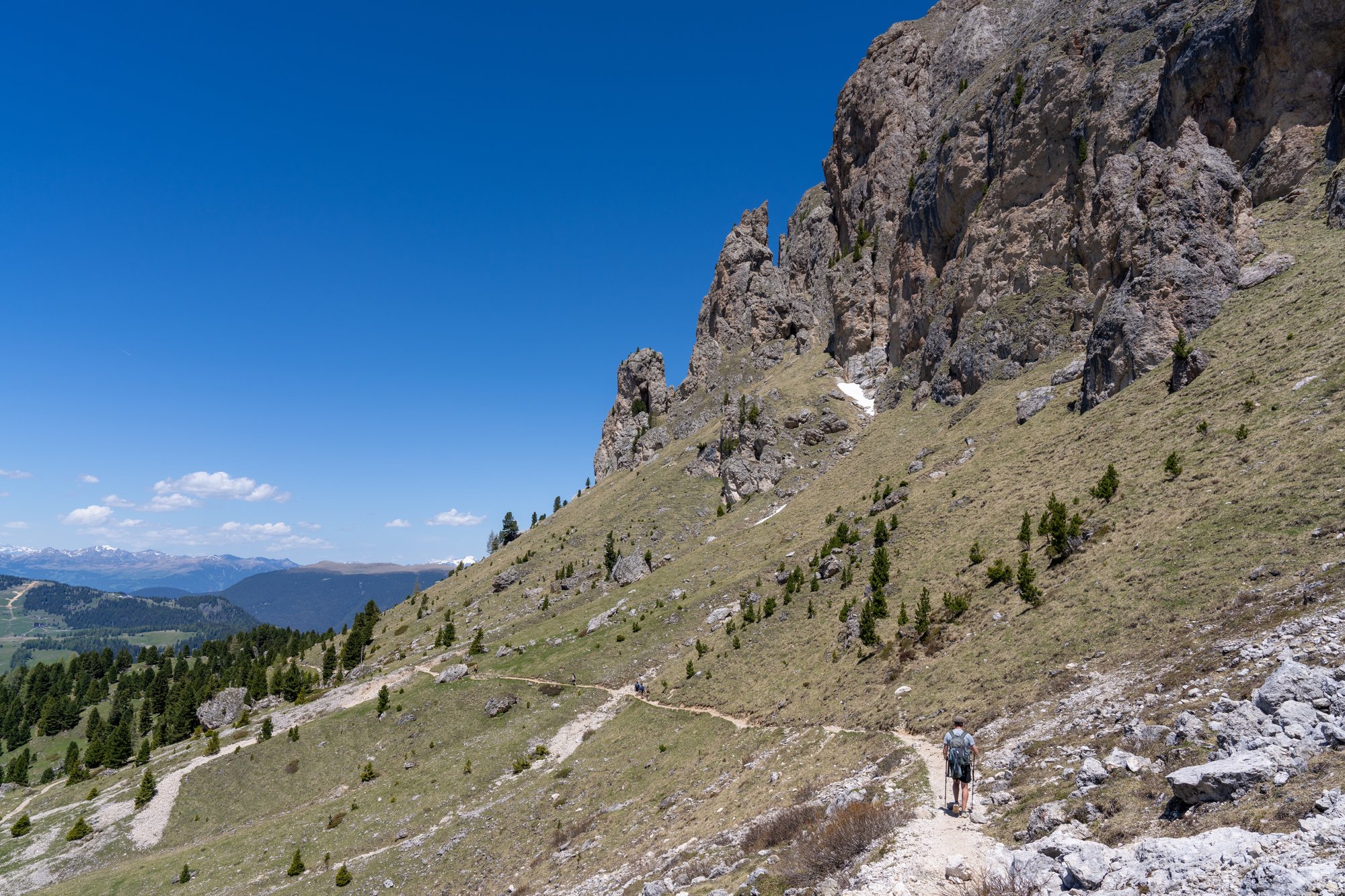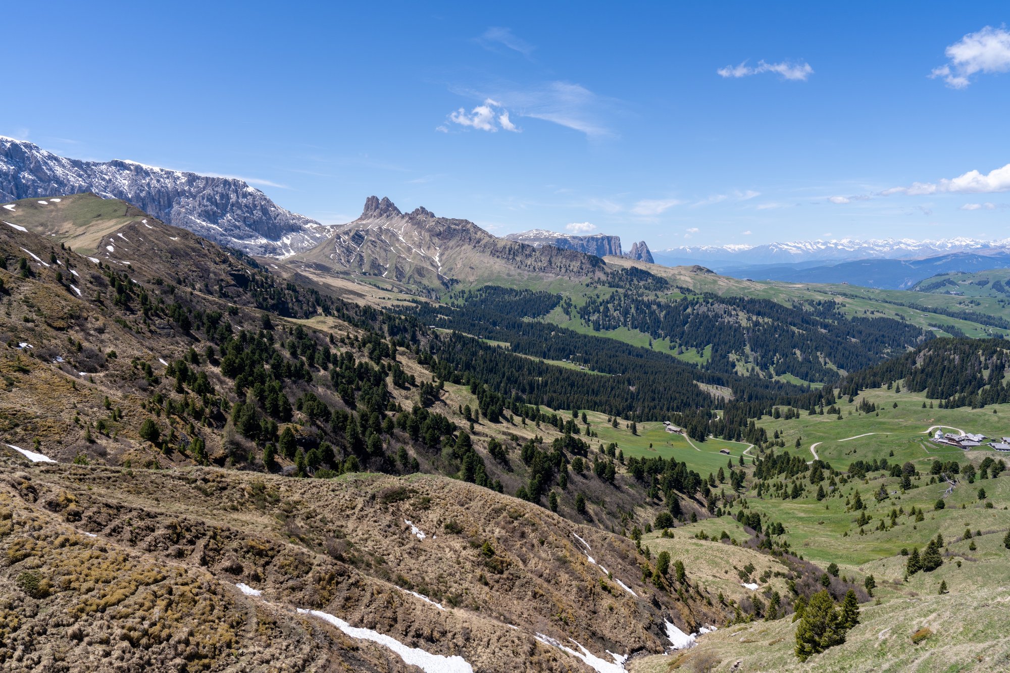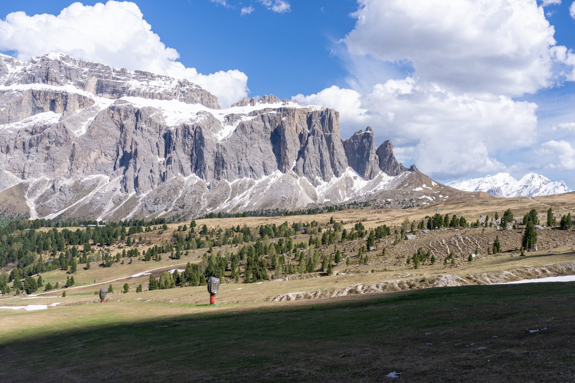 Zodra het pad ons verder van de Langkofel bergwand leidt, wordt het landschap minder interessant. Vanaf de Emilio Comici Hütte domineren dor gras - de hele winter bedekt onder (nep)sneeuw? - en skiliften opnieuw het landschap. Aan de overkant ligt nog wel een stoere bergketen met veel sneeuw, dus we focussen ons daar maar op, terwijl we onszelf pushen om de laatste kilometers te volbrengen.