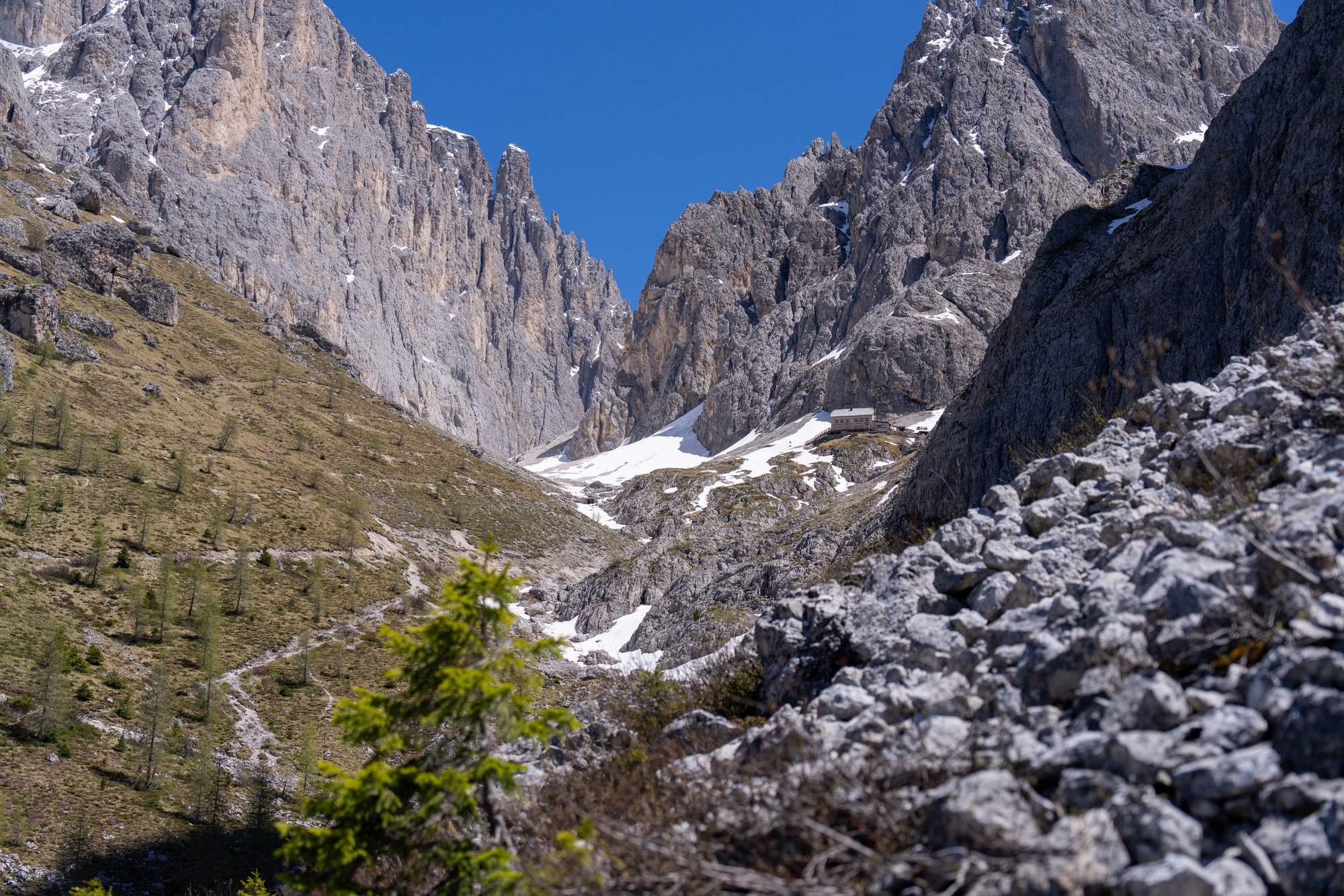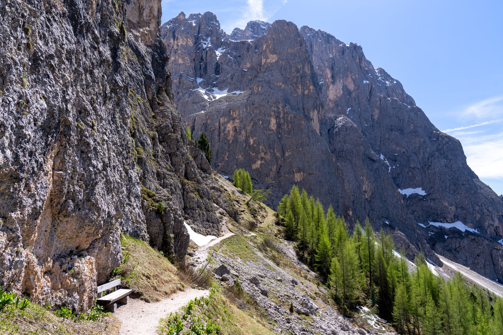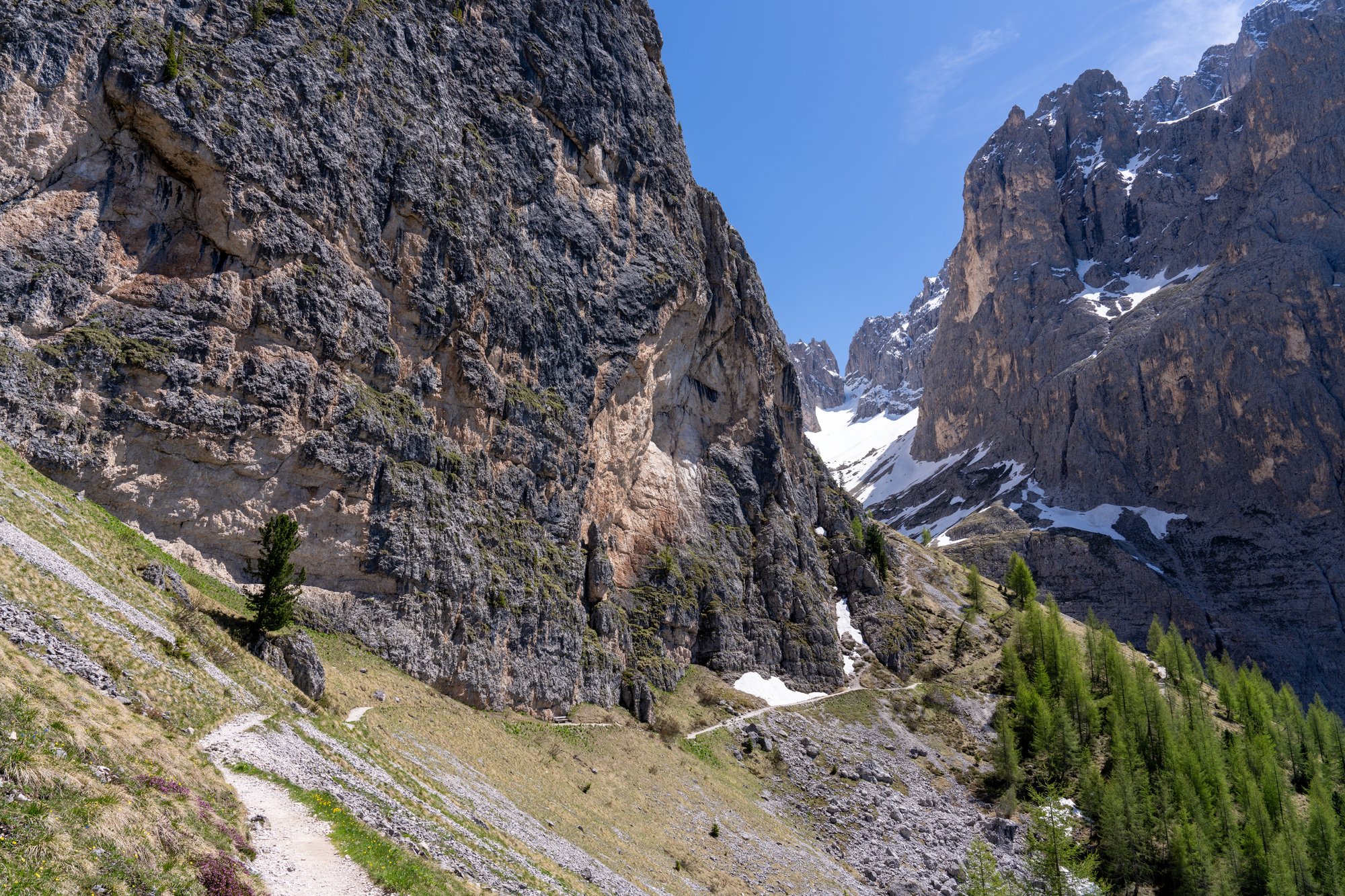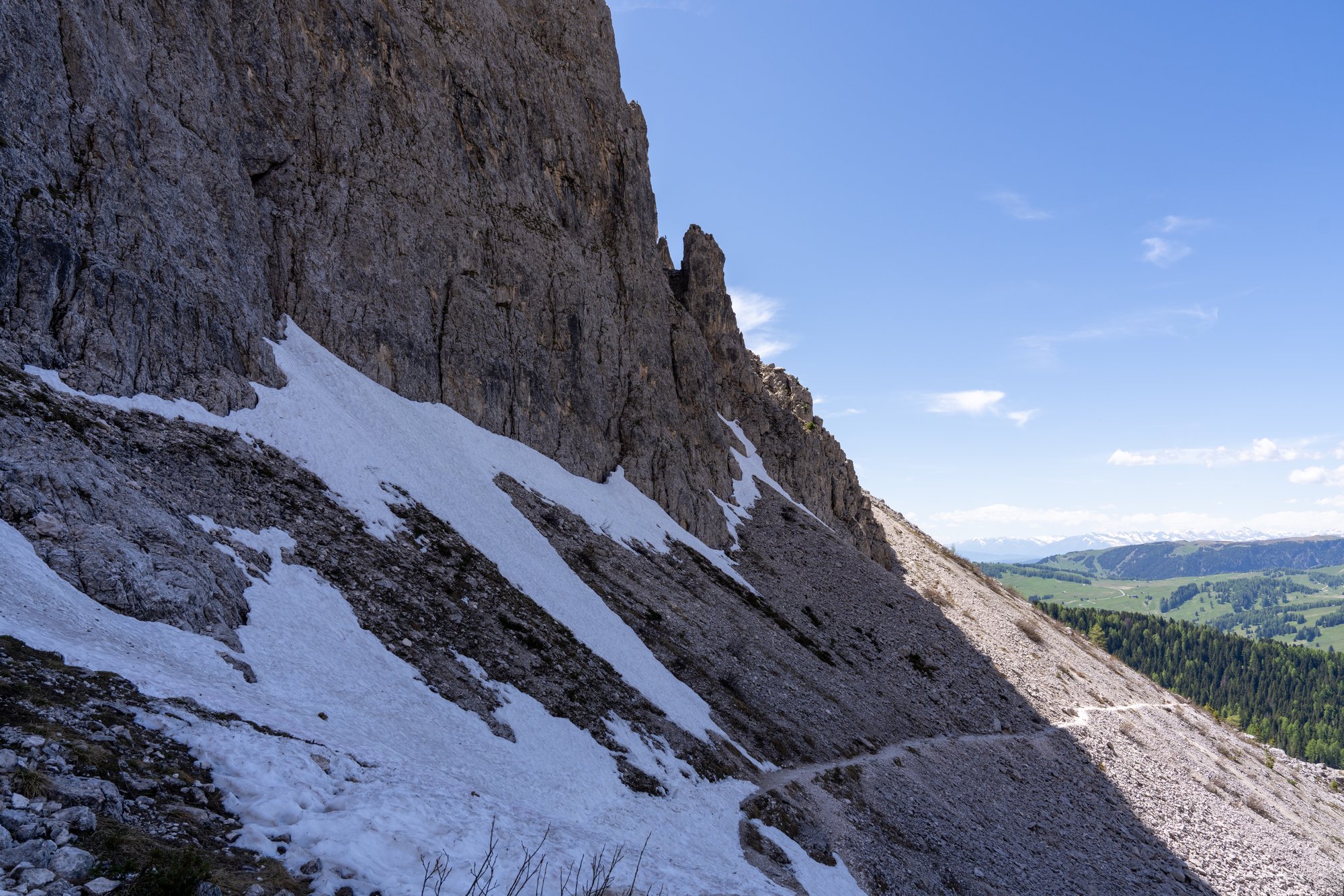 Toch proberen we zoveel mogelijk te genieten, want dit zijn tot nu toe duidelijk de mooiste kilometers van deze hike. Na een tijdje komt de spleet tussen Sassolungo en Sasso Piatto (Plattkofel in het Duits) in ons zicht. Deze spleet zagen we de afgelopen dagen al van een afstandje, maar nu van dichtbij. Er ligt nog erg veel sneeuw hier, waardoor we geen detour maken naar Rifugio Vicenza / Langkofelhütte. Deze hut is trouwens ook nog dicht - met zo’n lastig begaanbaar pad is dat goed te begrijpen. Zelfs vanaf hier is het uitzicht op de spleet en de ruige pieken indrukwekkend.