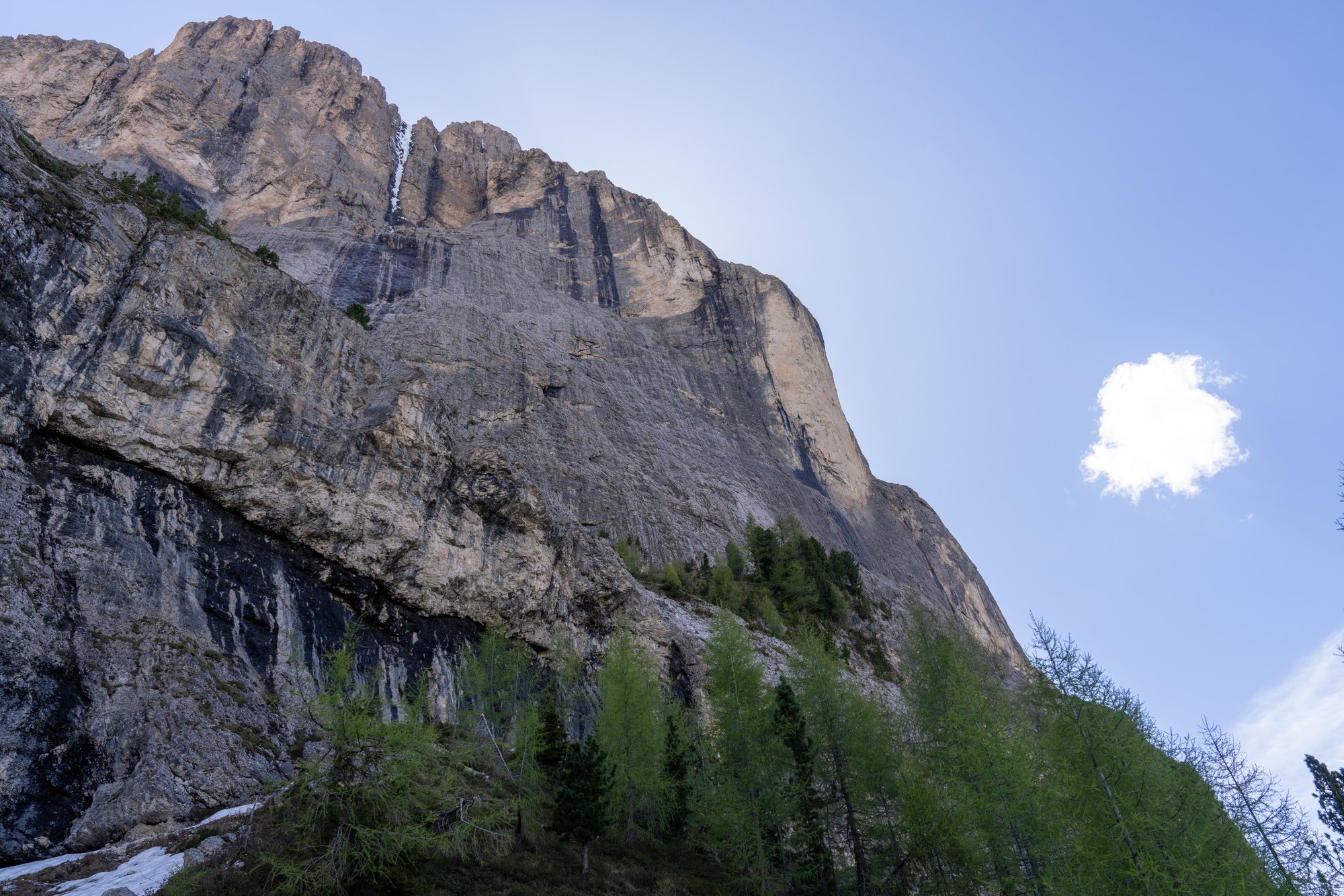Nu we ons aan de noordkant van Sassolungo bevinden, komen we af en toe nog wat sneeuwresten tegen. Gelukkig zijn er op de meeste hellingen met sneeuw al duidelijke voetstappen die we kunnen volgen. We blijven lopen en lopen, maar deze hike wil maar niet vlotten. Stiekem maak je ook behoorlijk wat hoogtemeters, want het pad is bijna nooit vlak.