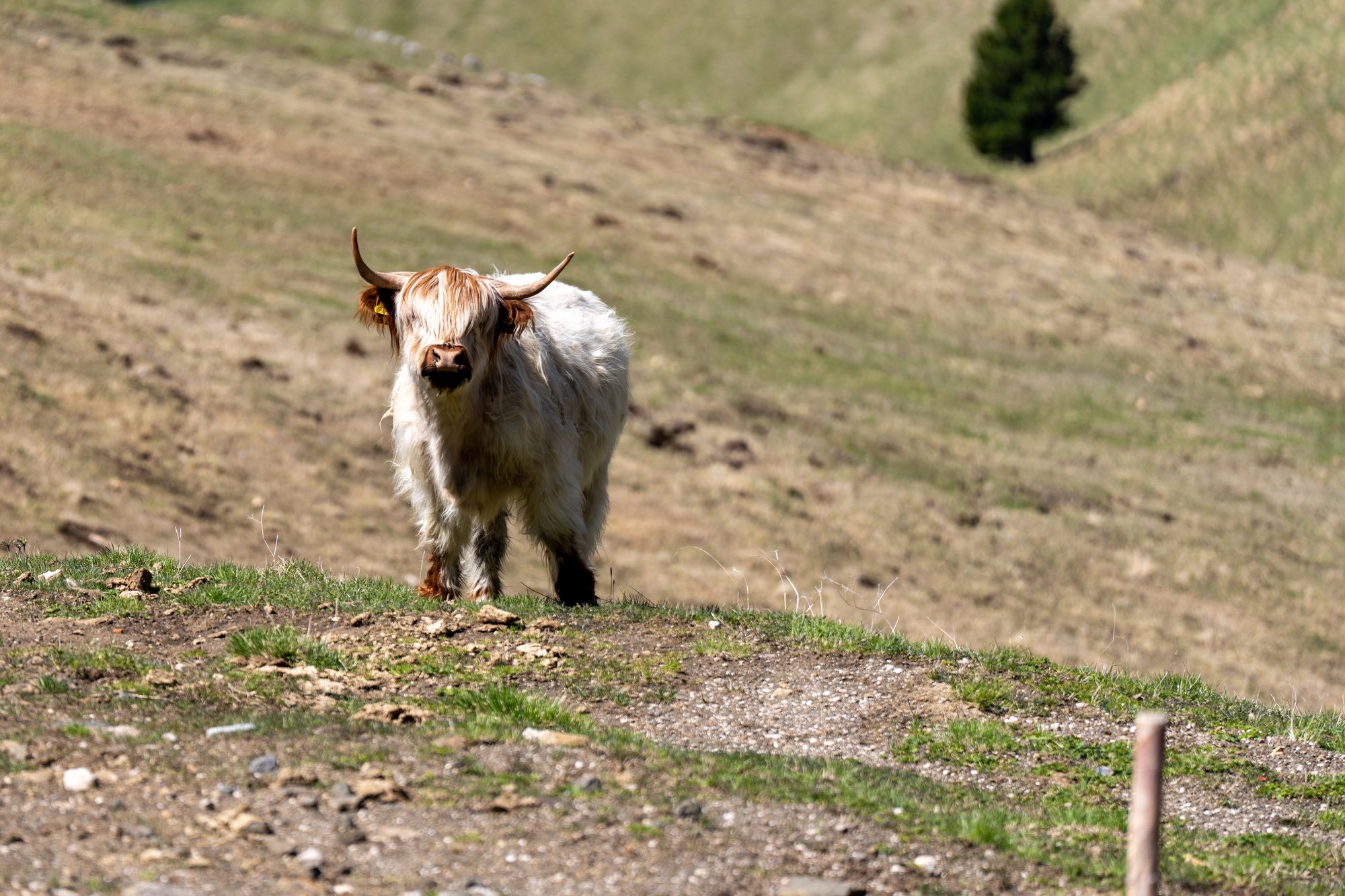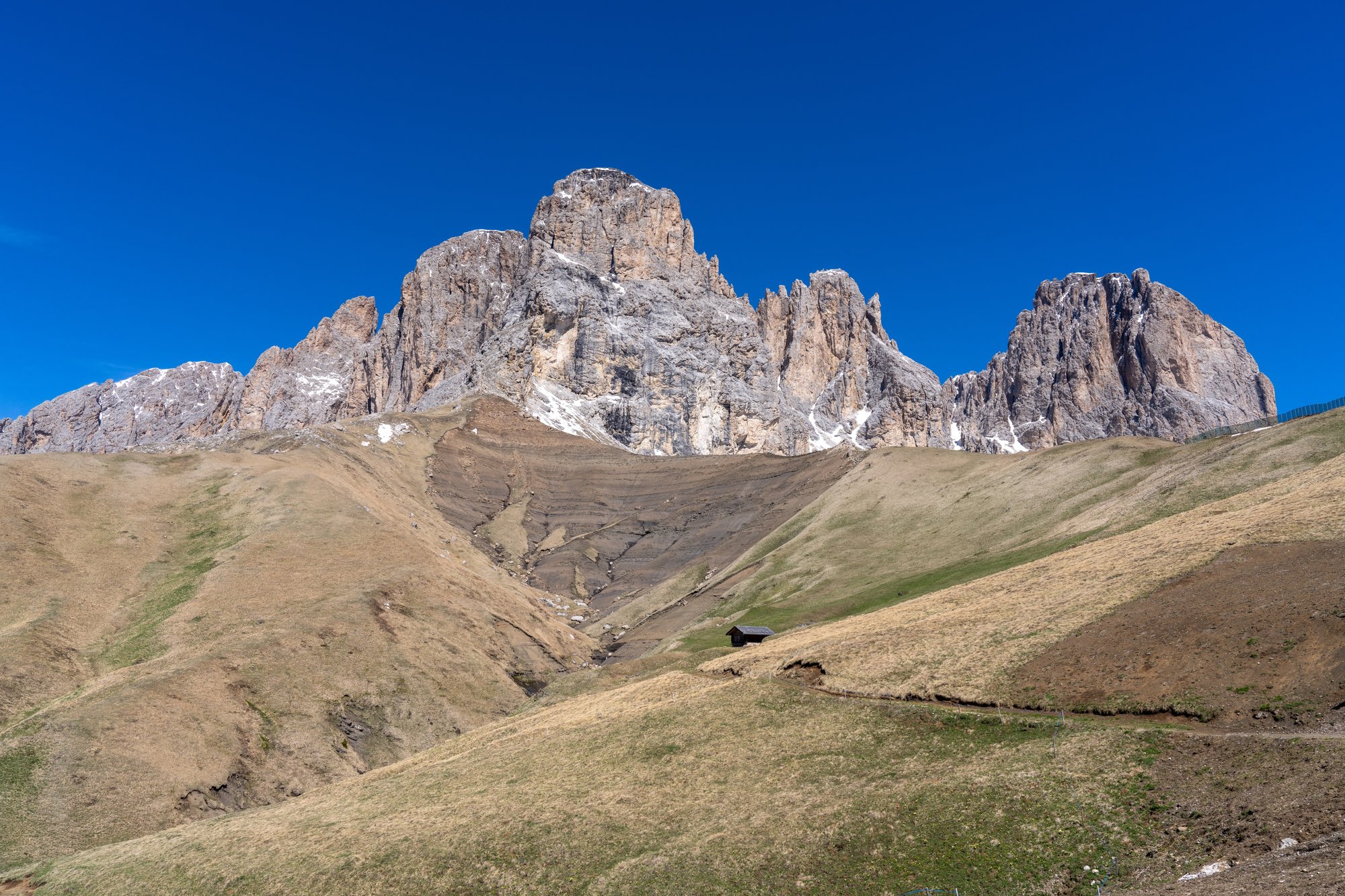 De eerste kilometers worden we verre van omvergeblazen door de trail. We beginnen met een klim over een breed grindpad, tussen dor gras en onder verlaten skiliften. Deze kant van de Sassolungo is niet bepaald inspirerend. Vanaf de Friedrich August Hütte (die nog gesloten is begin juni) vlakt het pad af en wordt het glooiend, maar de omgeving is nog altijd niet zo aantrekkelijk.