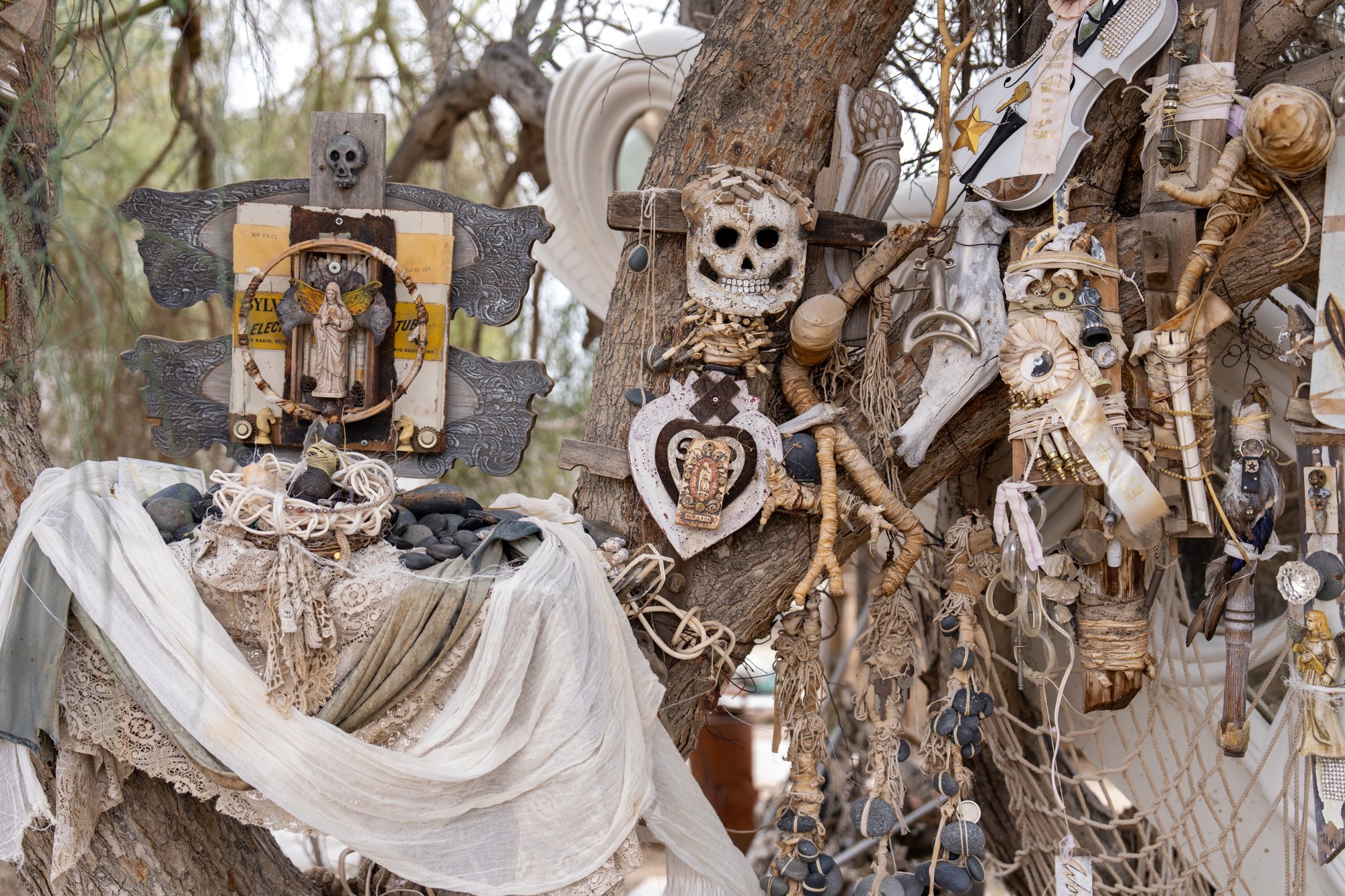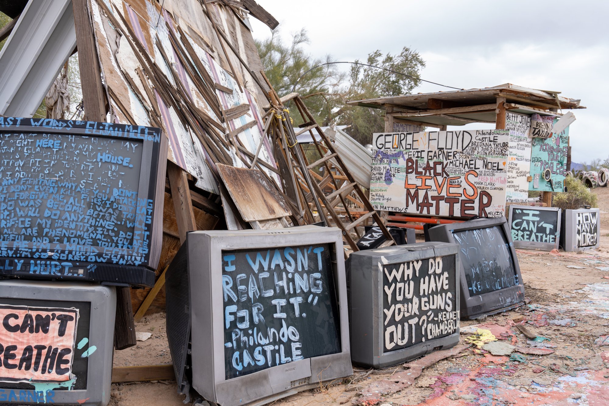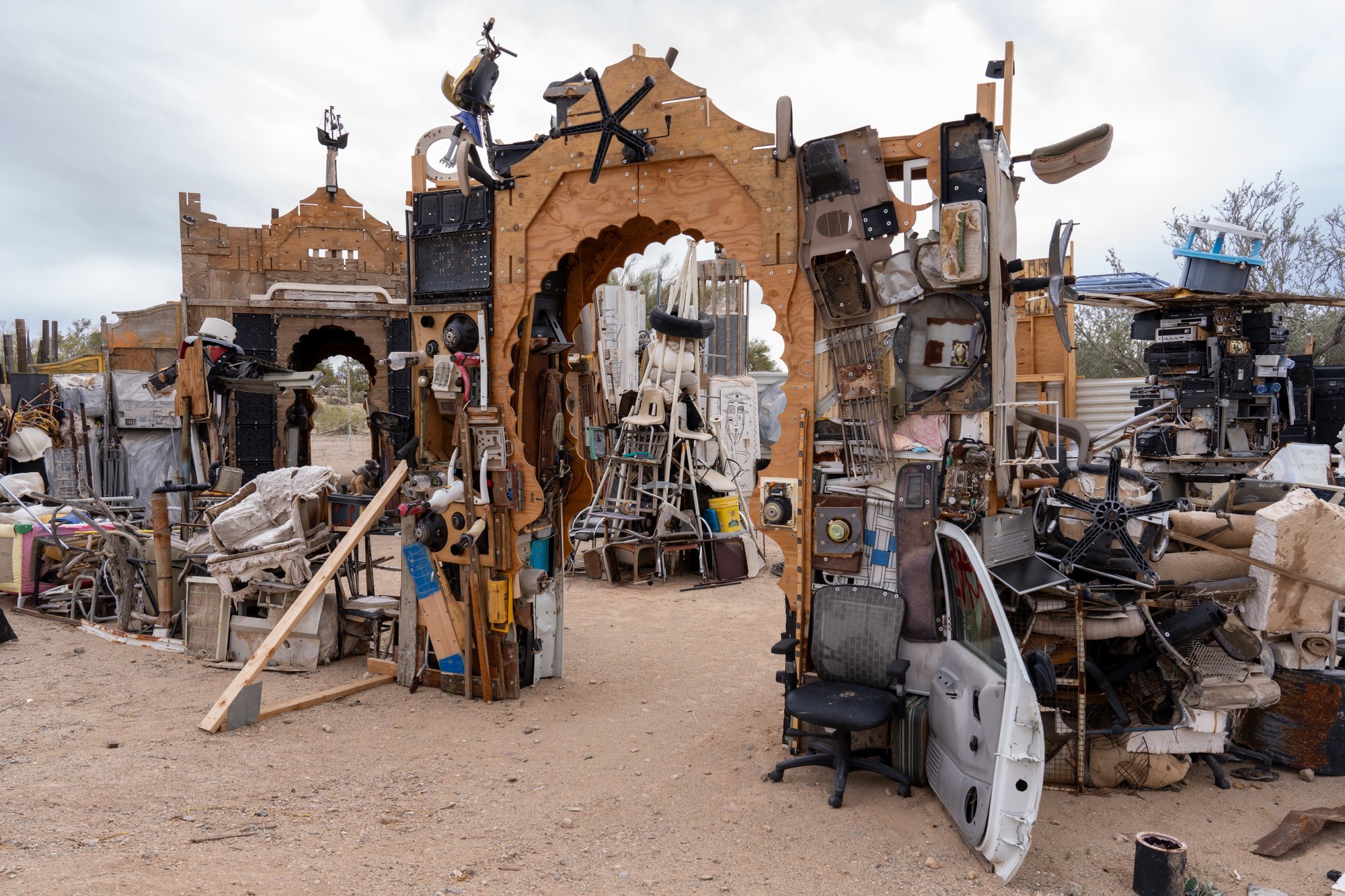 Eén van de soort van toeristische locaties in Slab City is East Jesus. We hebben geen idee wat we moeten verwachten, maar dat zien we vanzelf. East Jesus blijkt een soort openluchtmuseum te zijn met absurde kunst gemaakt van afval. Van oude tv’s tot blikjes en flessen, werkelijk alles wordt hier verwerkt in een kunstwerk. Simpel gezegd is het een samenraapsel van heel veel en dat leidt dan gek genoeg toch weer tot iets van samenhang en een arty sfeer.