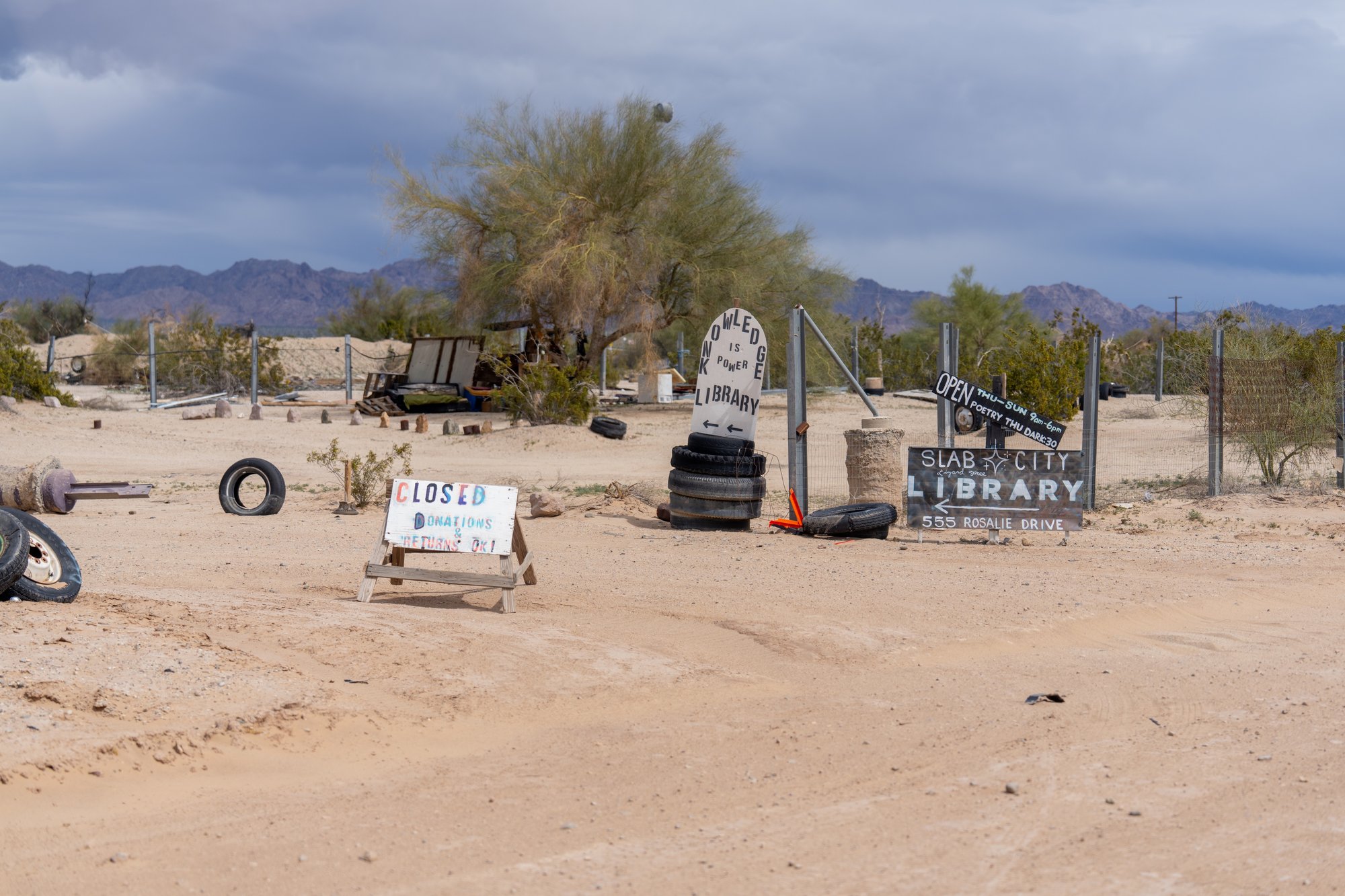 Na ons bezoek aan East Jesus willen we nog naar de bibliotheek. Dat schijnt ook een aparte ervaring te zijn. Om bij de Slab City Library te komen, moeten we door de kern van The Slabs rijden en nu wordt ons duidelijk dat dit echt een gemeenschap in het klein is. Er is een camping, een internetcafé, een plek om spullen te ruilen en zelfs een hostel.