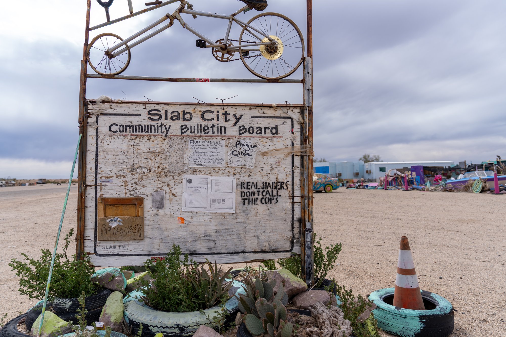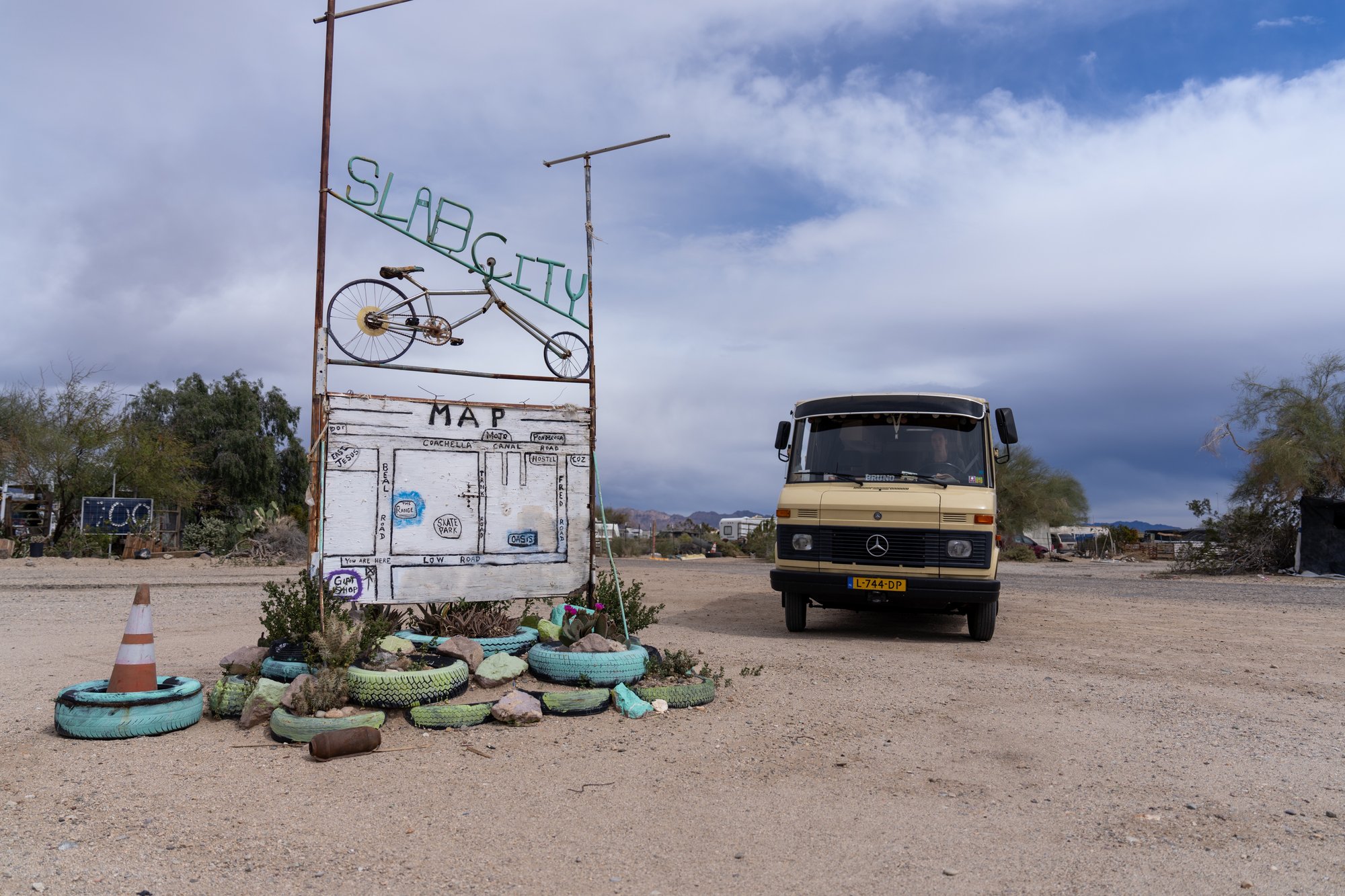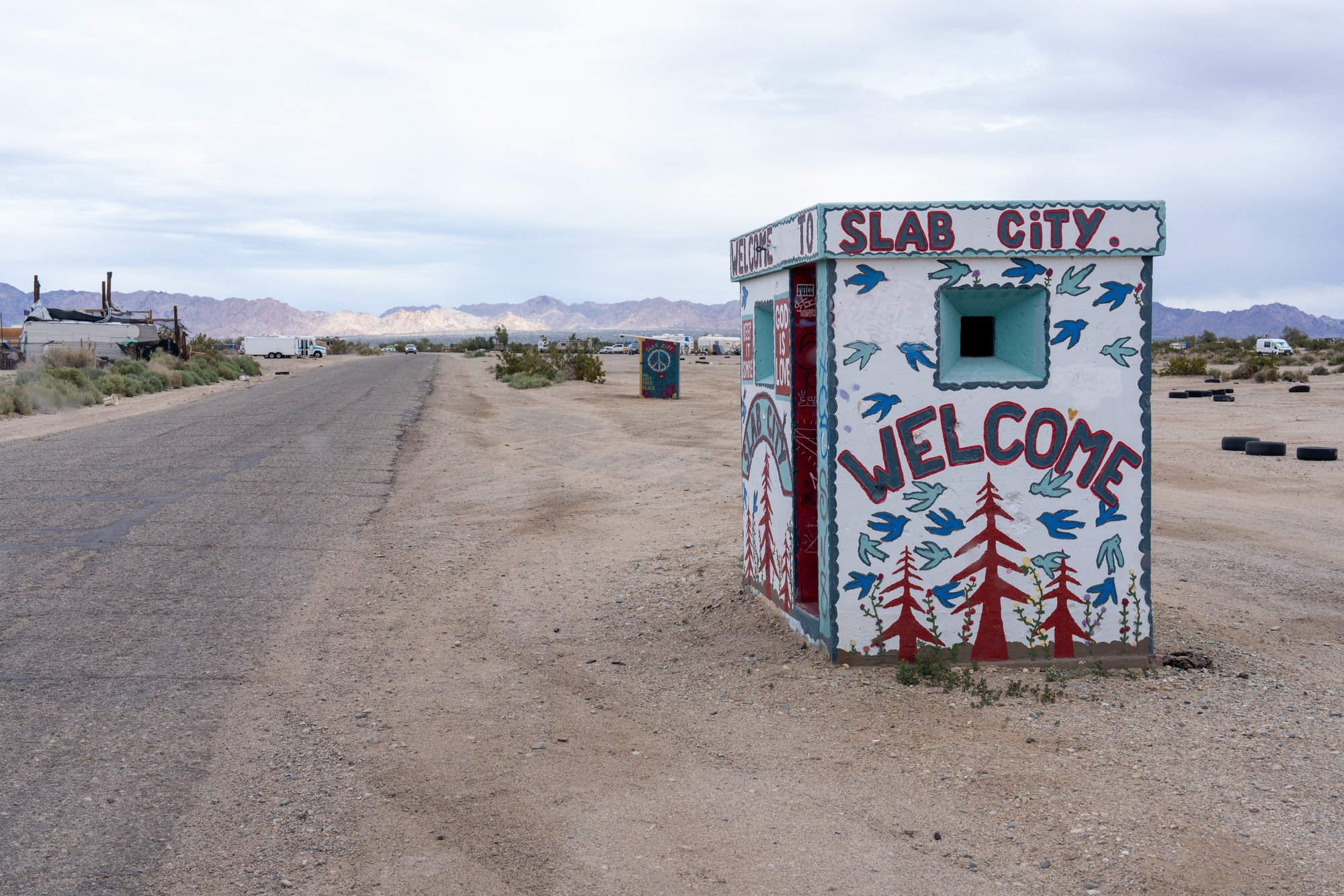 In de verlaten, kale en meedogenloze woestijn van Californië ligt Slab City. Ooit deed deze locatie dienst als Camp Dunlap voor het Amerikaanse leger, maar sinds 1961 is de plek niet meer op die manier in gebruik. Wat overbleef van Camp Dunlap waren grote betonnen platen in de woestijn. (Slabs is de Amerikaanse term voor deze betonnen platen.) In eerste instantie gingen medewerkers van de chemische fabriek in de omgeving hier tijdelijk wonen in hun caravans en campers en langzaamaan ontstond zo een gemeenschap van camperaars en andere vrijheidszoekers.