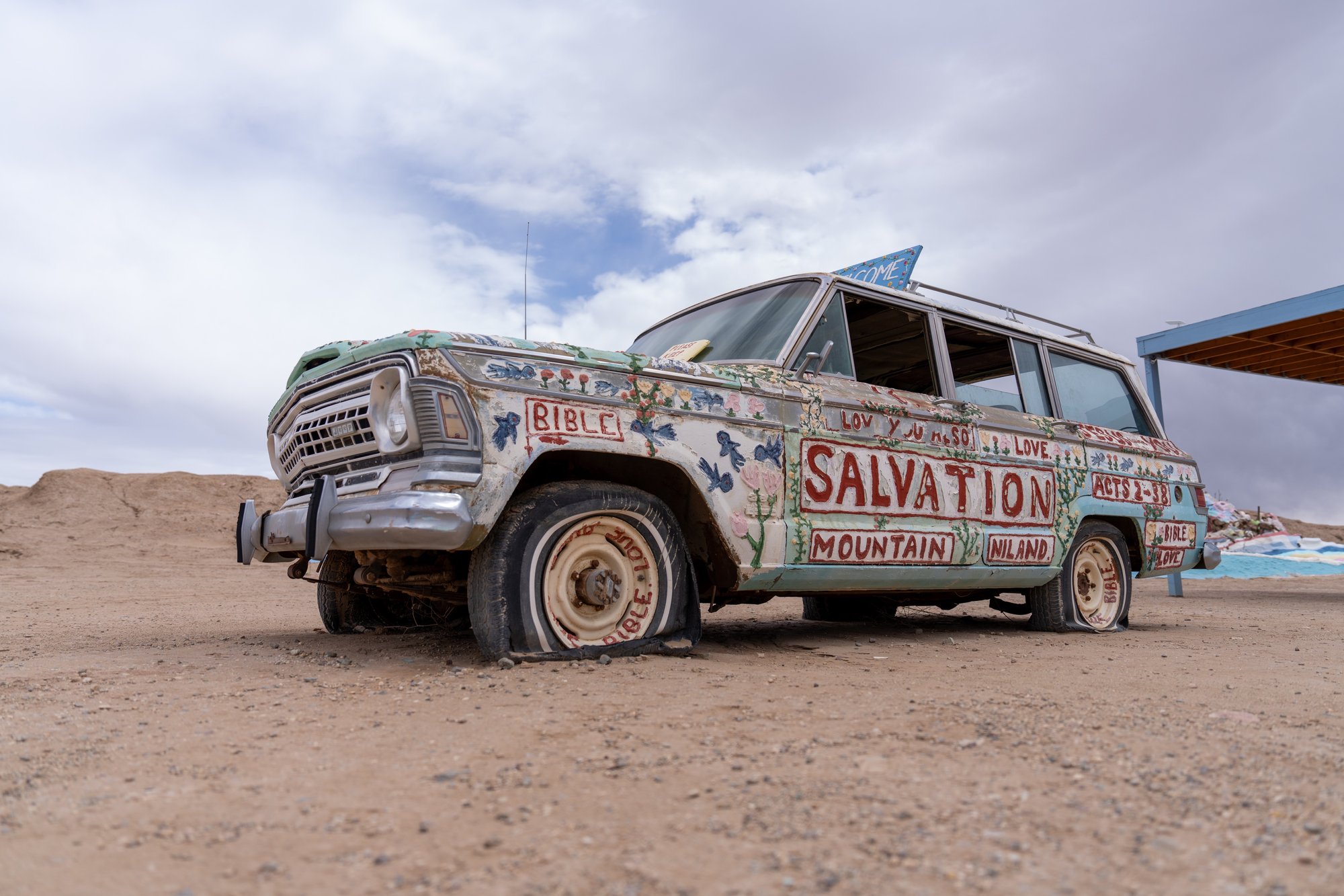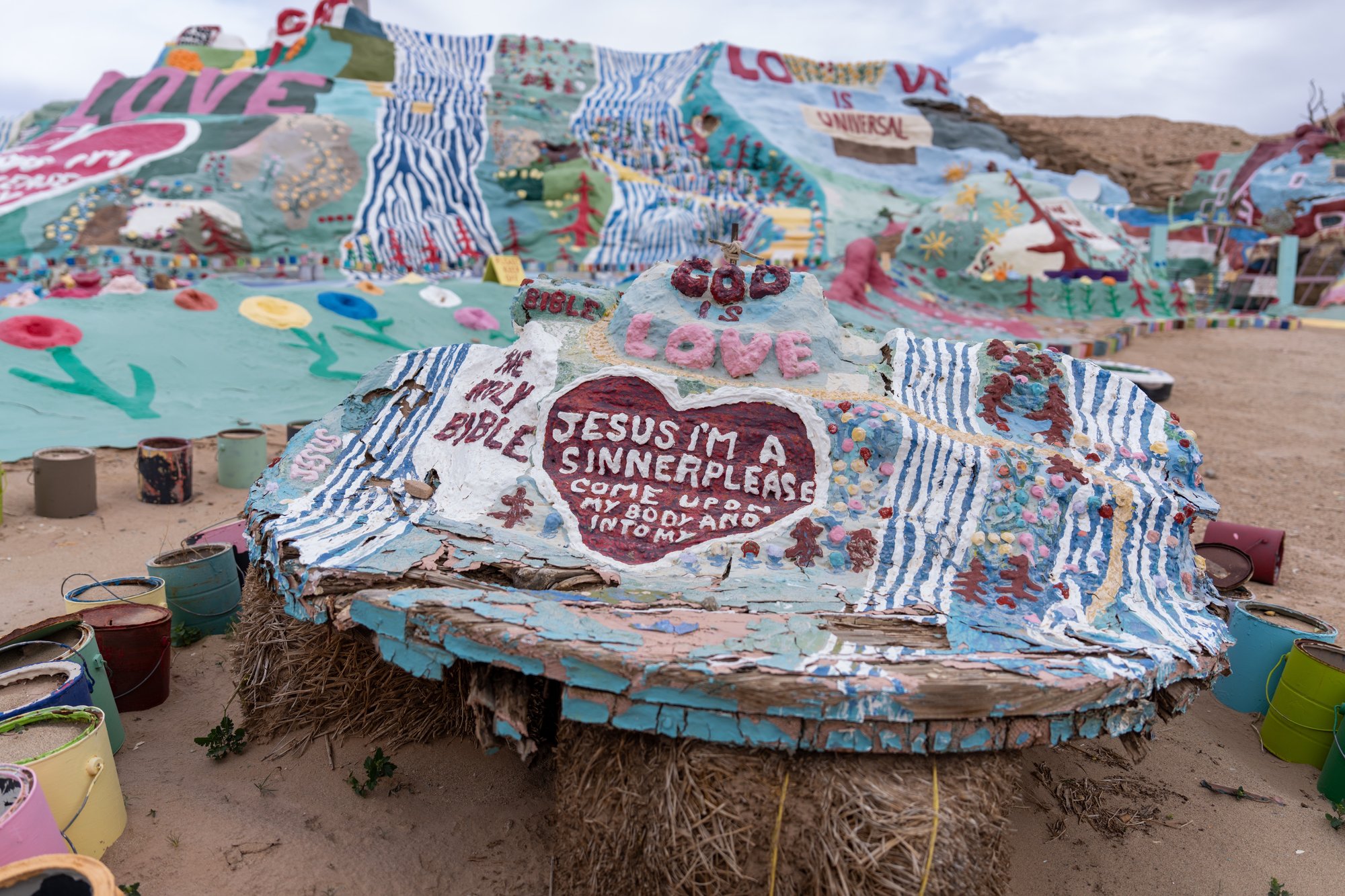 Iets voordat we Slab City bereiken, maken we een stop bij Salvation Mountain. Deze kleurrijke blikvanger kun je niet missen. Salvation Mountain is een heuvel vol met verf, spreuken en tekeningen. Leonard Knight startte het project Salvation Mountain in 1984 en wijdde er zijn verdere leven aan. Salvation Mountain heeft een gelovige insteek, maar daar hebben we ons niet in verdiept. Wij wilden hier gewoon een kijkje nemen!