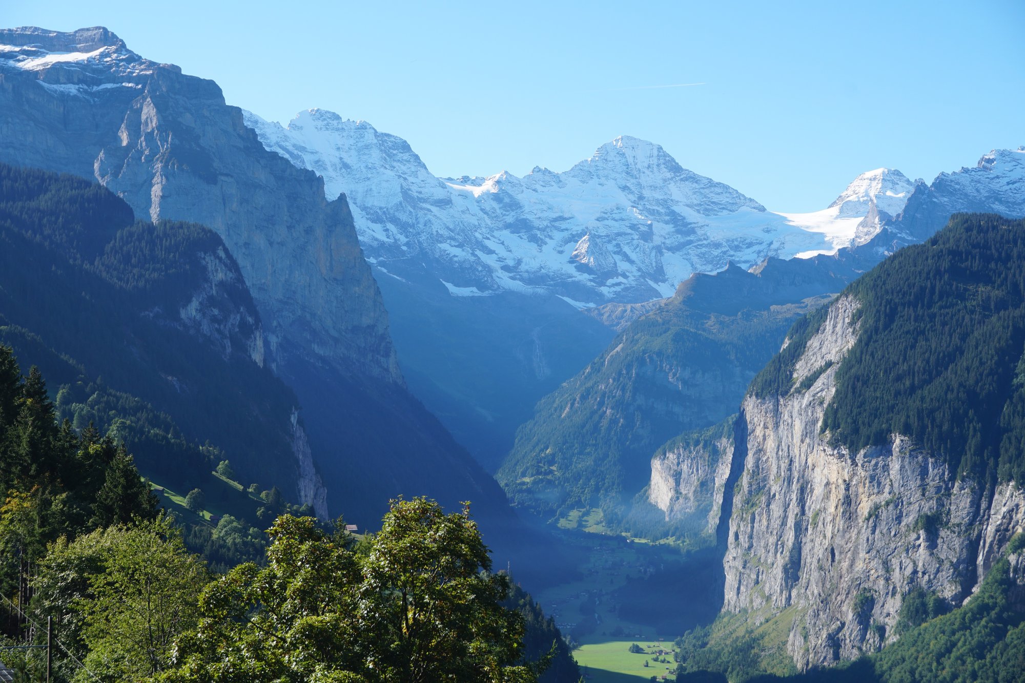En dat terwijl het op onze eerste dag in Lauterbrunnen bewolkt is. Op dat moment hebben we nog geen idee dat dit gebied nóg mooier is. Gelukkig komen we daar een dag later alsnog achter. De lucht is kraakhelder, de zon schijnt en ineens komen daar de besneeuwde bergtoppen van 4.000 meter hoog tevoorschijn. Wauw, wauw, wauw! Deze vallei bezorgt ons kippenvel en niet alleen omdat het koud is!
