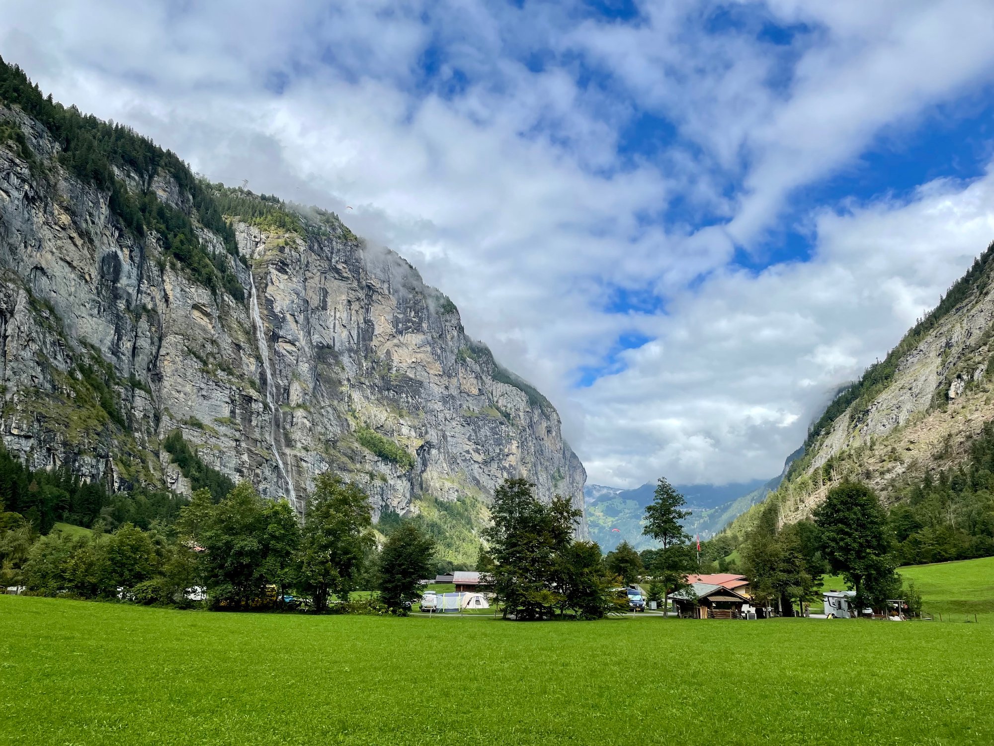 Dat blijkt totaal onterecht. Als we het dal bij Lauterbrunnen in rijden, valt onze mond open. Dit is net een droom. Een paradijs voor natuur-, waterval- en bergliefhebbers. De vallei is enorm groen met kleine, lieflijke dorpen en wordt omgeven door enorme, steile, kale bergwanden. Overal om je heen zie je watervallen. Het is waanzinnig!