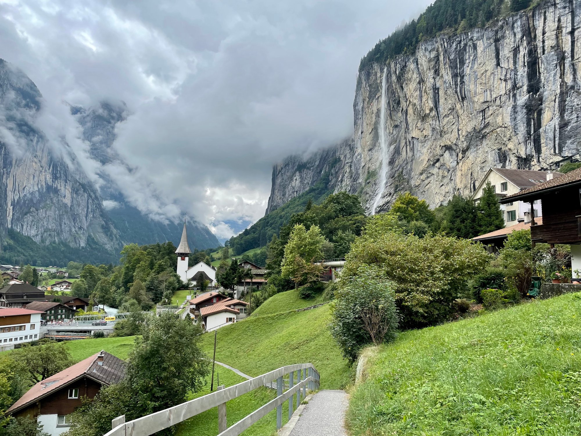Als je dé Lauterbrunnen foto wil maken, dan wil je het lieflijke kerkje, de steile rotswanden én de Staubbachfall erop hebben. Fotogenieker dan deze plek wordt het niet snel!