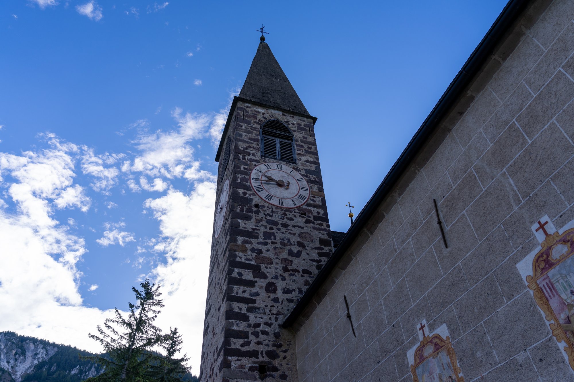 De beste manier om al dit moois op je in te laten werken én langs de beste fotospots te komen, is door het wandelen van de Santa Maddalena Panorama Trail. Dat is dan ook precies wat wij vandaag gaan doen! We zijn er al vroeg, want de weersverwachting is ‘s ochtends goed, maar ‘s middags regenachtig. Nadat we Bruno rond 9 uur hebben geparkeerd op dit gratis parkeerterrein in het dorp, lopen we direct naar de kerk. Het is een kleine klim, want het kerkje ligt iets hoger dan het centrum van Santa Maddalena. Niet erg, want daardoor krijg je gelijk een beter zicht op het hele landschap. Niet verkeerd!