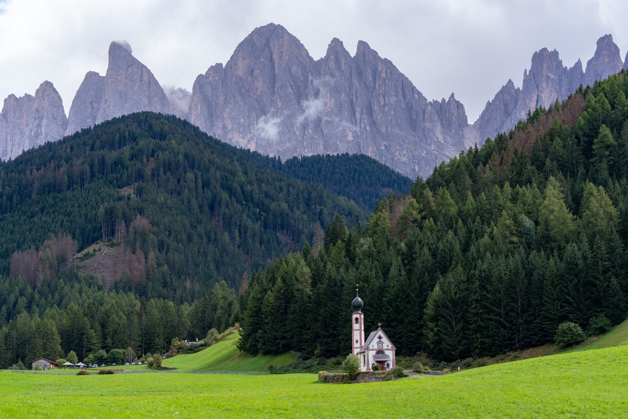 Vlakbij Santa Maddalena ligt nog zo’n prachtig kerkje: St. Johann in Ranui. Deze kerk is opvallend door zijn barokstijl en de ligging. De kerk staat in een groot, open grasveld met geen enkel ander gebouw in de buurt. Je kunt de kerk niet (meer) vrij bezoeken, maar je kunt wel gratis naar de fotospot gaan. Dat is de enige plek waar je goed over de hoge schutting kunt kijken en foto’s kunt maken. Dat was voor ons meer dan genoeg, want vanaf hier heb je zicht op het totaal van kerk, weiland, bos en bergen. Wij zijn eigenlijk niet per se liefhebbers van kerken, maar in dit landschap vinden we het ineens wel heel leuk!