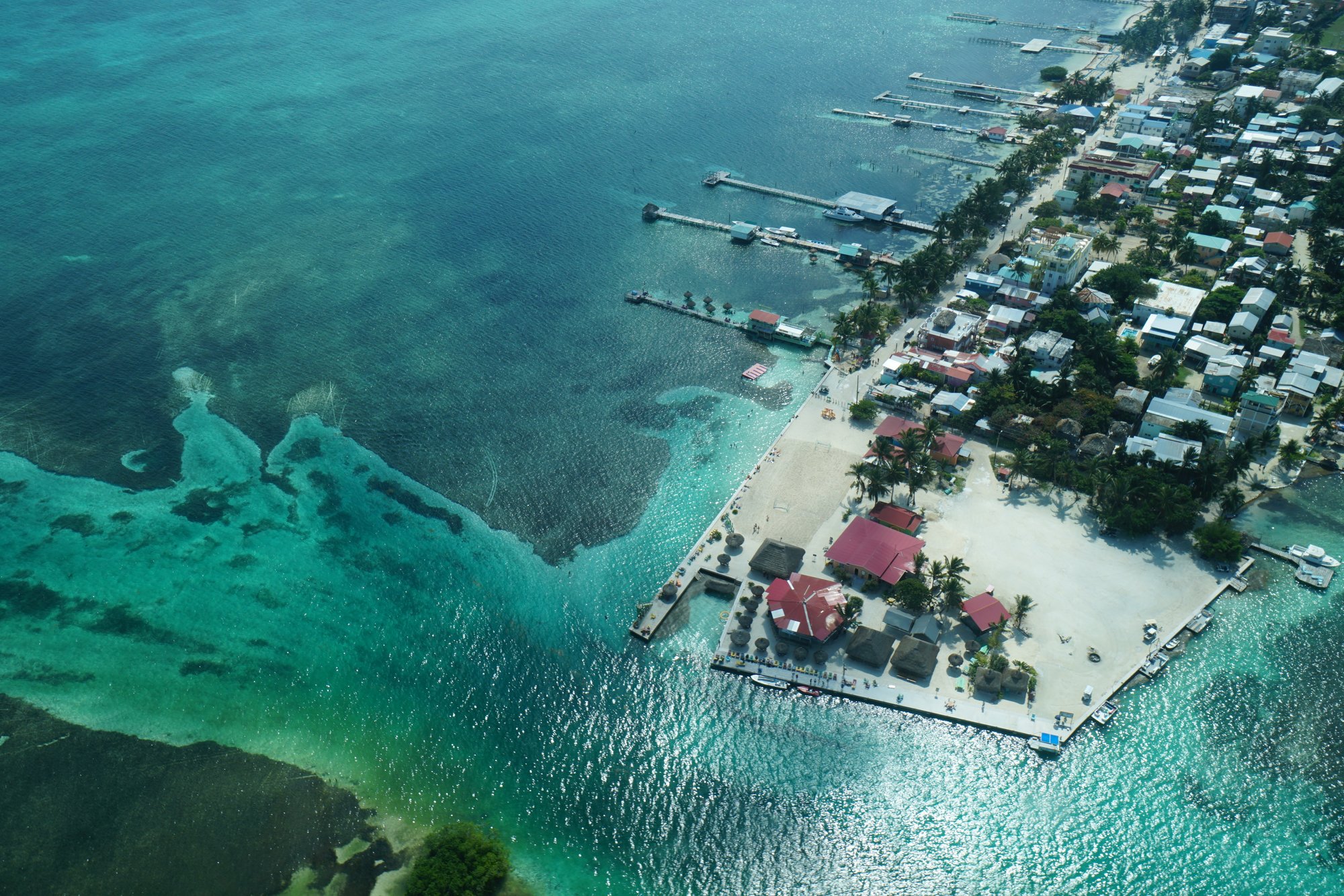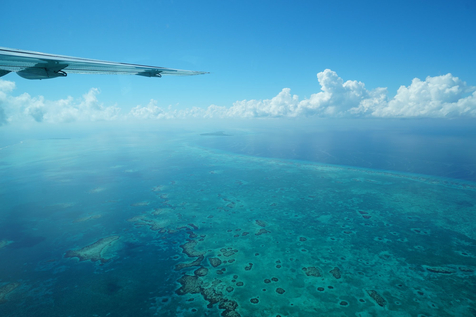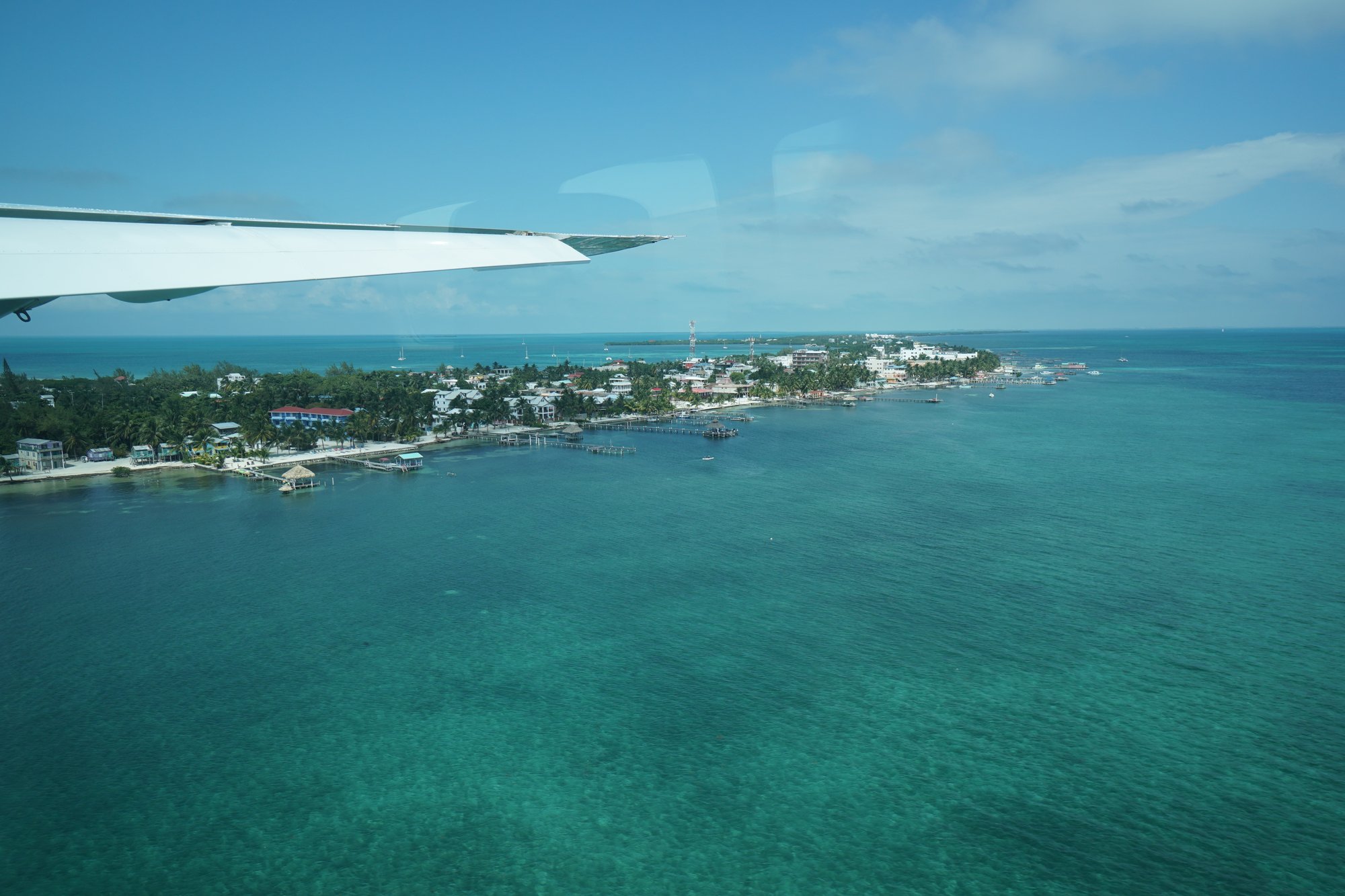 Een beetje wiebelig stijgen we op en zien we het eilandje Caye Caulker onder ons steeds kleiner worden. We spotten The Split en al snel vliegen we over het nabijgelegen koraalrif in het Caye Caulker Marine Reserve. Het water is zo helder dat we ondanks onze hoogte met gemak tot de bodem kunnen kijken. De verschillende kleuren blauw in het water zorgen nu al voor fantastische plaatjes en dan moet het beste nog komen!