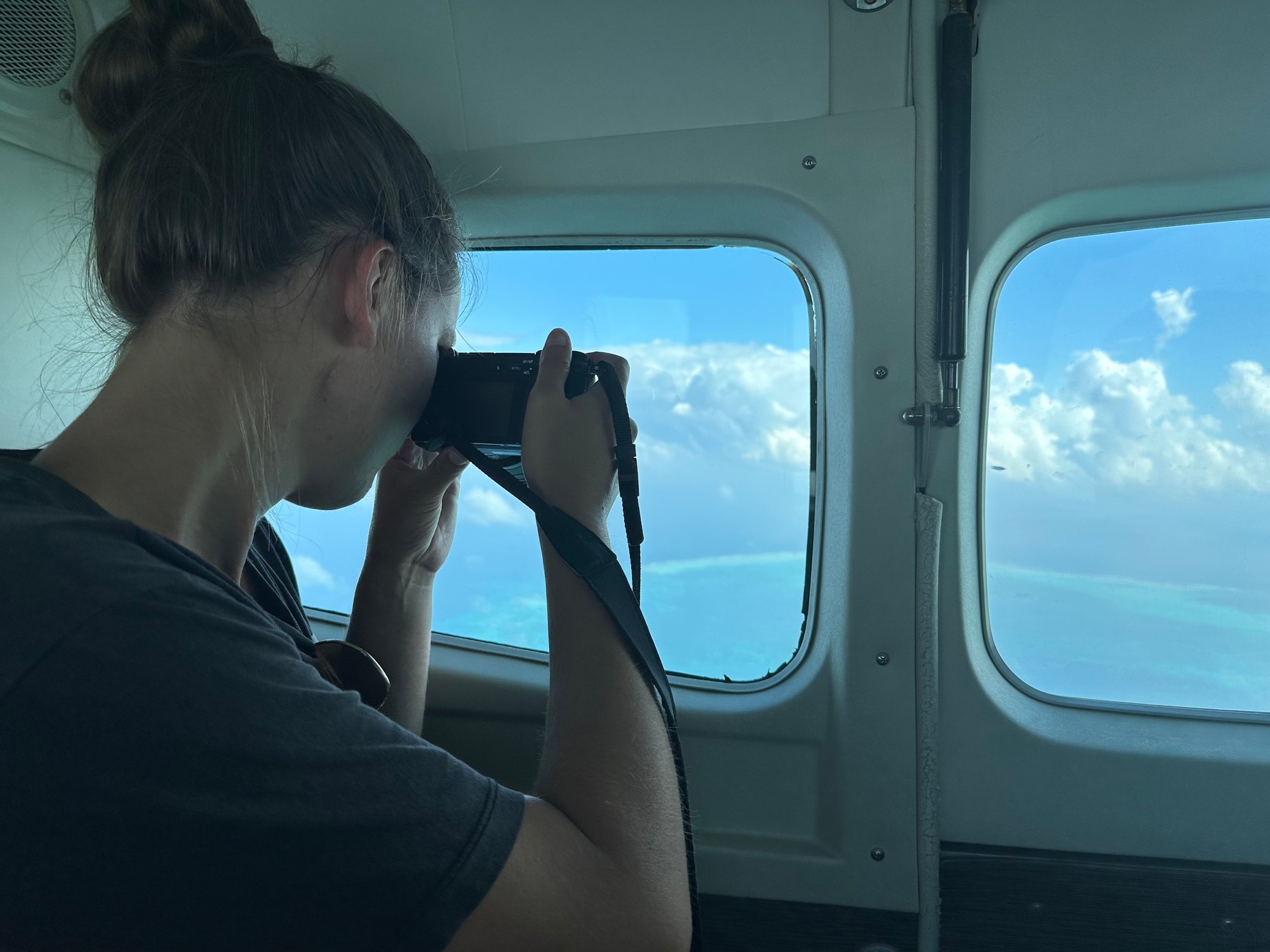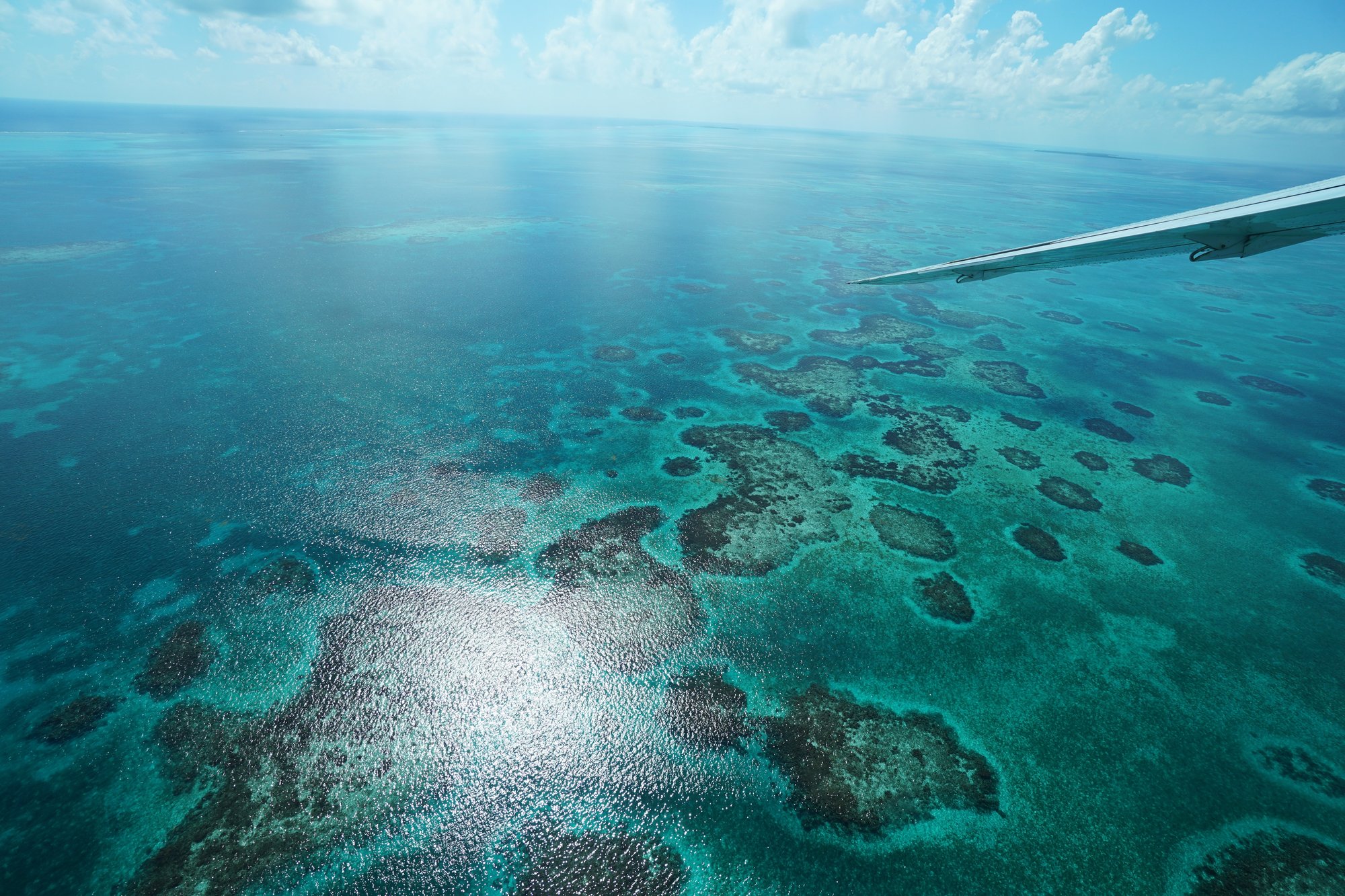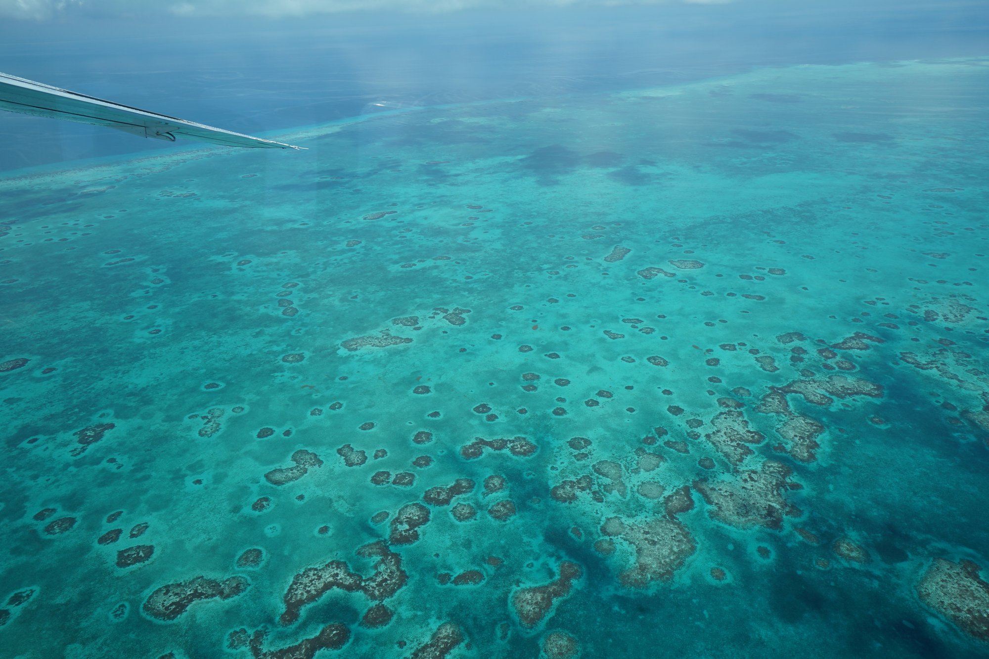 Een beetje wiebelig stijgen we op en zien we het eilandje Caye Caulker onder ons steeds kleiner worden. We spotten The Split en al snel vliegen we over het nabijgelegen koraalrif in het Caye Caulker Marine Reserve. Het water is zo helder dat we ondanks onze hoogte met gemak tot de bodem kunnen kijken. De verschillende kleuren blauw in het water zorgen nu al voor fantastische plaatjes en dan moet het beste nog komen!