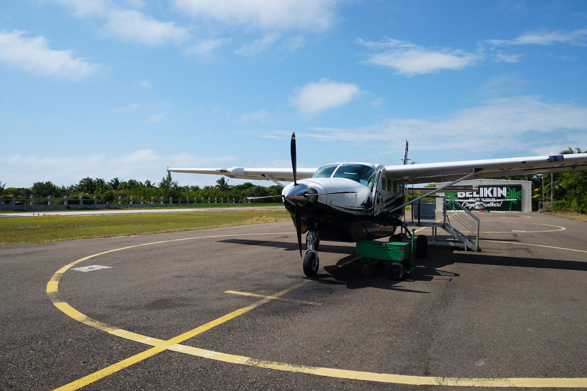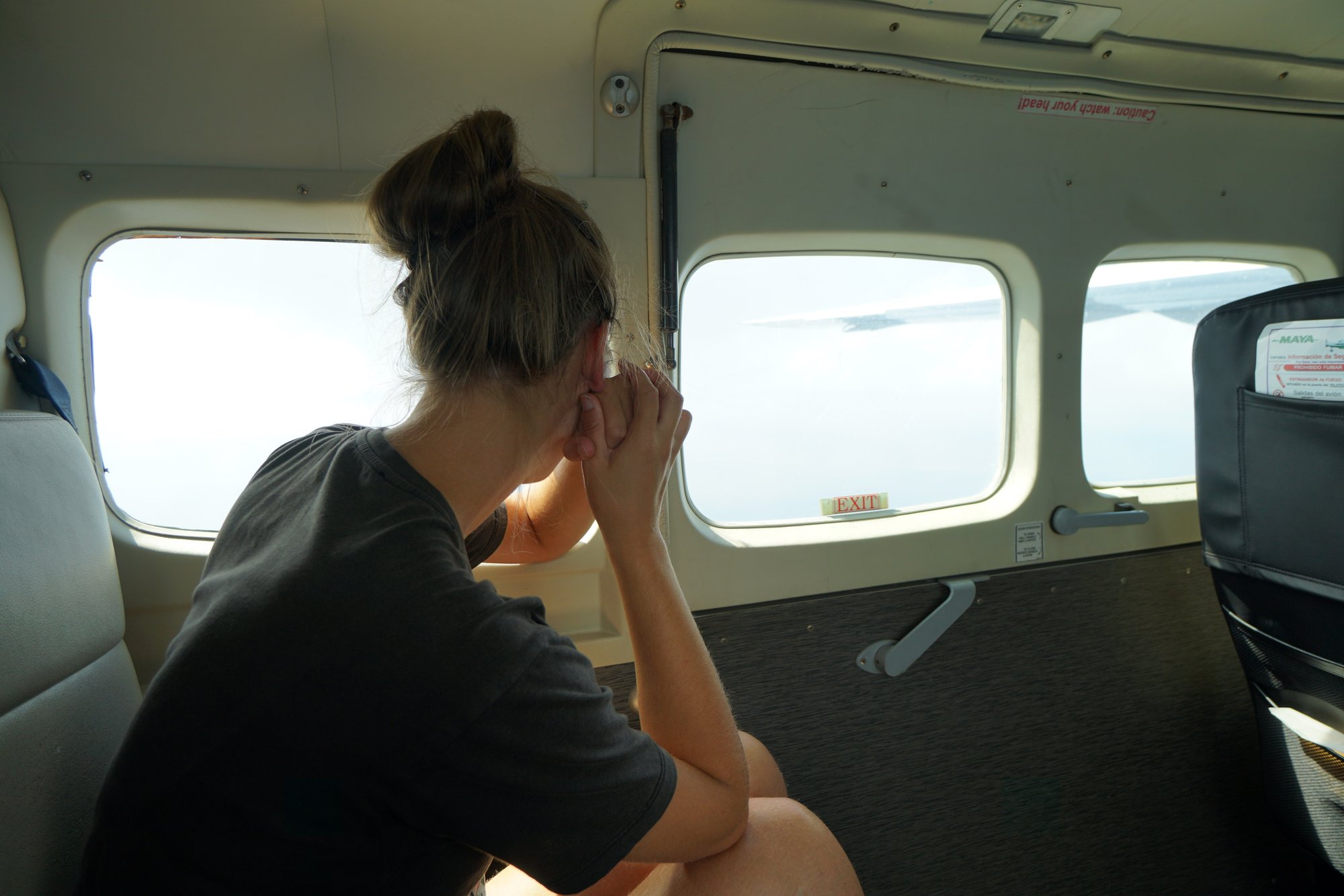 Een half uurtje voor de geplande vertrektijd lopen we naar het Caye Caulker vliegveld. We voelen kriebels in onze buik. Ons lichaam voelt dat we iets speciaals gaan doen! We staan te trappelen om de lucht in te gaan en om kwart over 10 is het zover. We stappen in het kleine vliegtuigje en bemachtigen een goede plek achterin. Je zit altijd aan het raam trouwens, dus daarover hoeven we ons geen zorgen te maken.