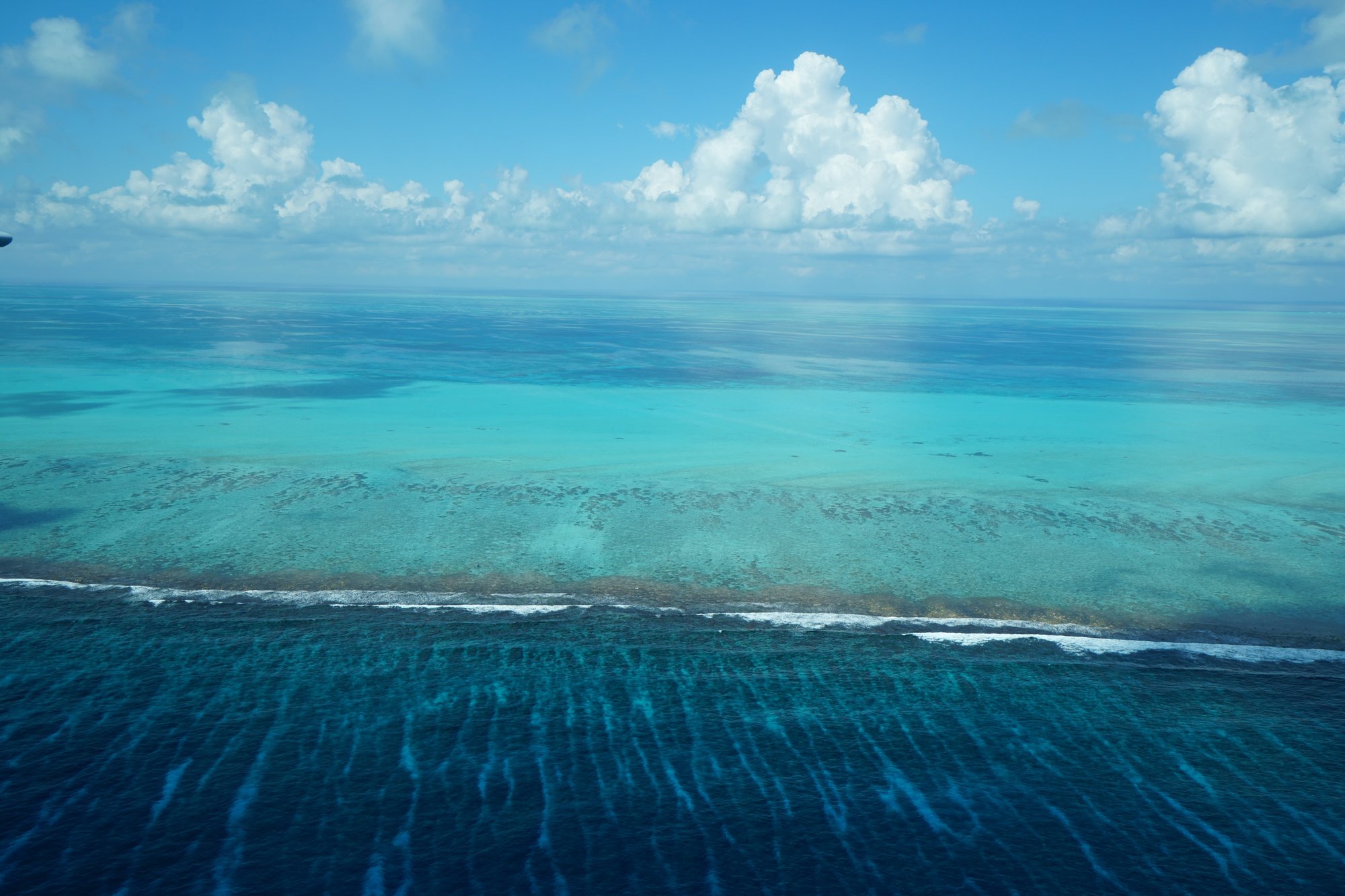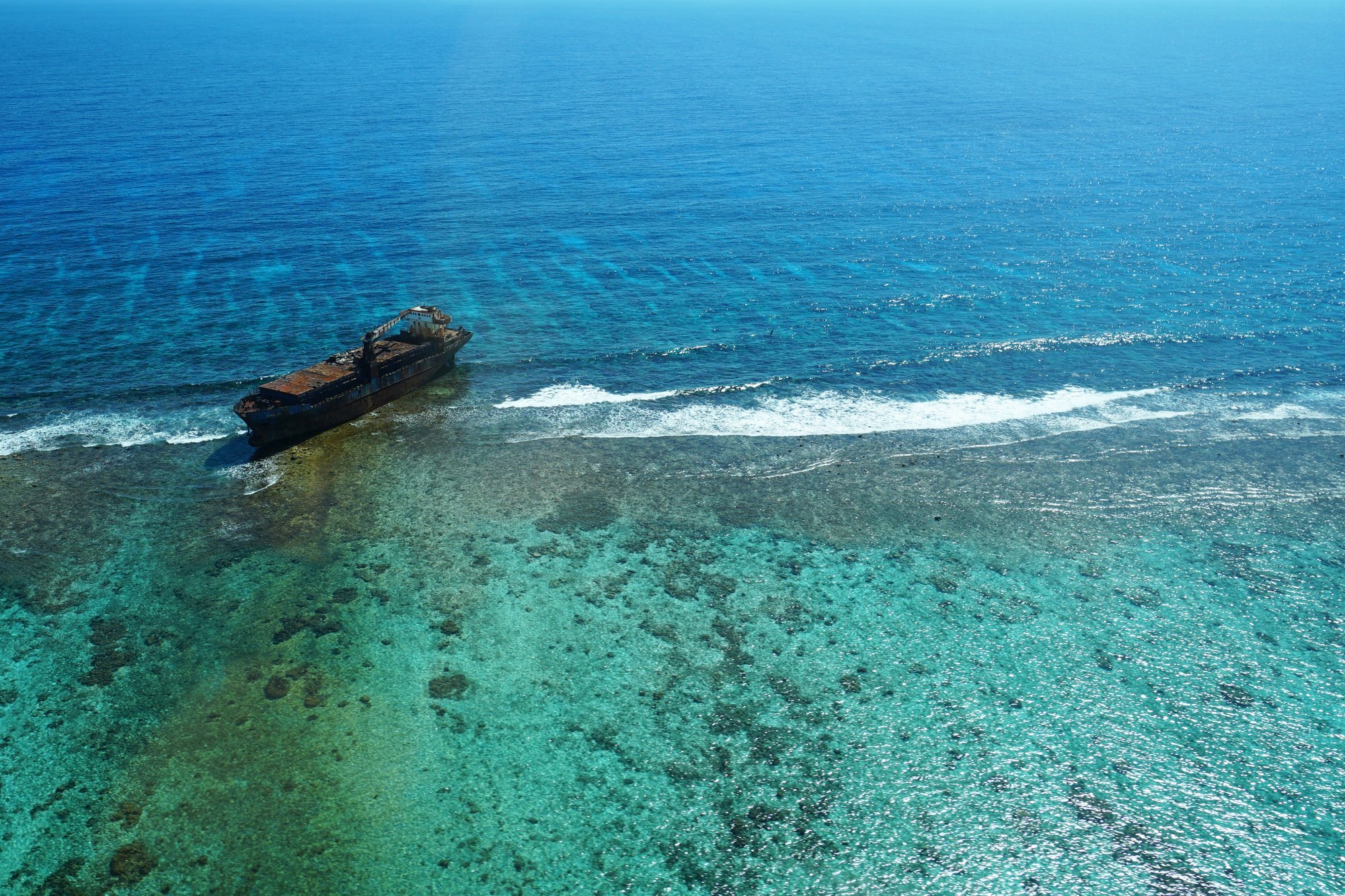 Na een kwartier cirkelen rondom de donkerblauwe cirkel vliegen we naar de volgende bezienswaardigheid: een oud scheepswrak dat is vastgelopen op het koraalrif. Het schip ziet bruin van de roest en steekt daarmee goed af tegen het blauwe water. Nog zo’n schitterende plek!