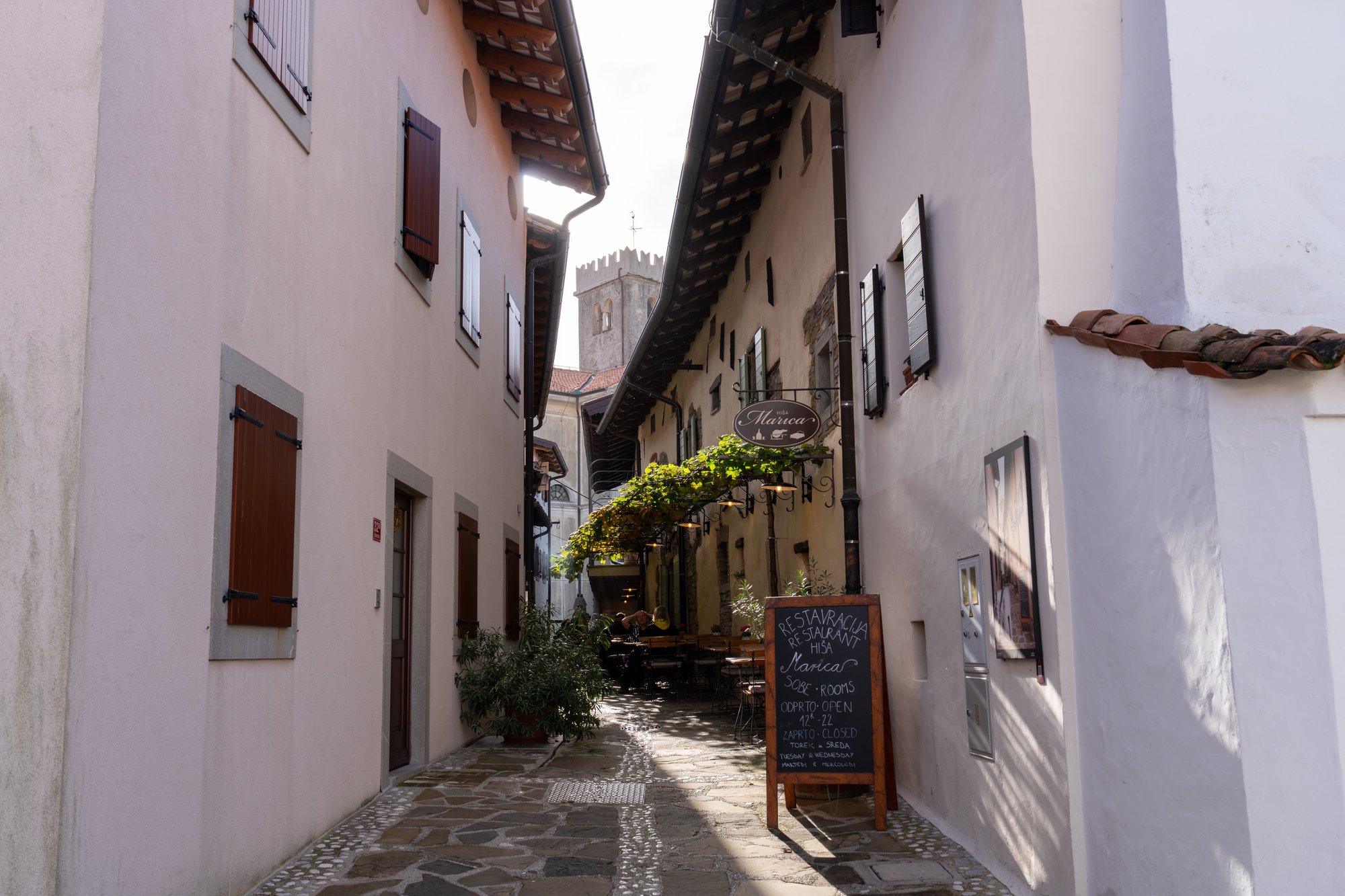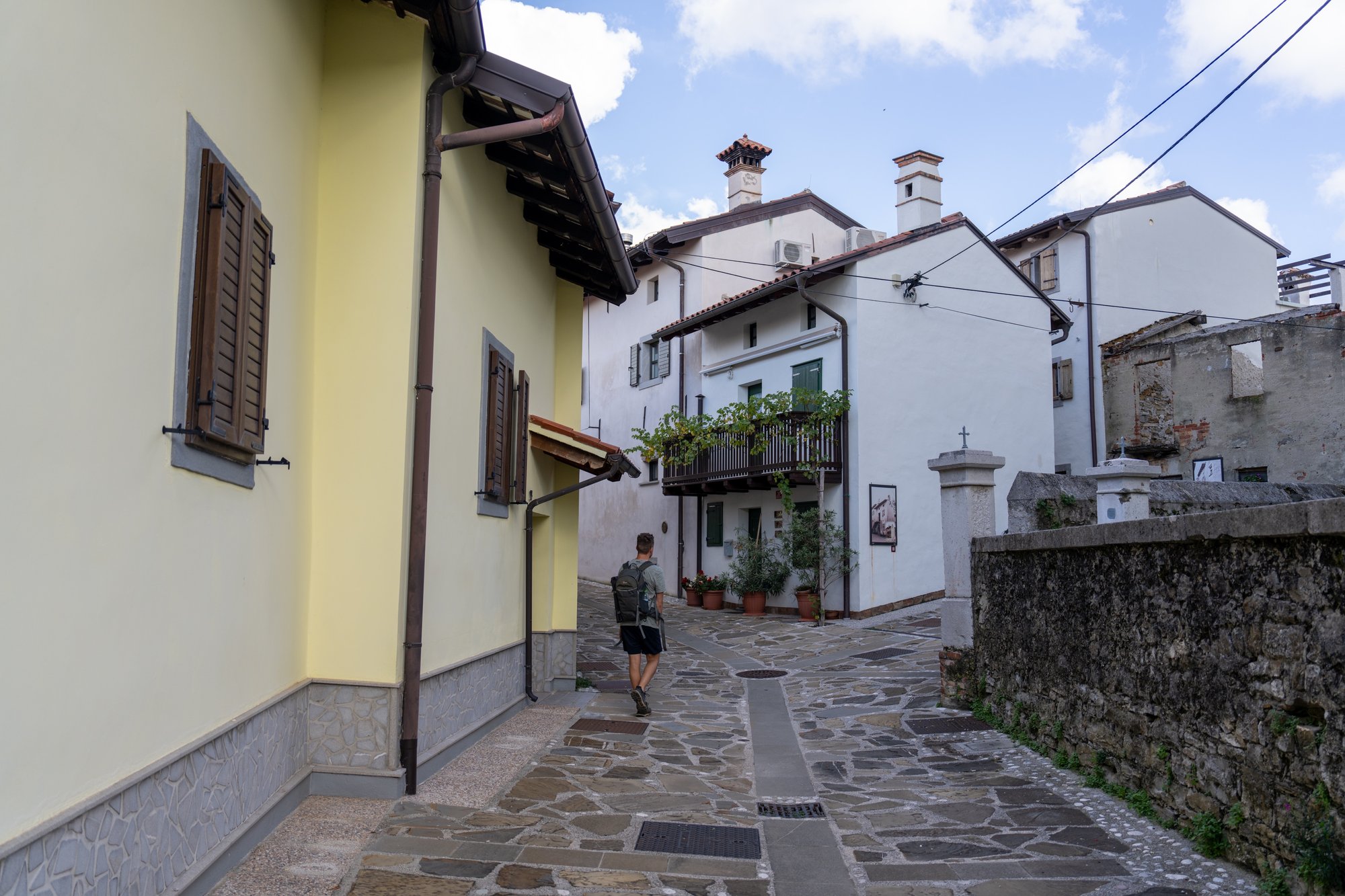 Maar voordat we deze wijnen proefden bij Sosolič, zijn we eerst via de wijngaarden naar het dorpje Šmartno gewandeld. Dit dorpje is precies wat ze altijd bedoelen als ze het hebben over ‘klein maar fijn’. Er zijn heel veel smalle straatjes en de oude bouwstijl maakt het dorp fotogeniek. Vanaf de rand van Šmartno heb je een mooi uitzicht op de omgeving.
