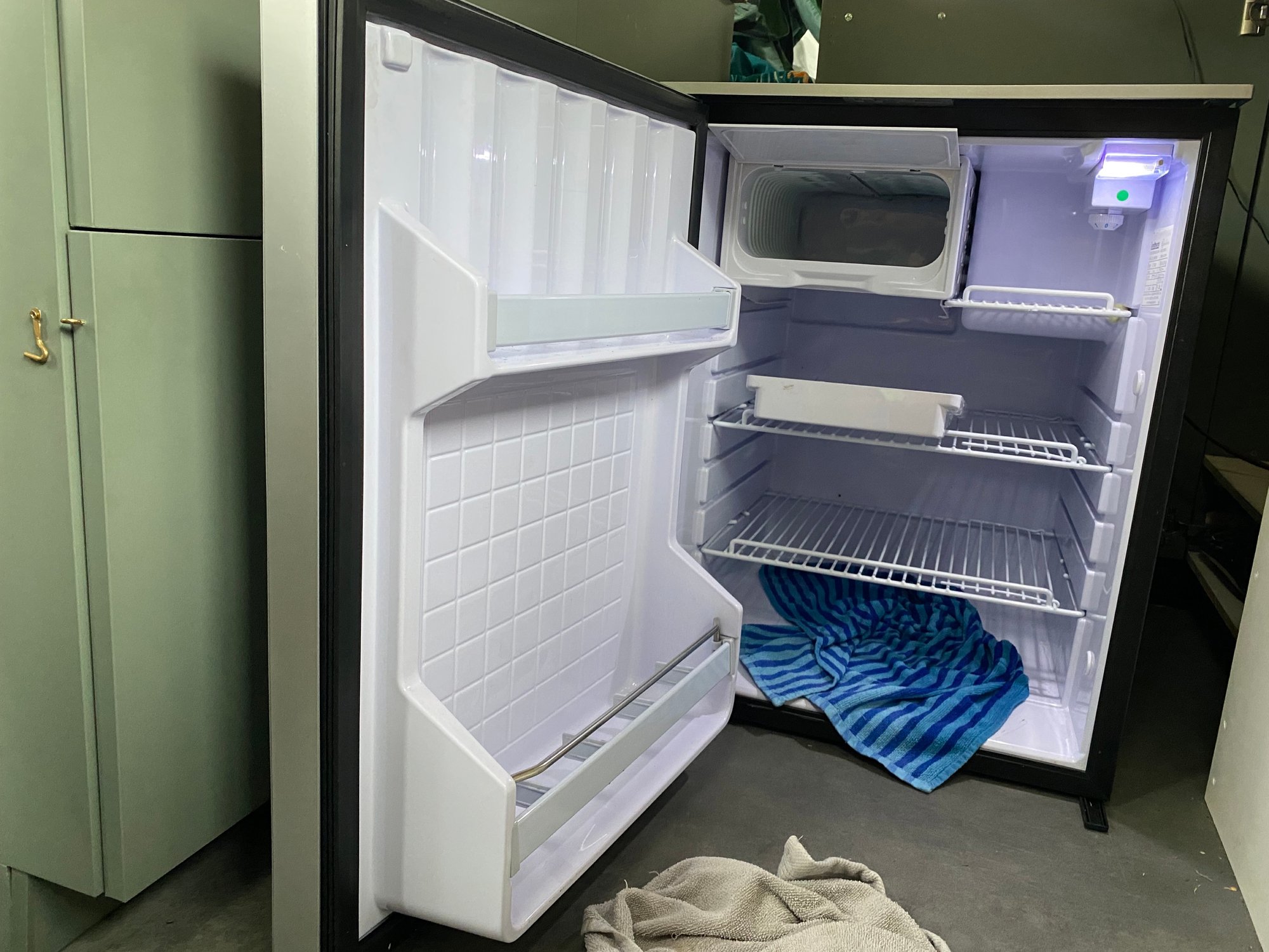 We pakken de koe gelijk bij de hoorns. Aan de slag! We hebben een speciale koeltas waar we de injecties tijdelijk goed in kunnen bewaren en we staan op een camping, waardoor we ook de algemene koelkast van hen kunnen gebruiken als back up. We zetten de koelkast uit, laten hem ontdooien en zetten hem weer aan. Ook fixt Ronny de koelkastdeur, die sluit weer helemaal netjes. Tada, probleem opgelost! Hij koelt weer als een malle!